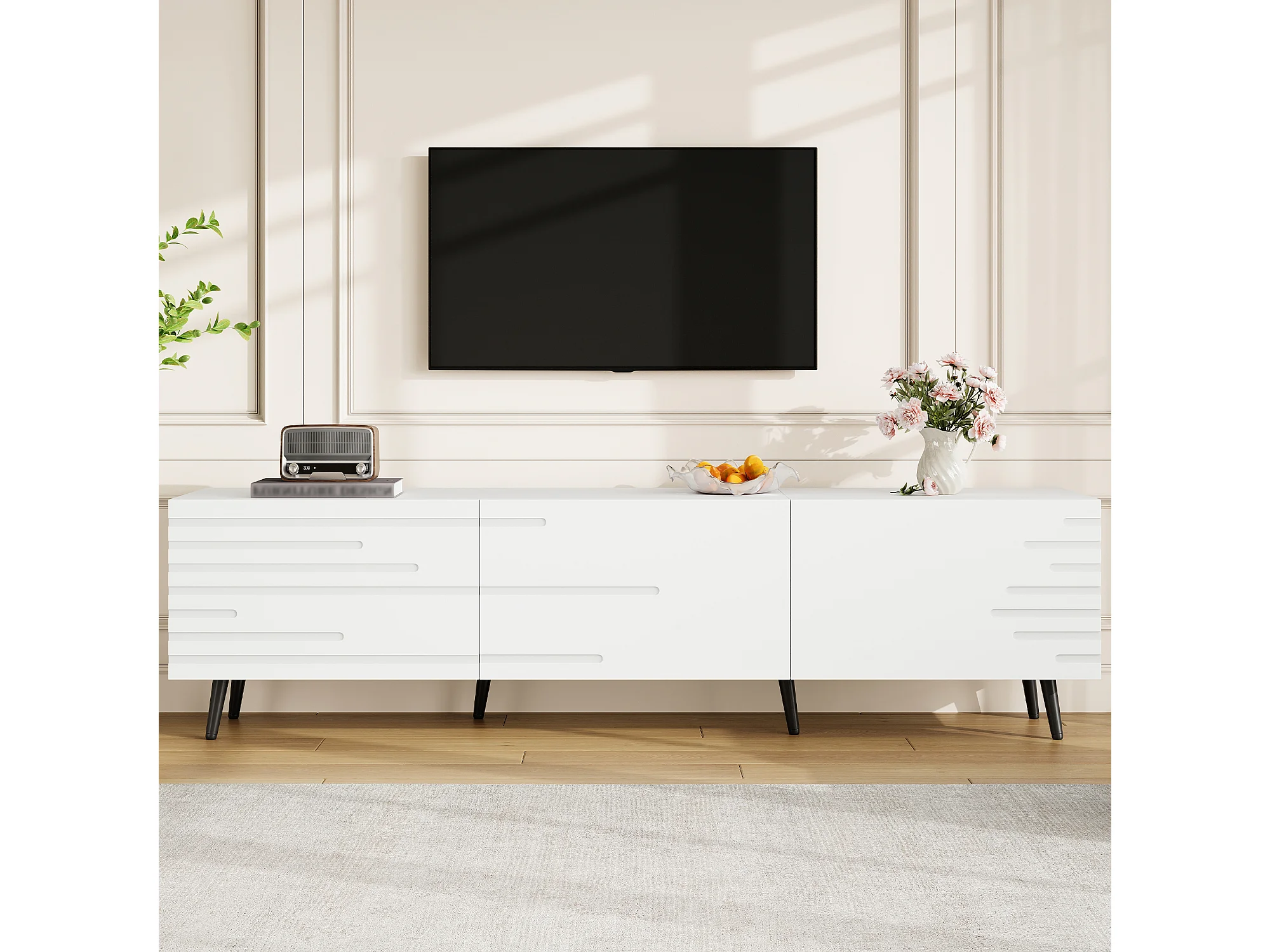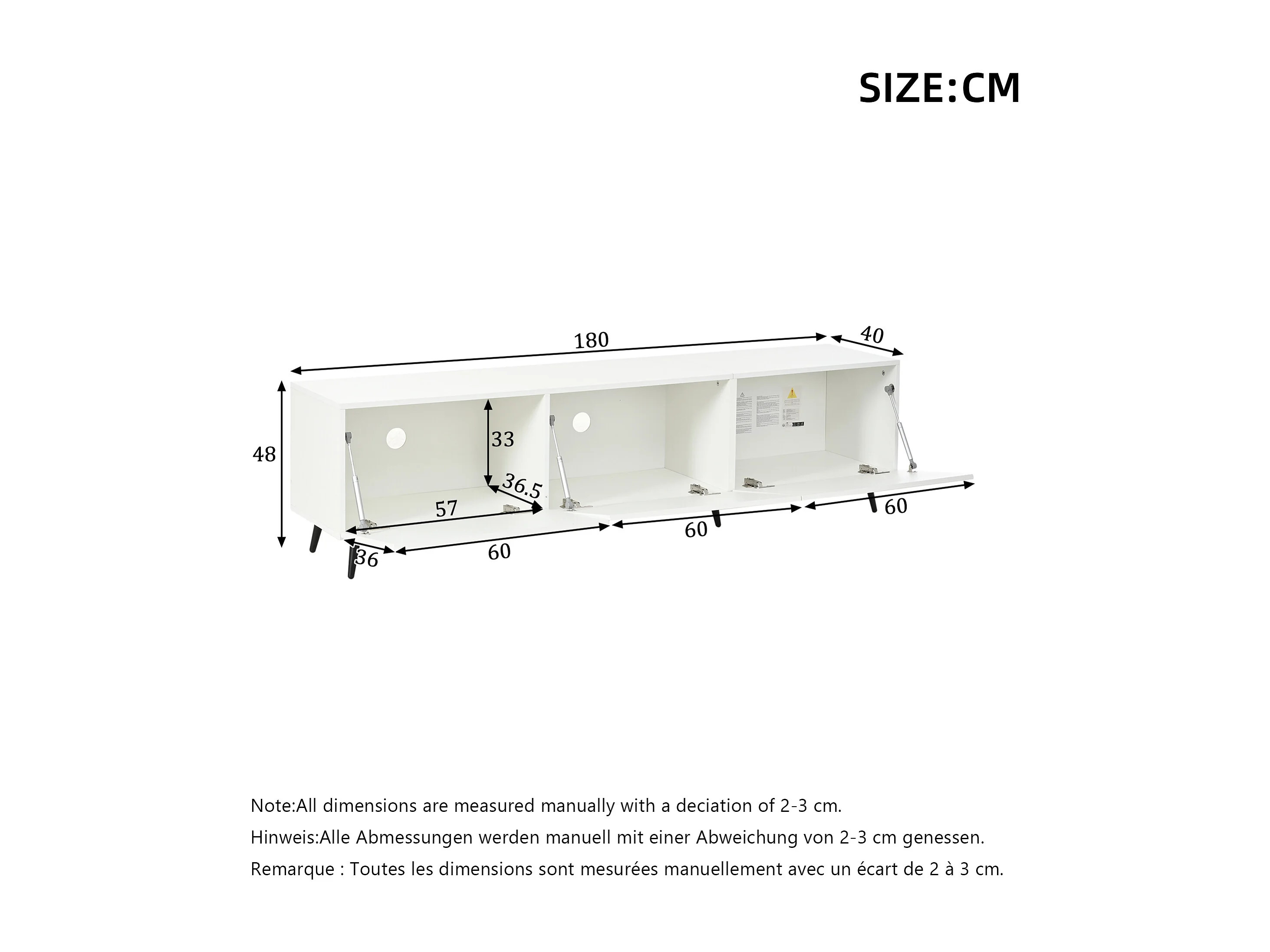 TV-Schrank 180x40x48 cm - 3 Klapptüren - 6 Füße - Geeignet für TV bis zu 80 Zoll - MDF - Weiß