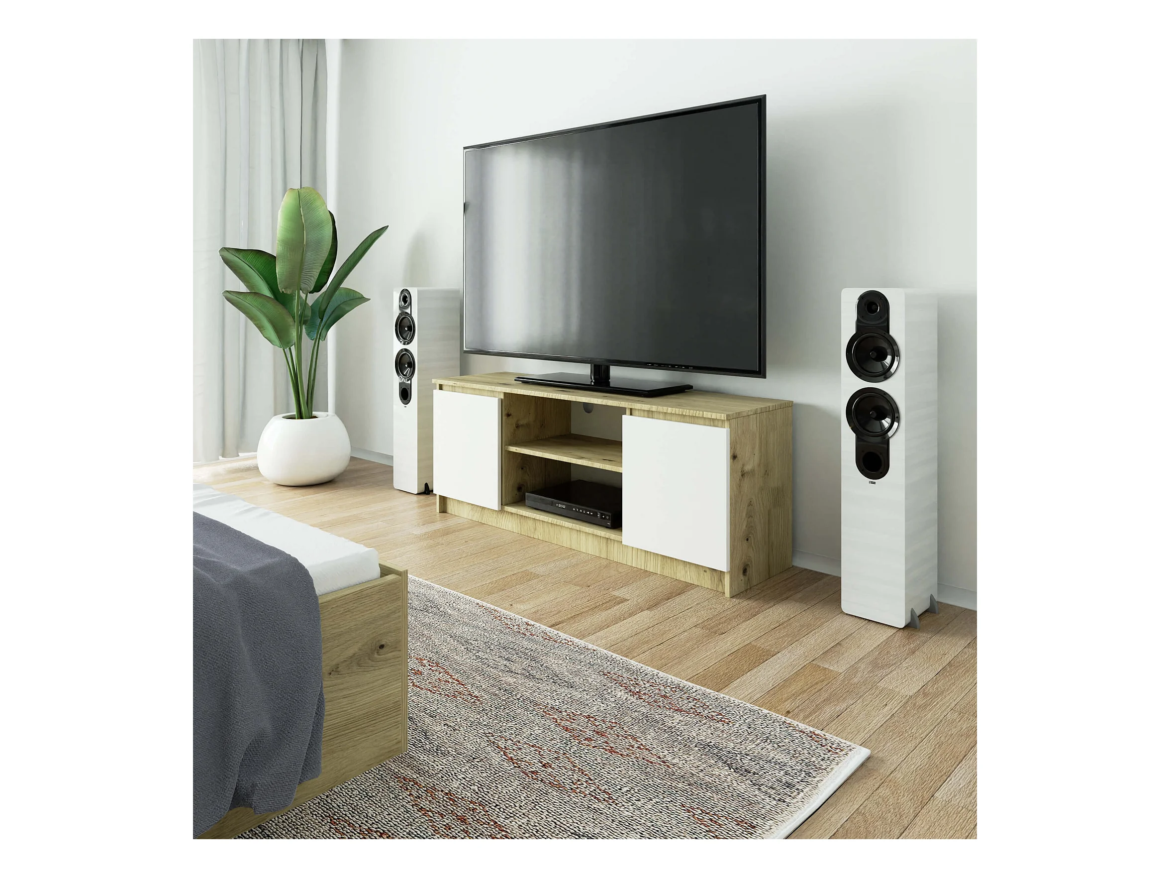 TV Schrank AKORD Fernsehkommode 140 cm Eiche Artisan 2 Türen 2 Ebenen Front Weiß B140 x H55 x T40 cm