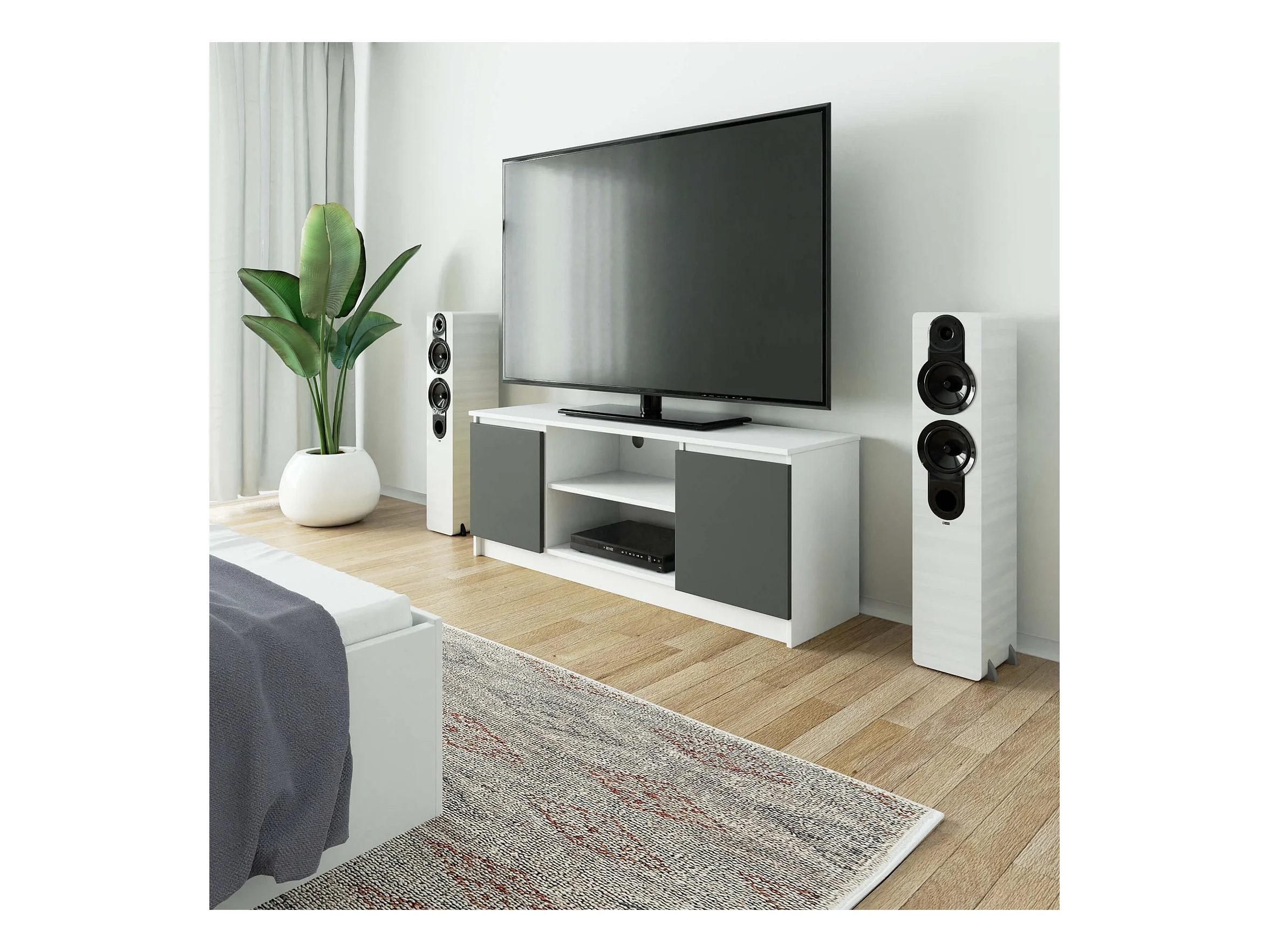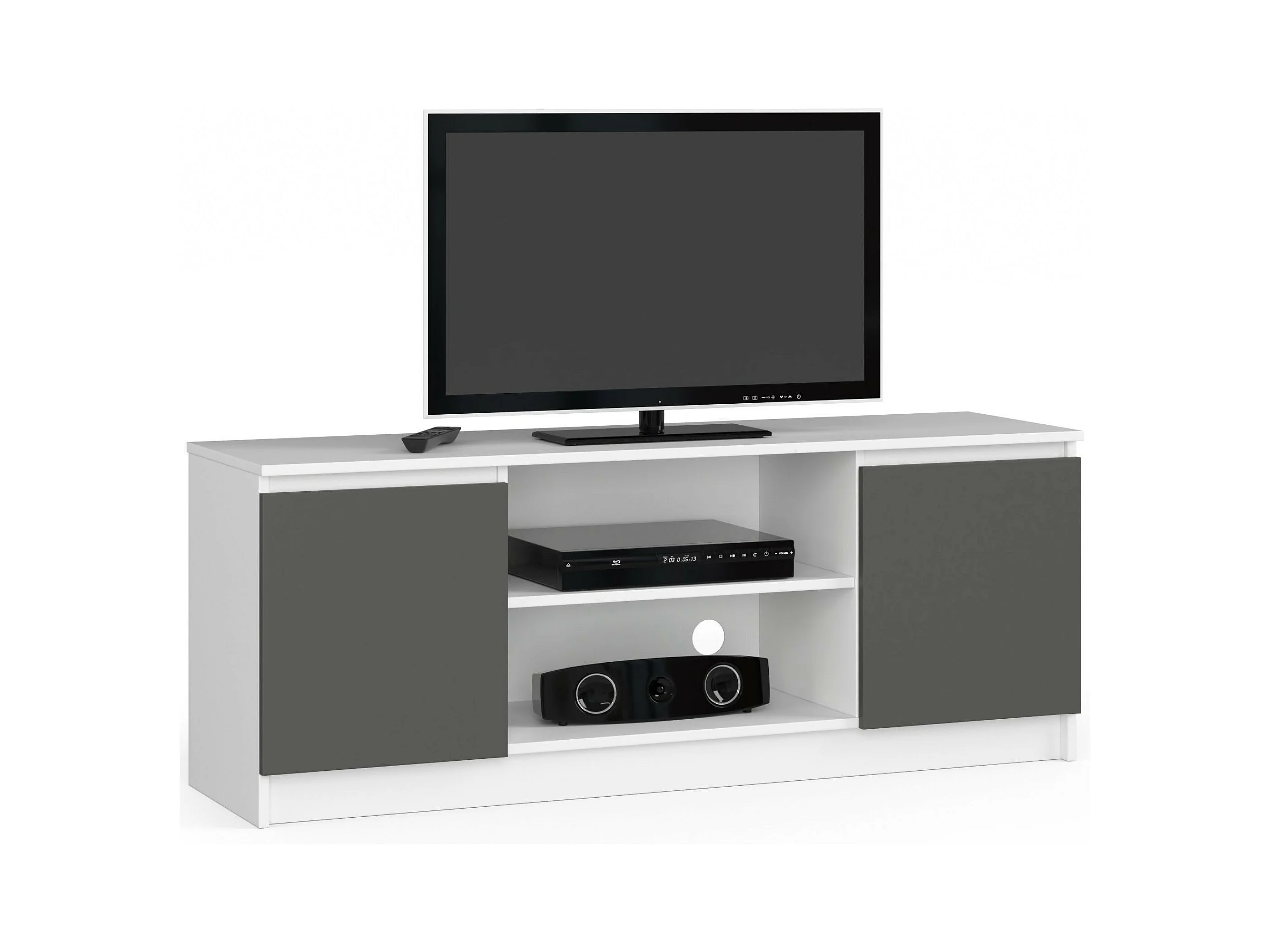 TV Schrank AKORD Fernsehkommode 140 cm Weiß 2 Türen 2 Ebenen Front Graphitgrau B140 x H55 x T40 cm