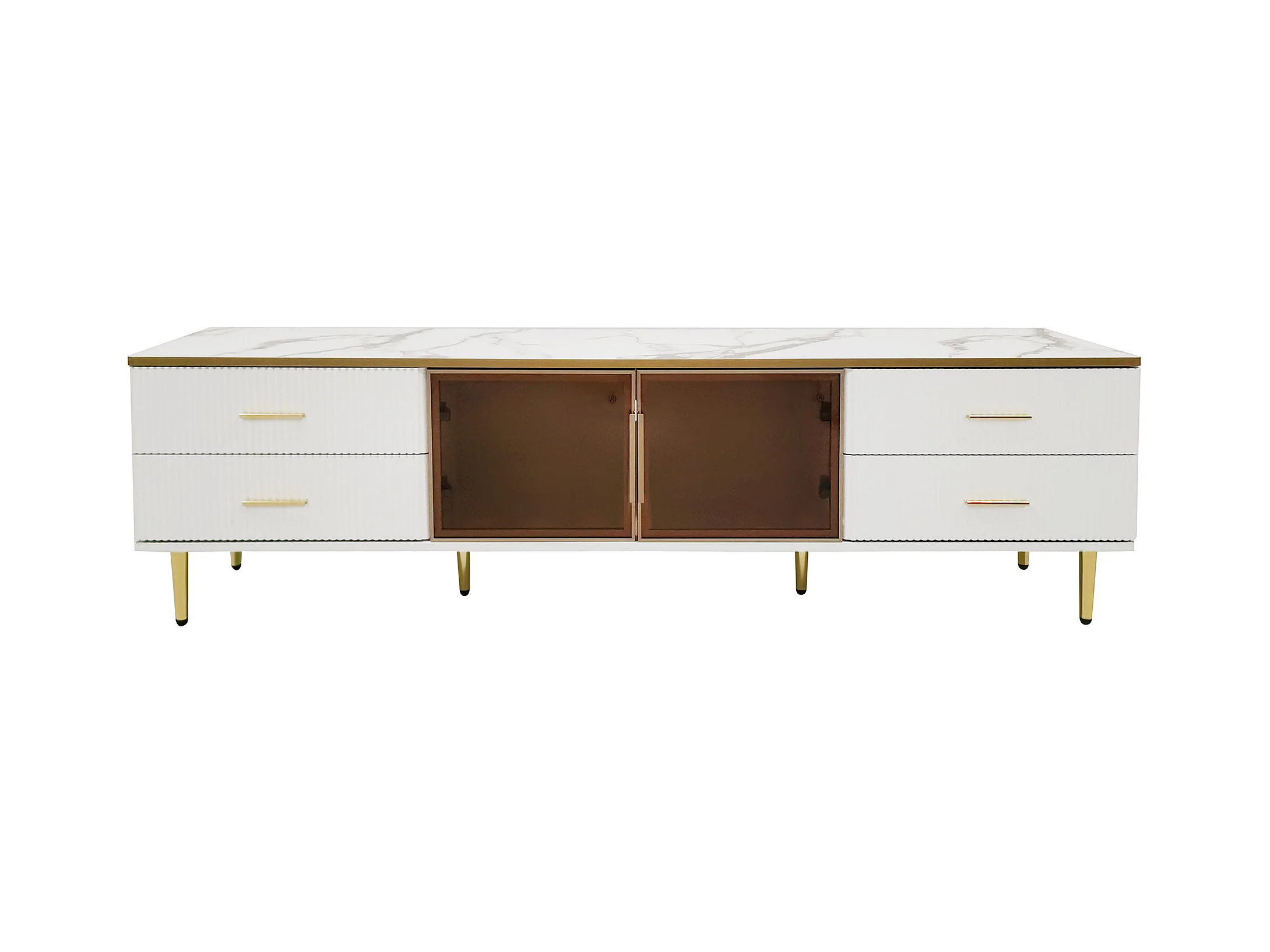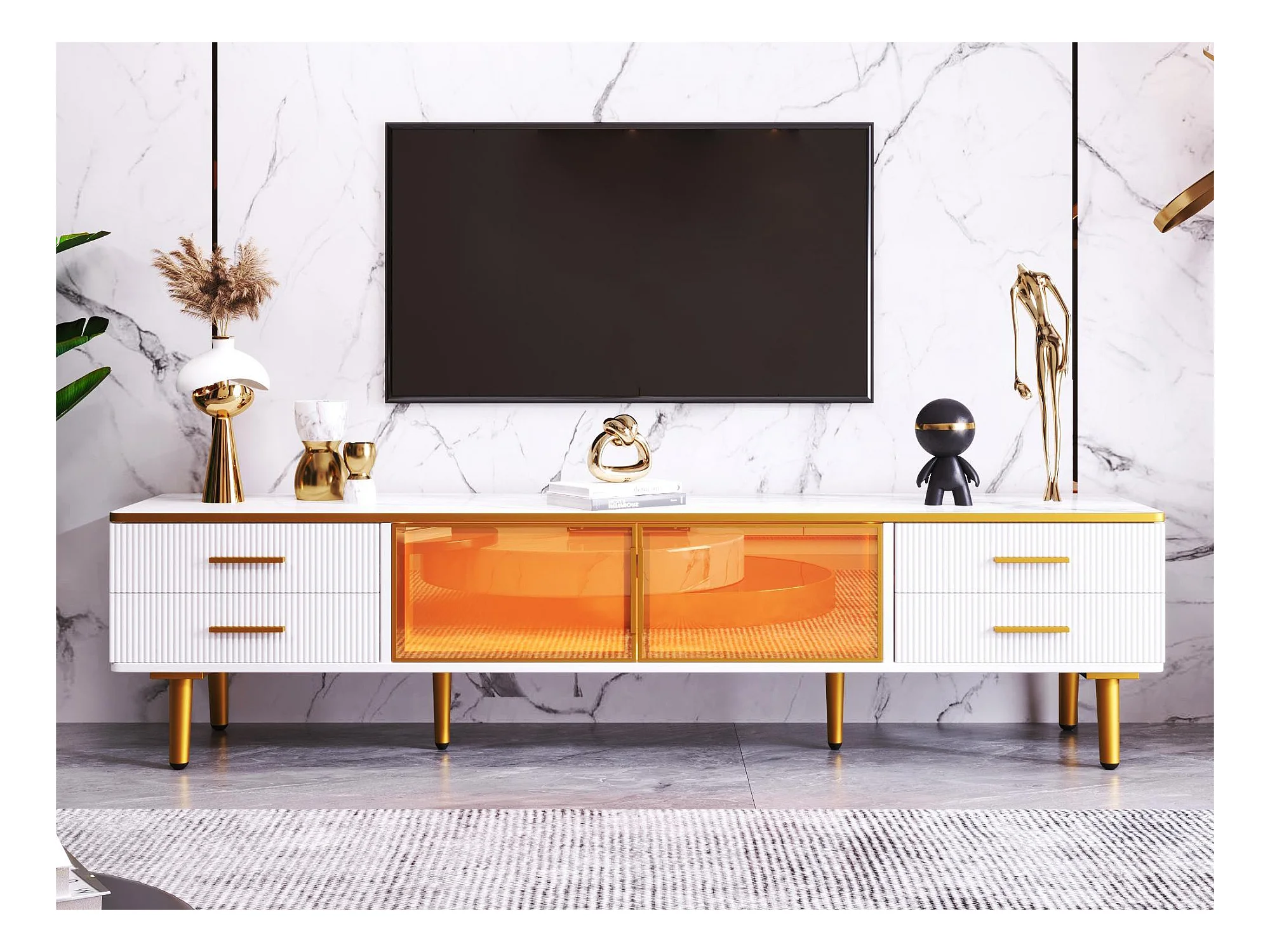 TV-Schrank für Wohnzimmer mit 2 Türen und 4 Schubladen – LEDs – Marmoroptik – braunes Glas und goldenes Metall – Weiß