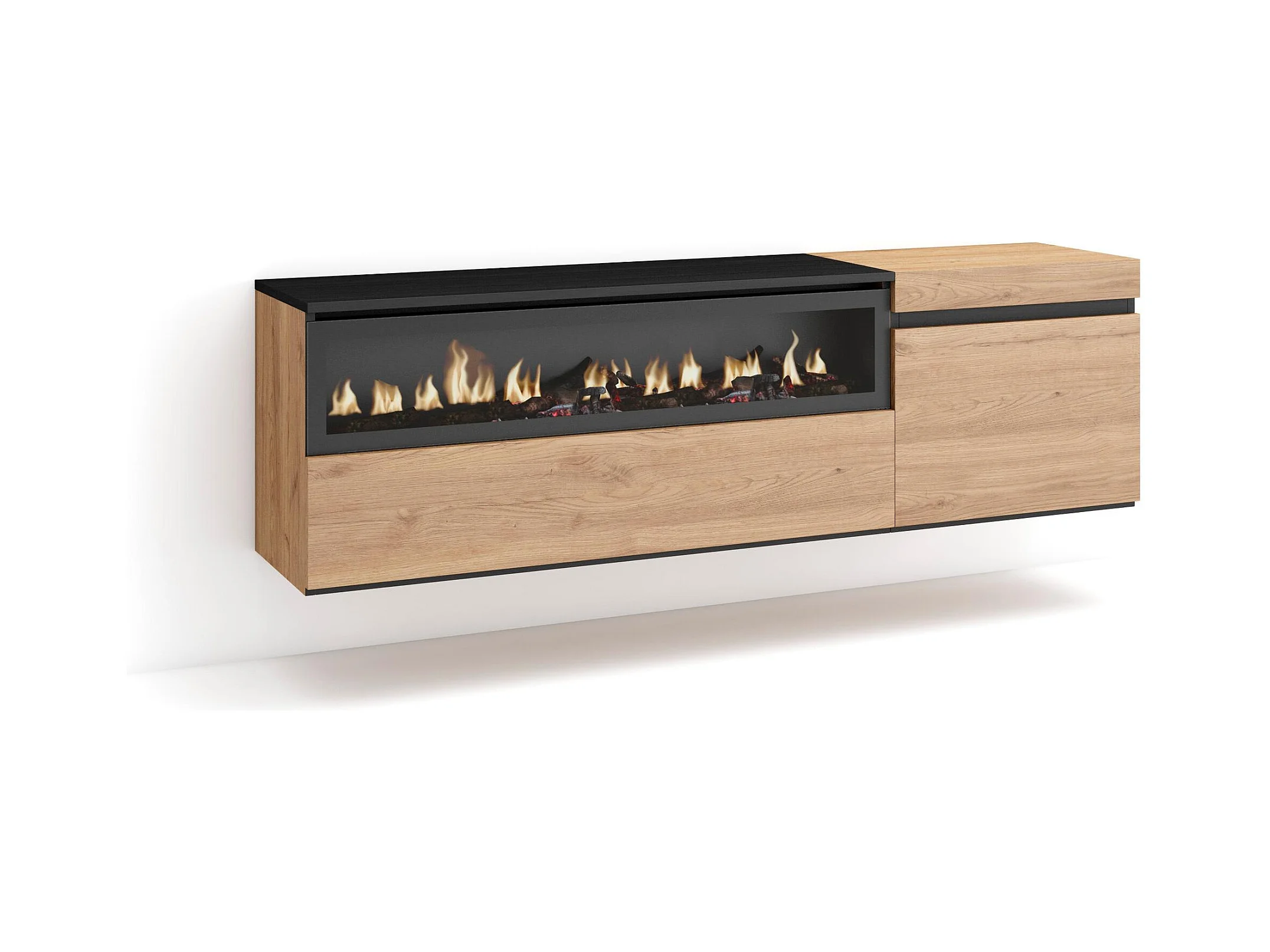TV-Schrank, Lowboard, 150x35x45cm, Für TV-Geräte bis zu 65", Elektrokamin, Hängend, Eiche Schwarz