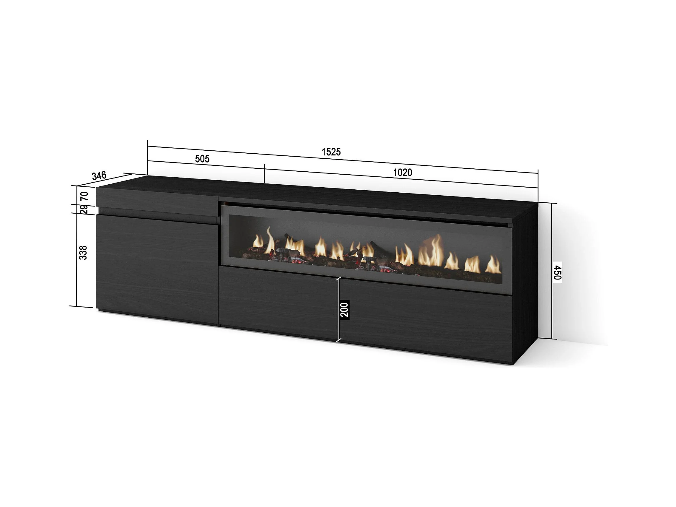 TV-Schrank, Lowboard, 150x35x45cm, Für TV-Geräte bis zu 65", Elektrokamin, Schwarz
