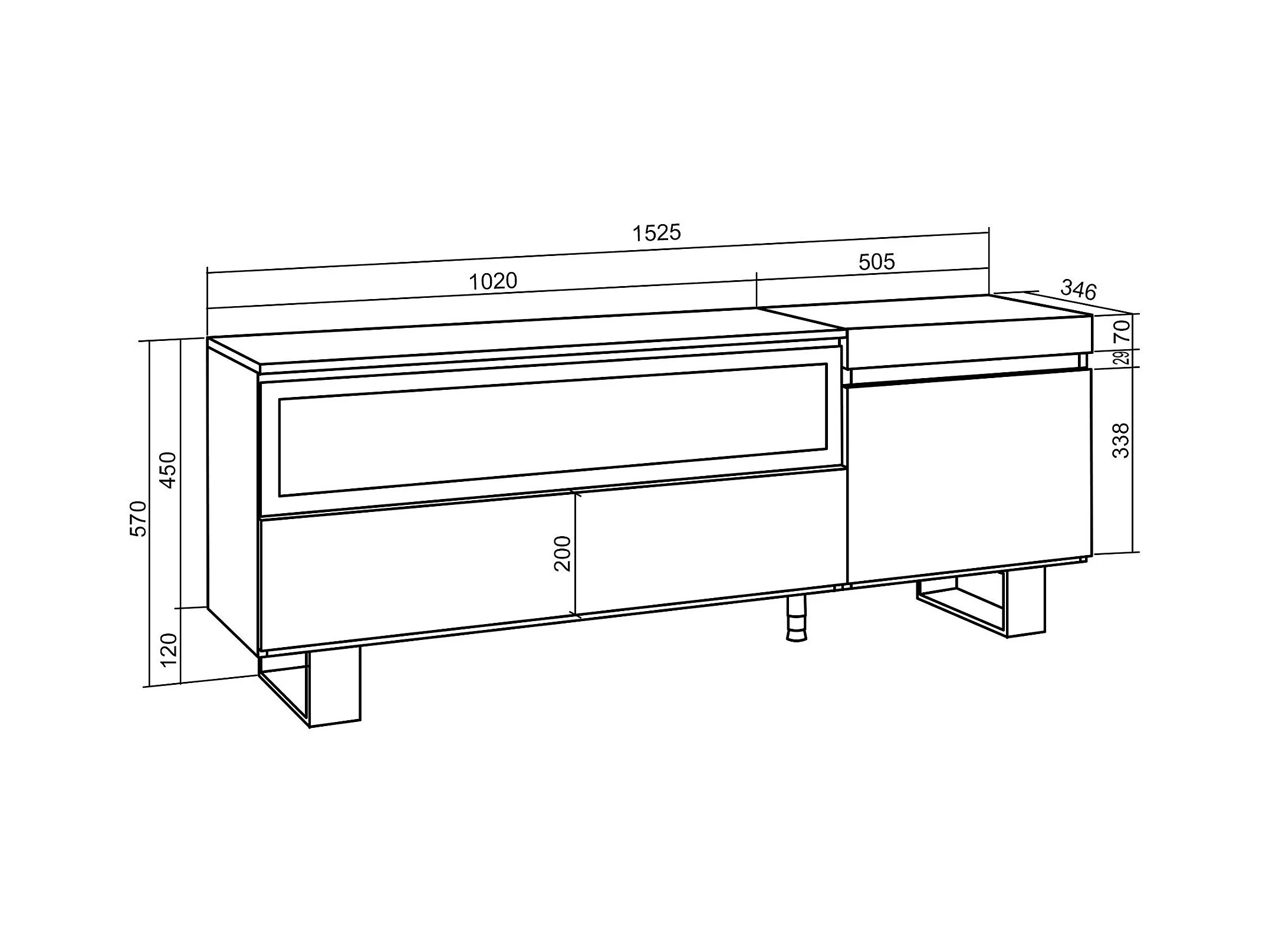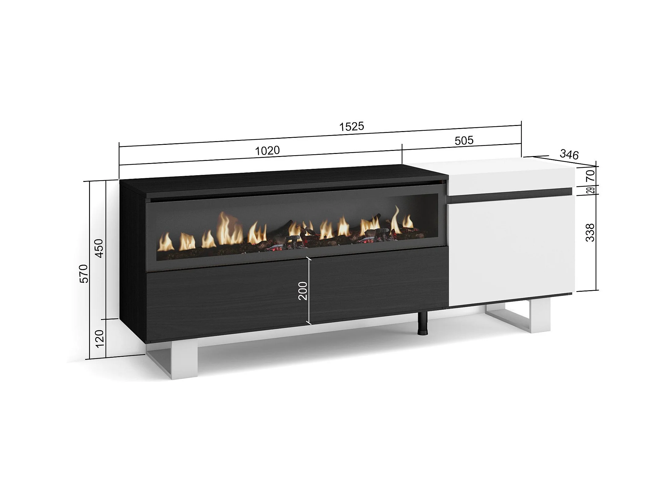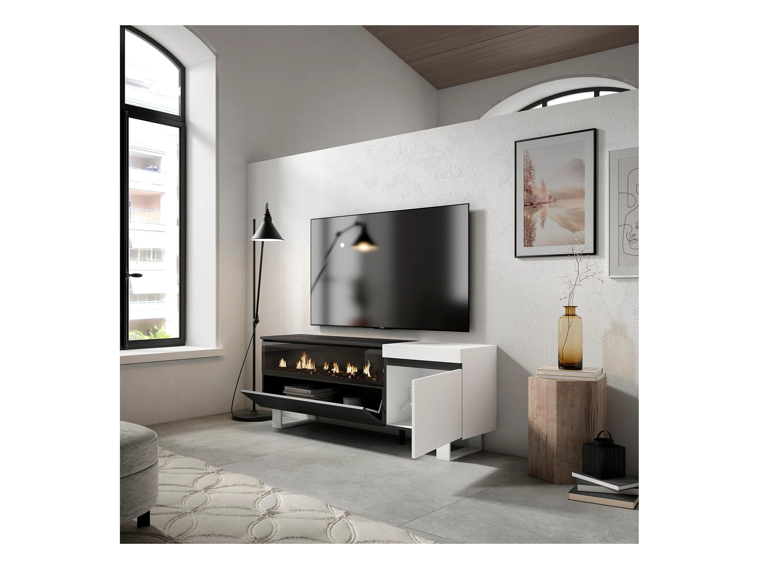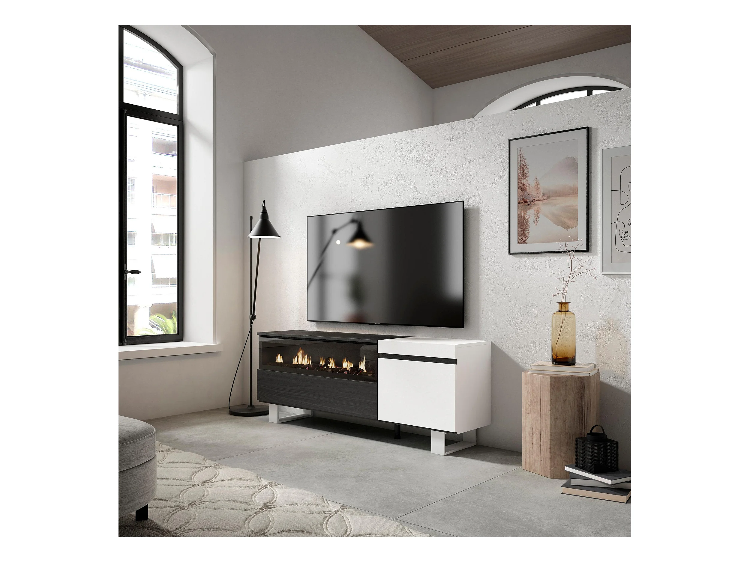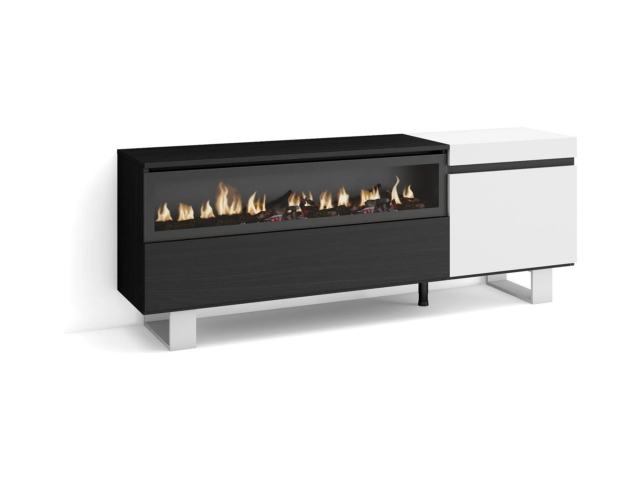 TV-Schrank, Lowboard, 150x35x57cm, Für TV-Geräte bis zu 65", Elektrokamin. , Industriedesign, Weiß und Schwarz