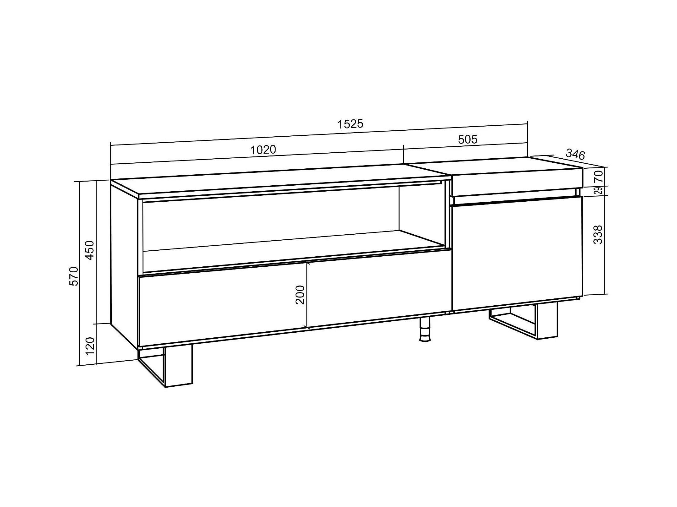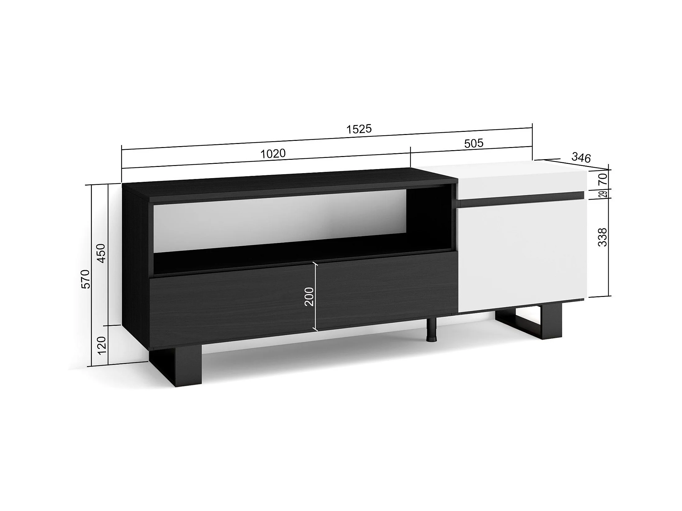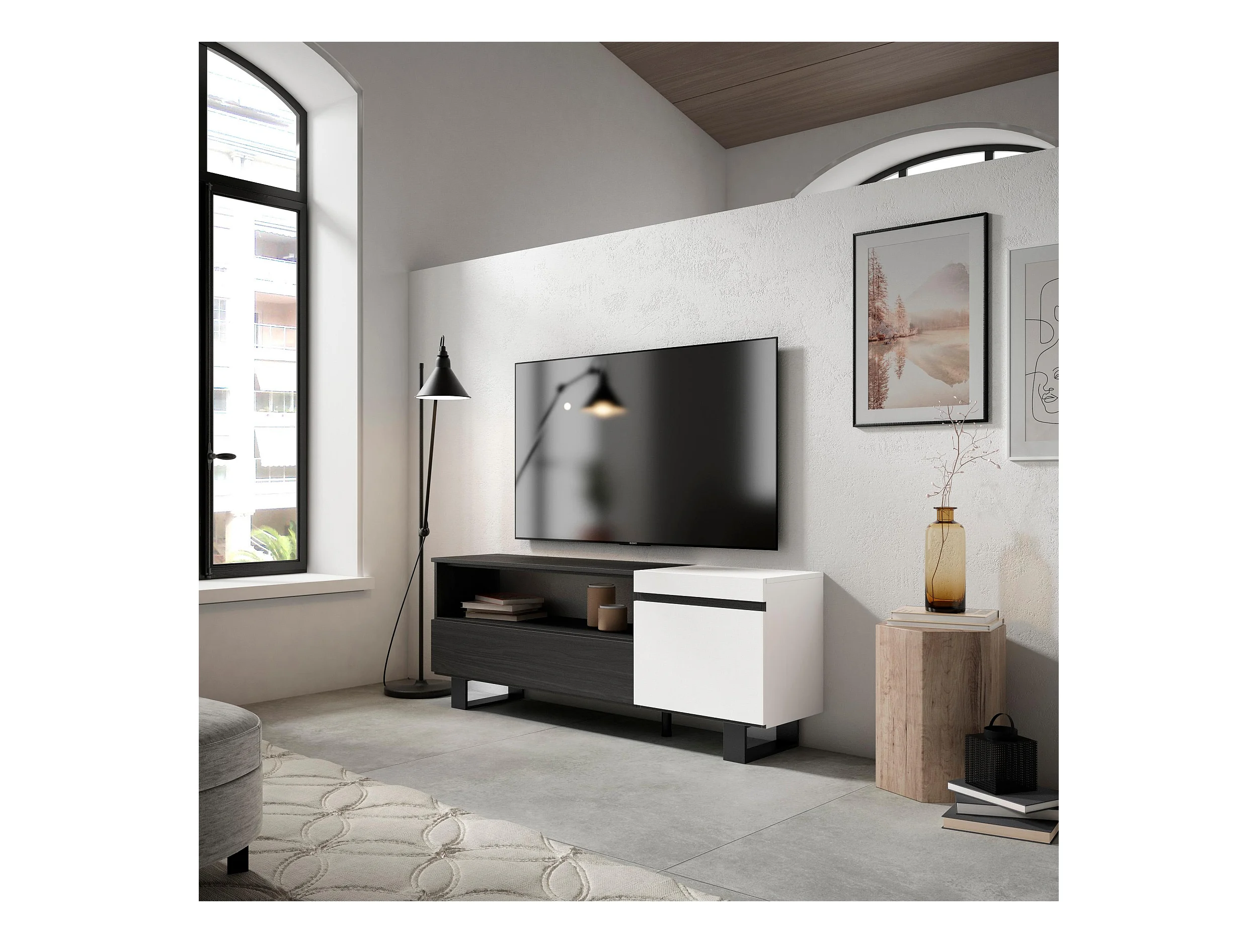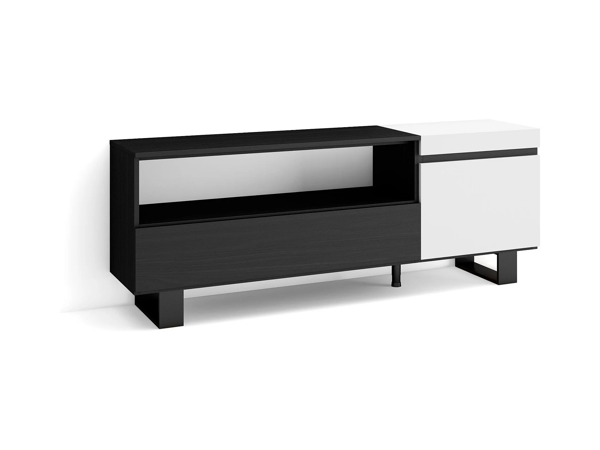 TV-Schrank, Lowboard, 150x35x57cm, Für TV-Geräte bis zu 65", Industriedesign, Weiß und Schwarz