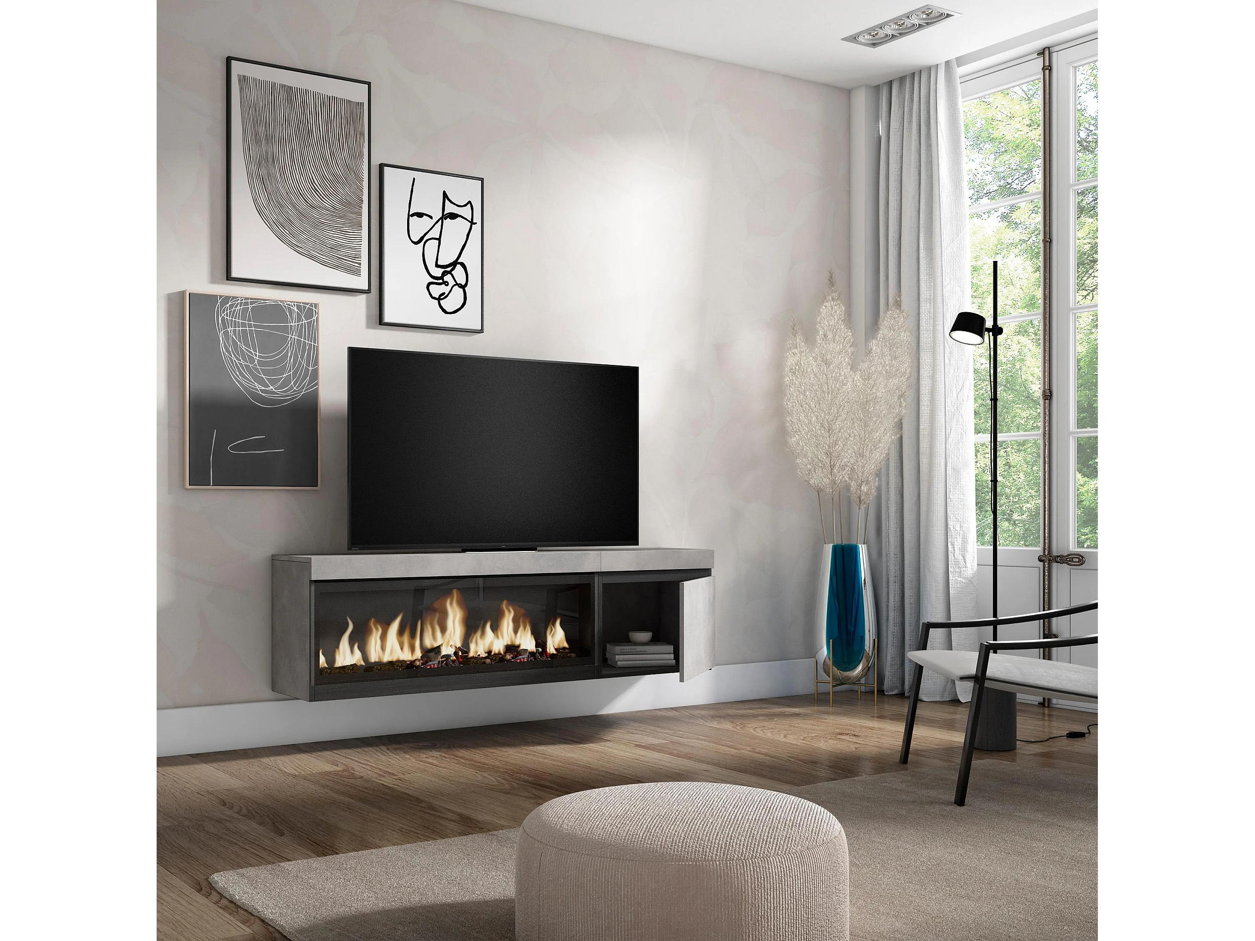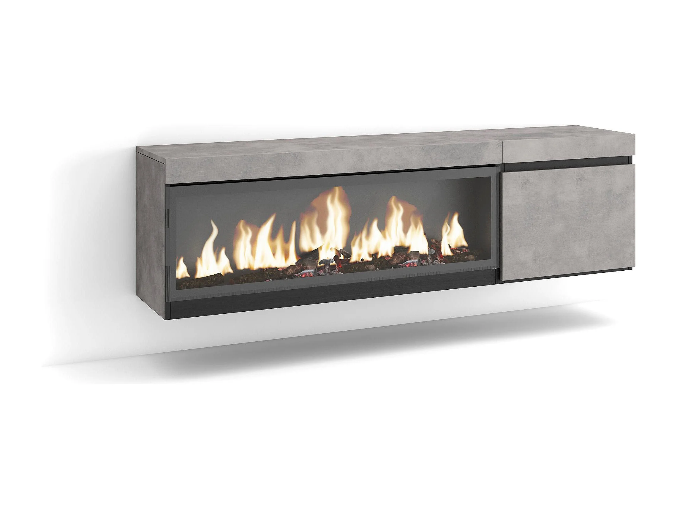 TV-Schrank, Lowboard, 158x35x45cm, Für TV-Geräte bis zu 65", Elektrokamin XXL, Hängend, Zement
