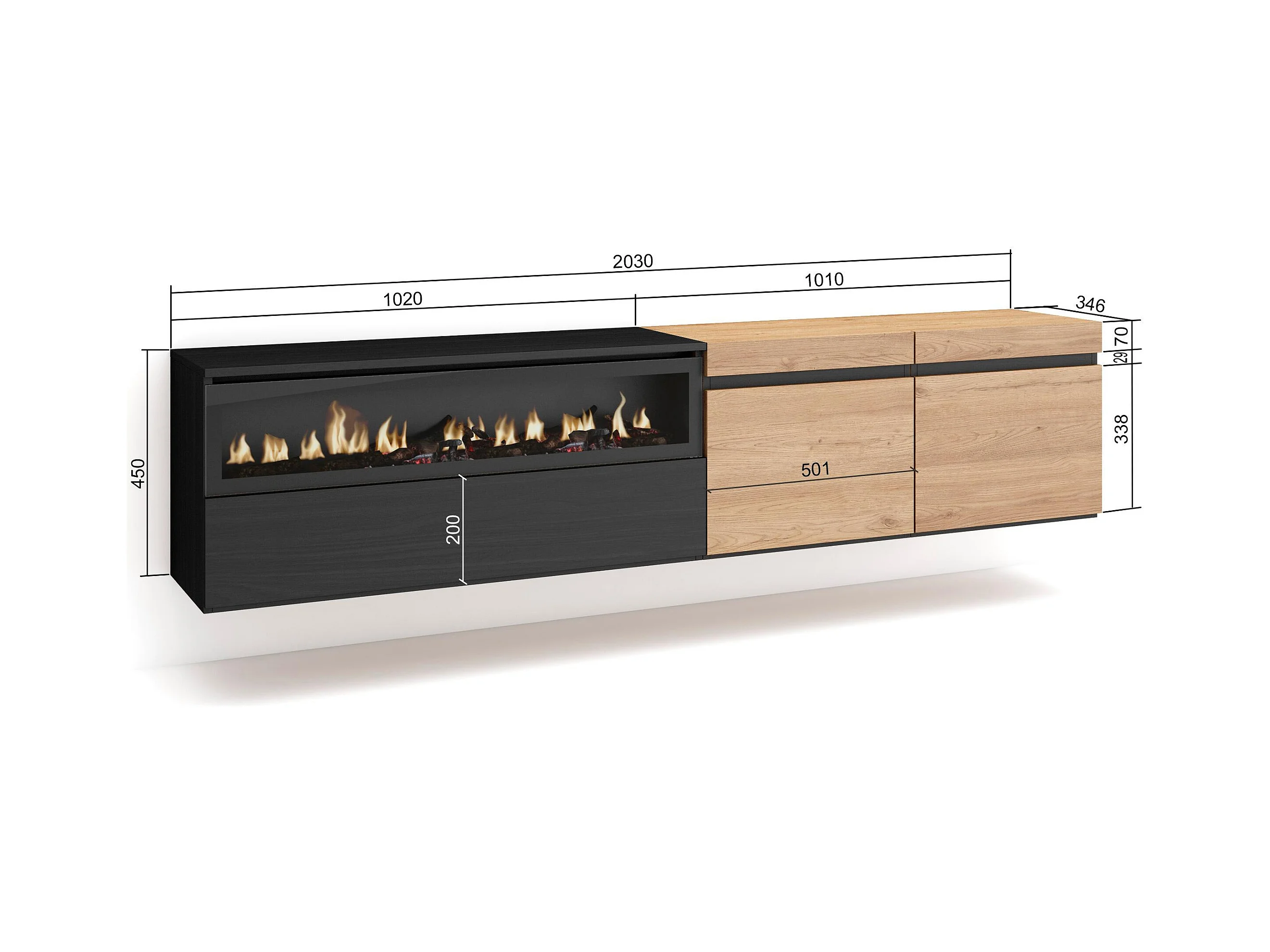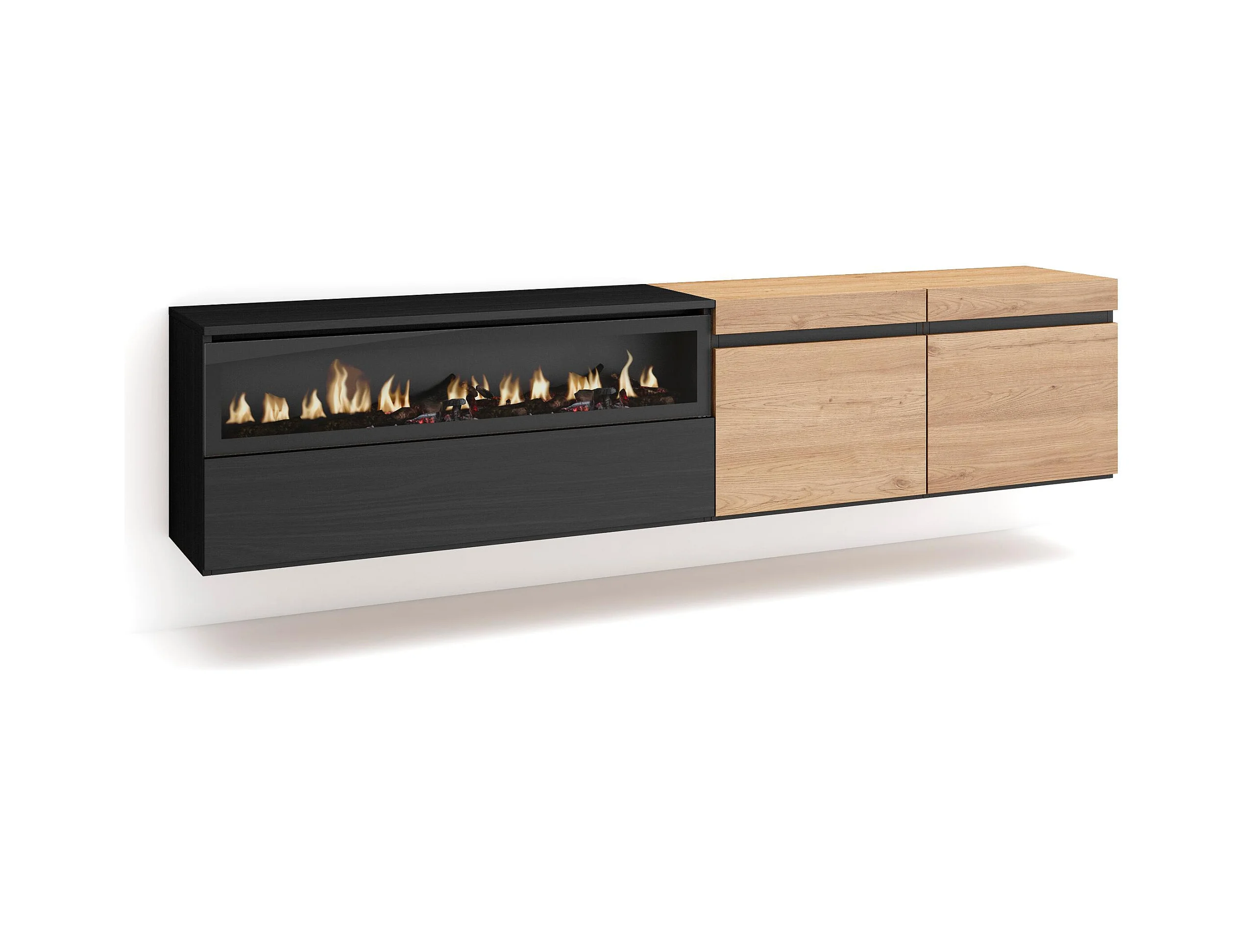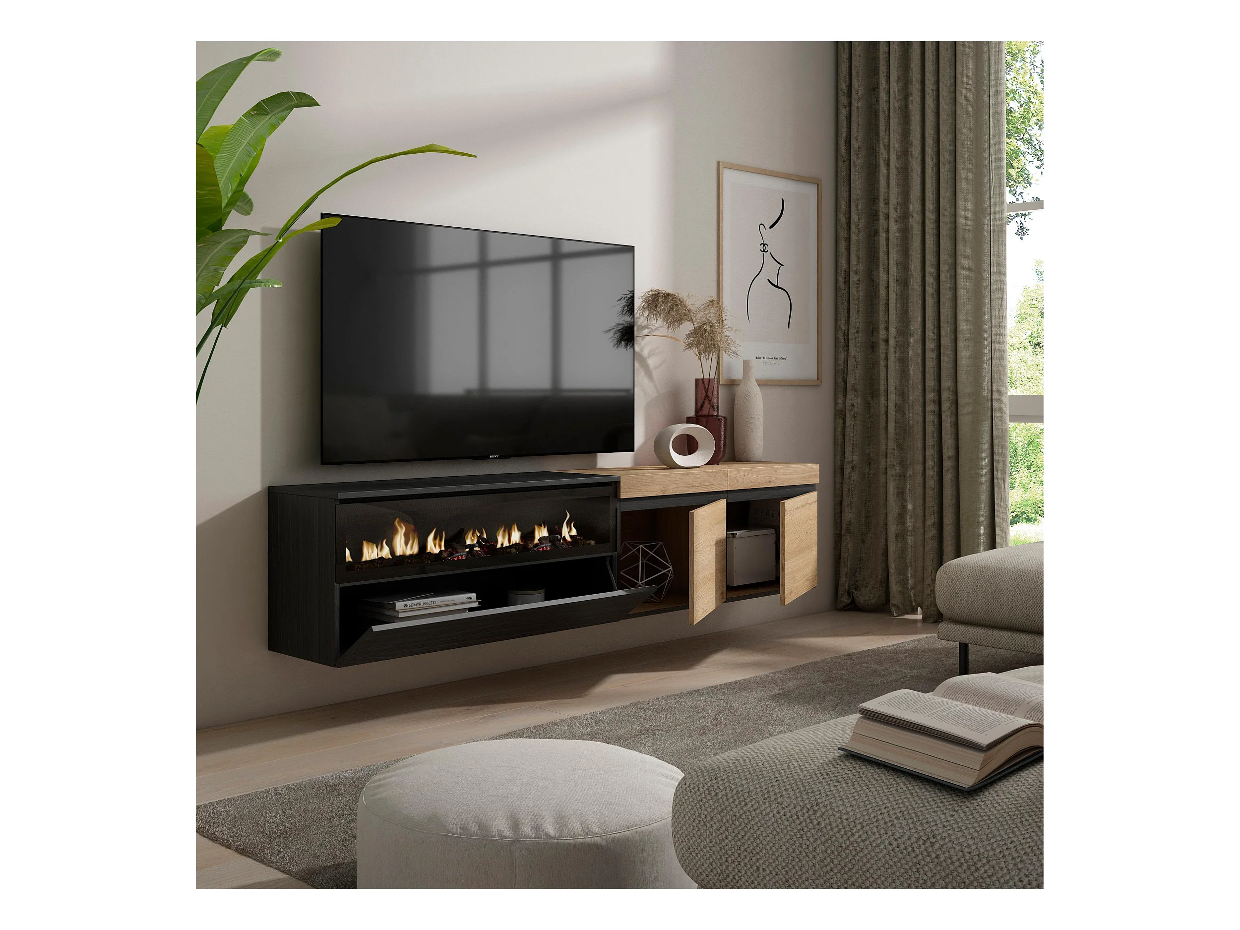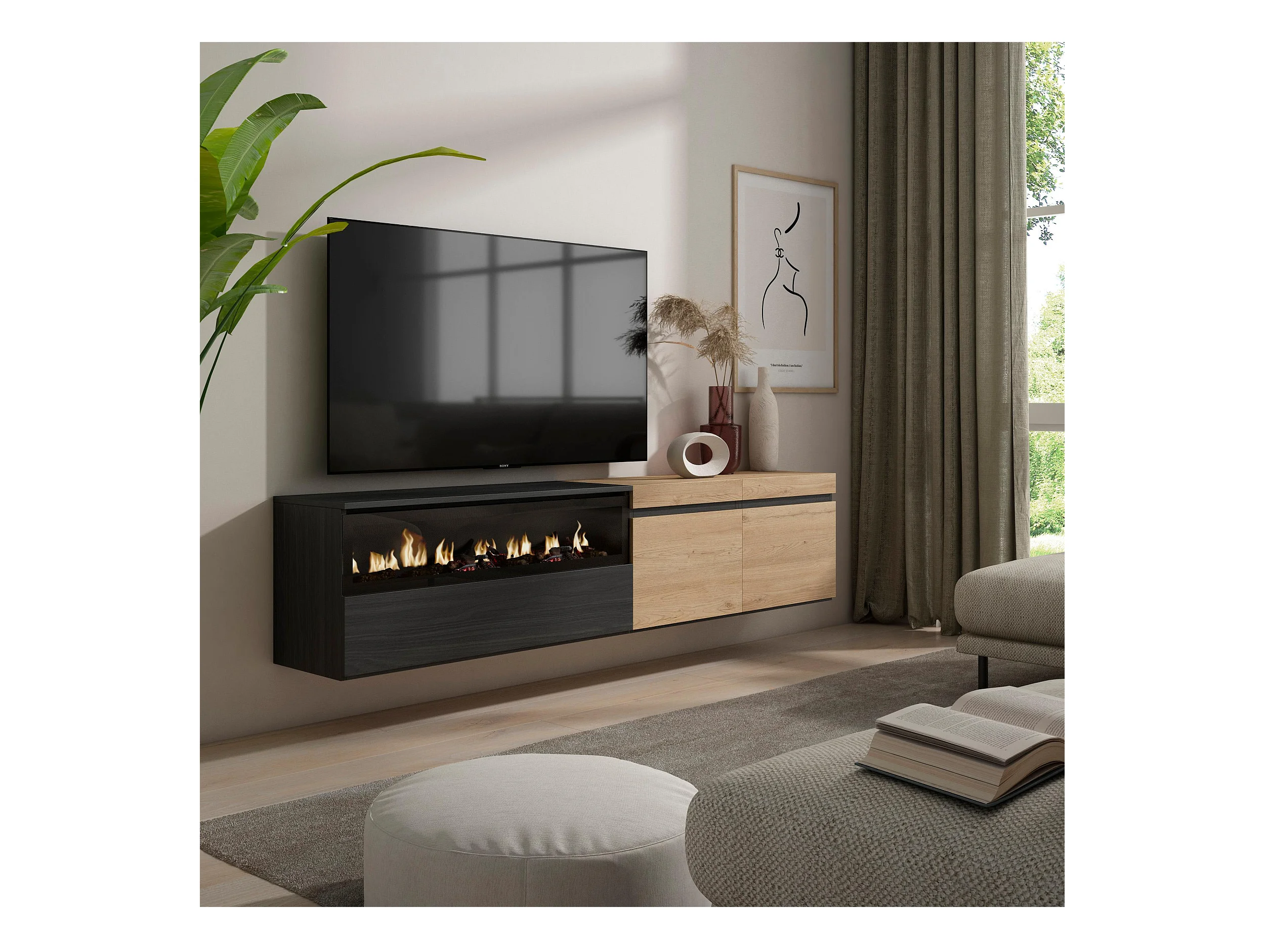 TV-Schrank, Lowboard, 200x35x45cm, Für TV-Geräte bis zu 80", Elektrokamin, Hängend, Eiche Schwarz
