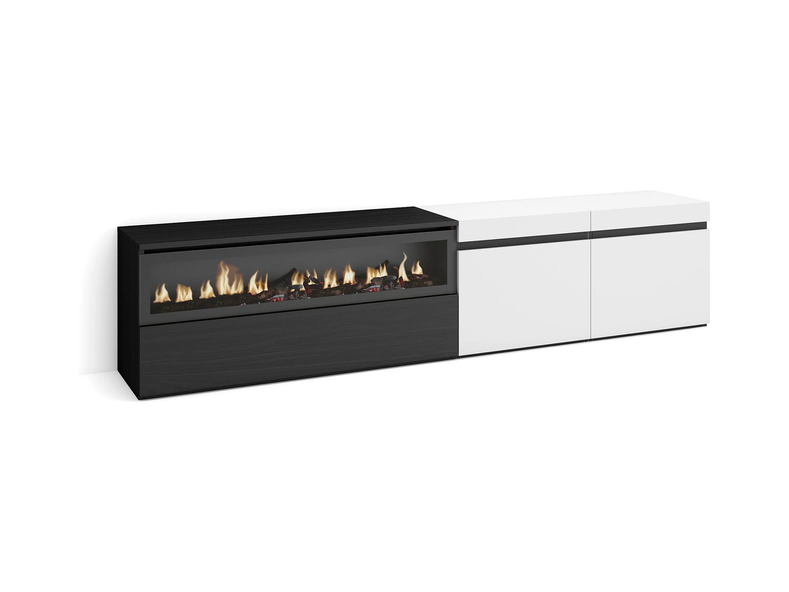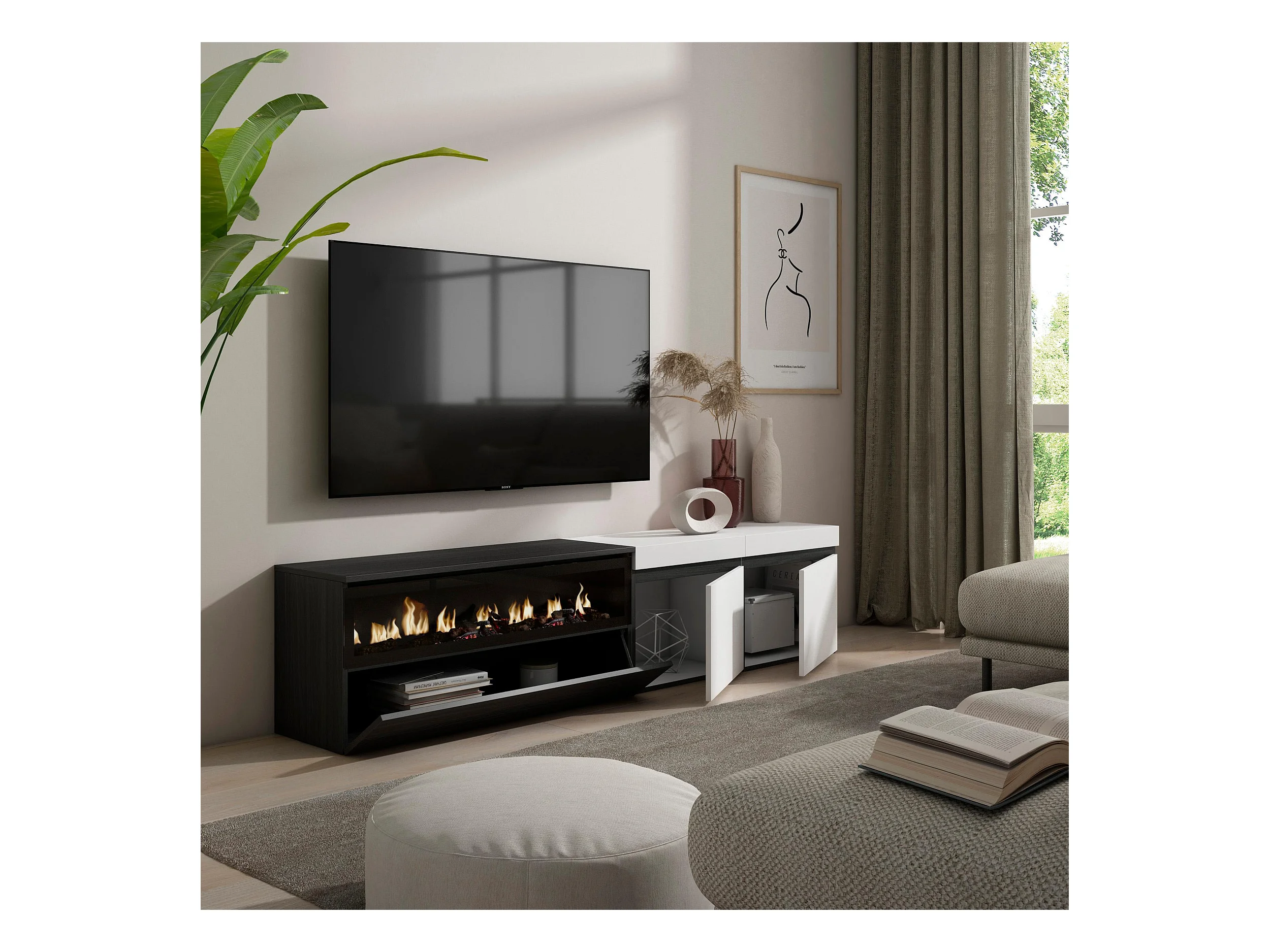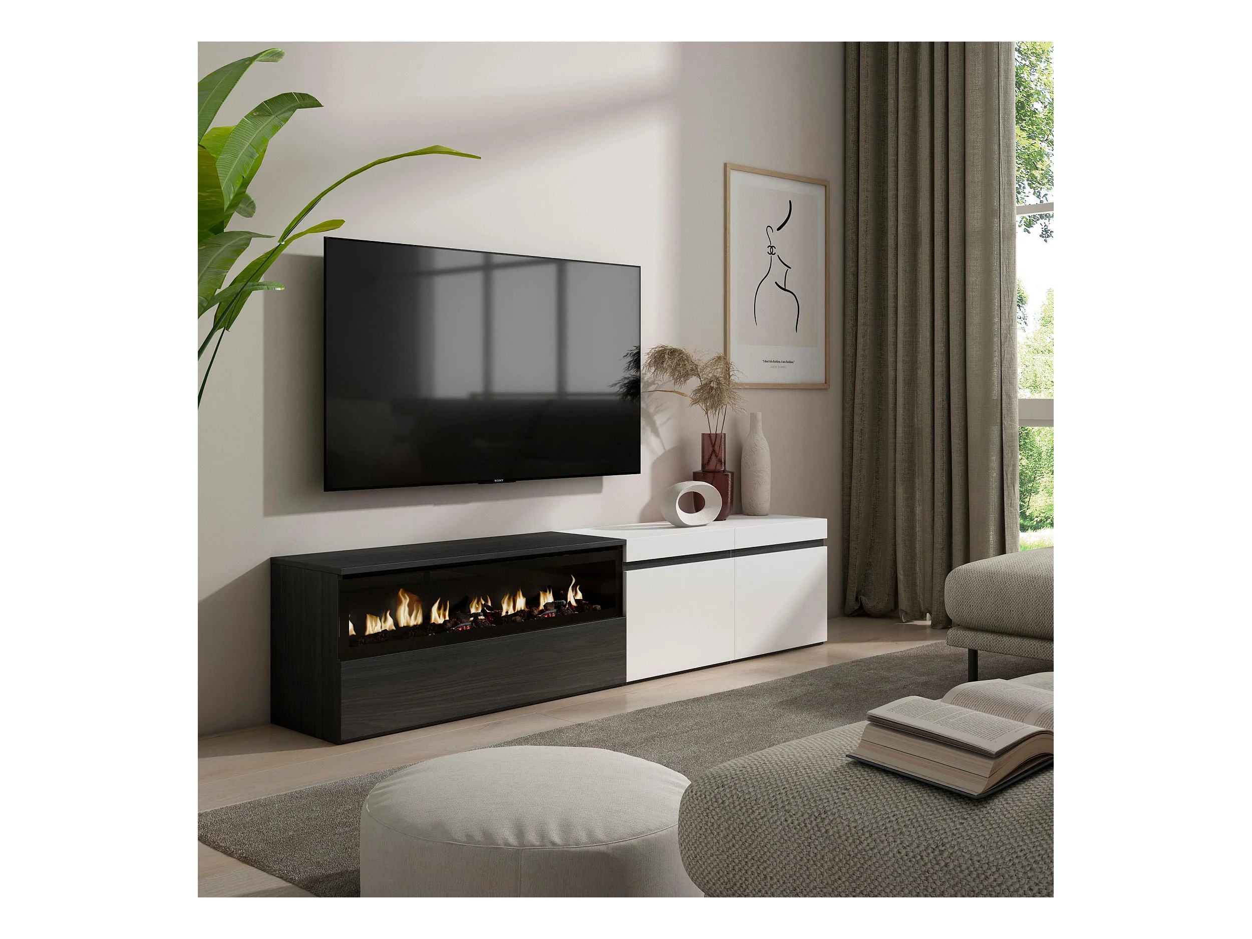 TV-Schrank, Lowboard, 200x35x45cm, Für TV-Geräte bis zu 80", Elektrokamin, Weiß und Schwarz