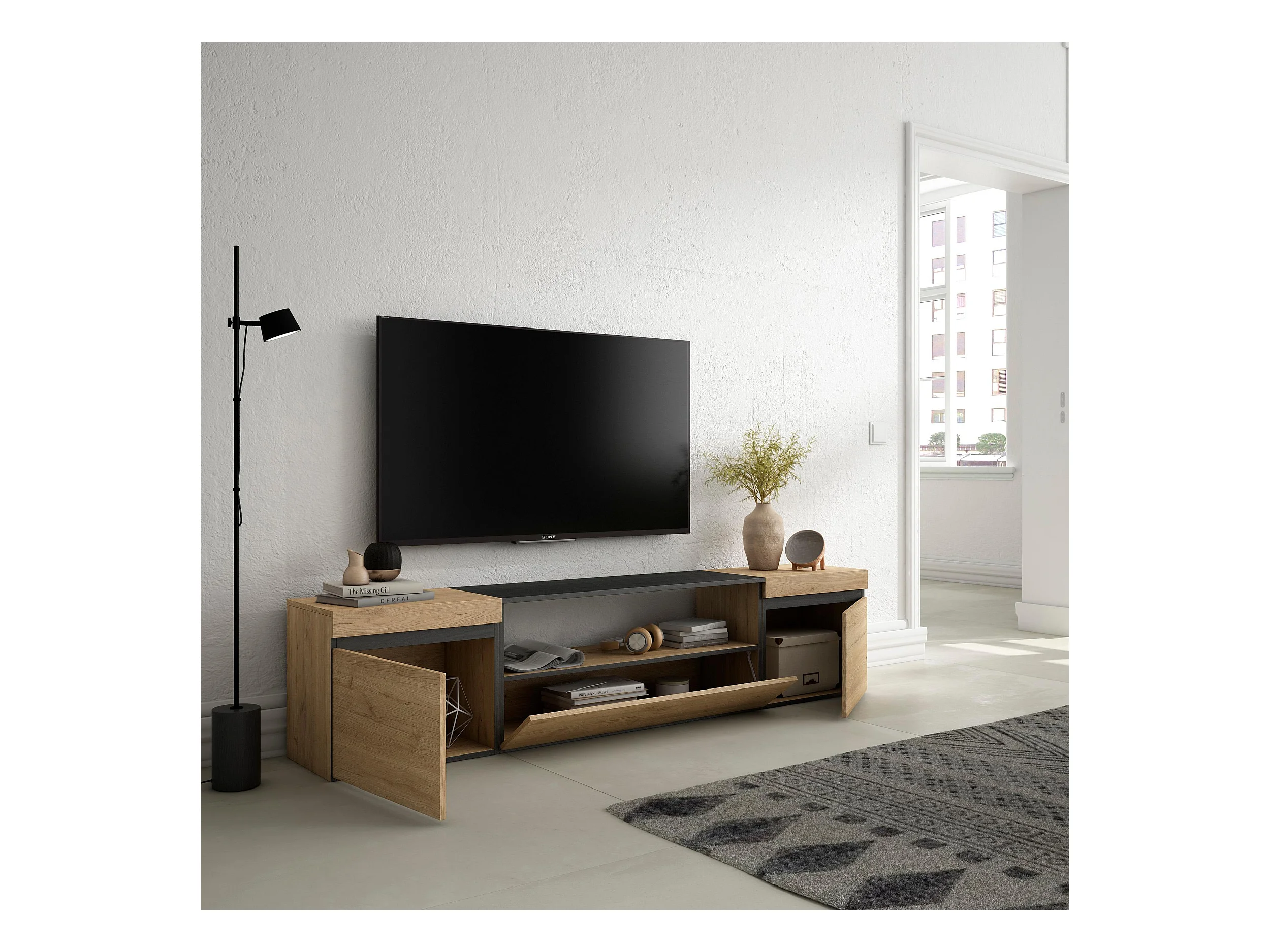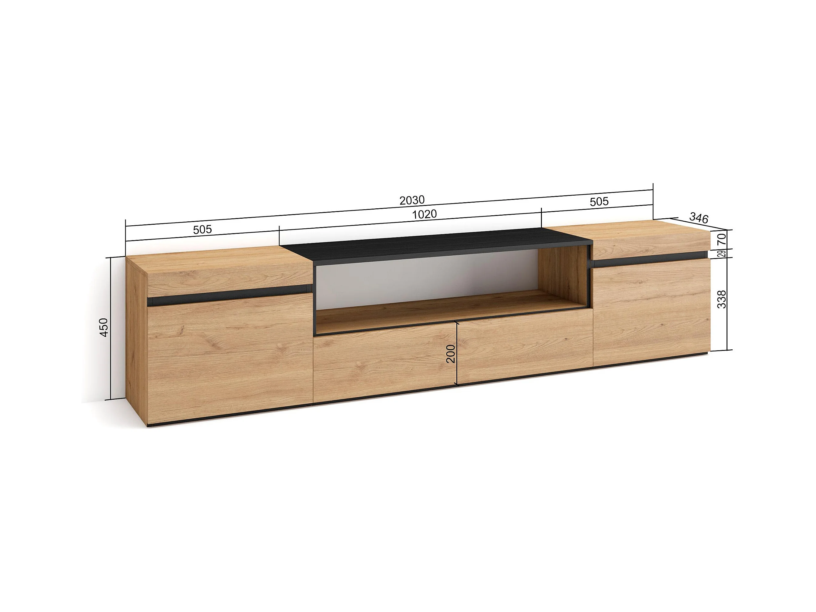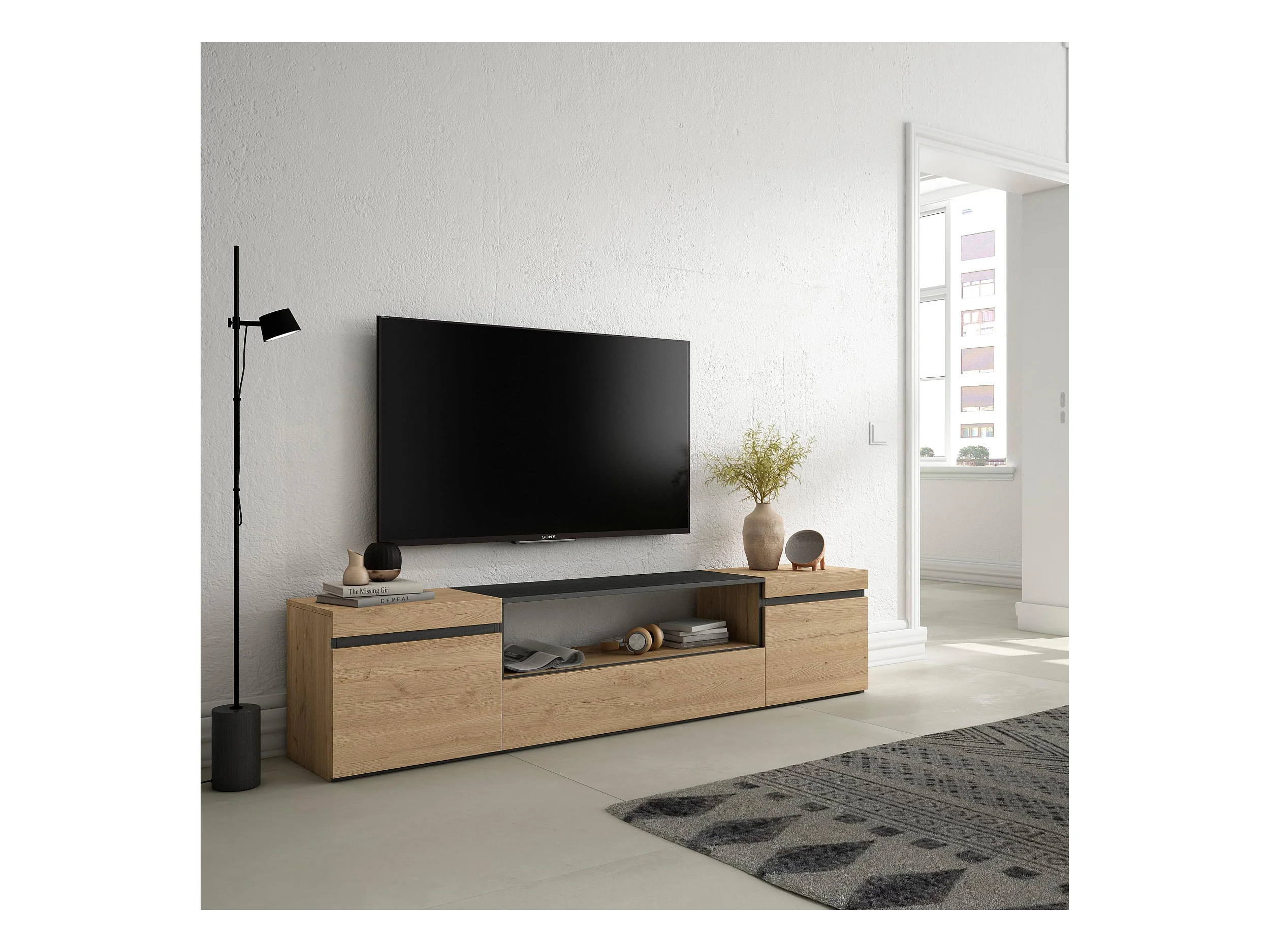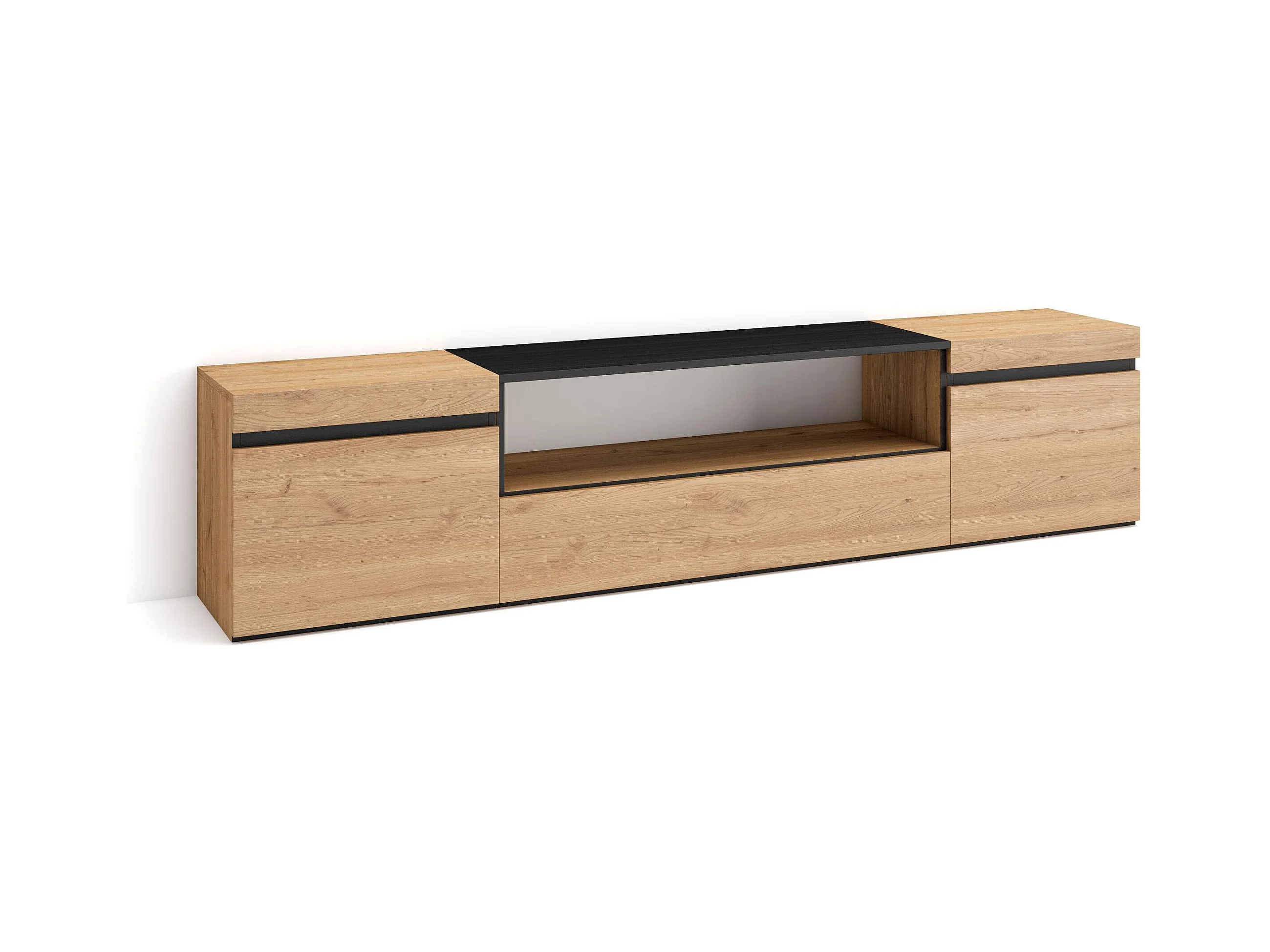 TV-Schrank, Lowboard, 200x35x45cm, Für TV-Geräte bis zu 80", Fernsehtisch, Eiche Schwarz