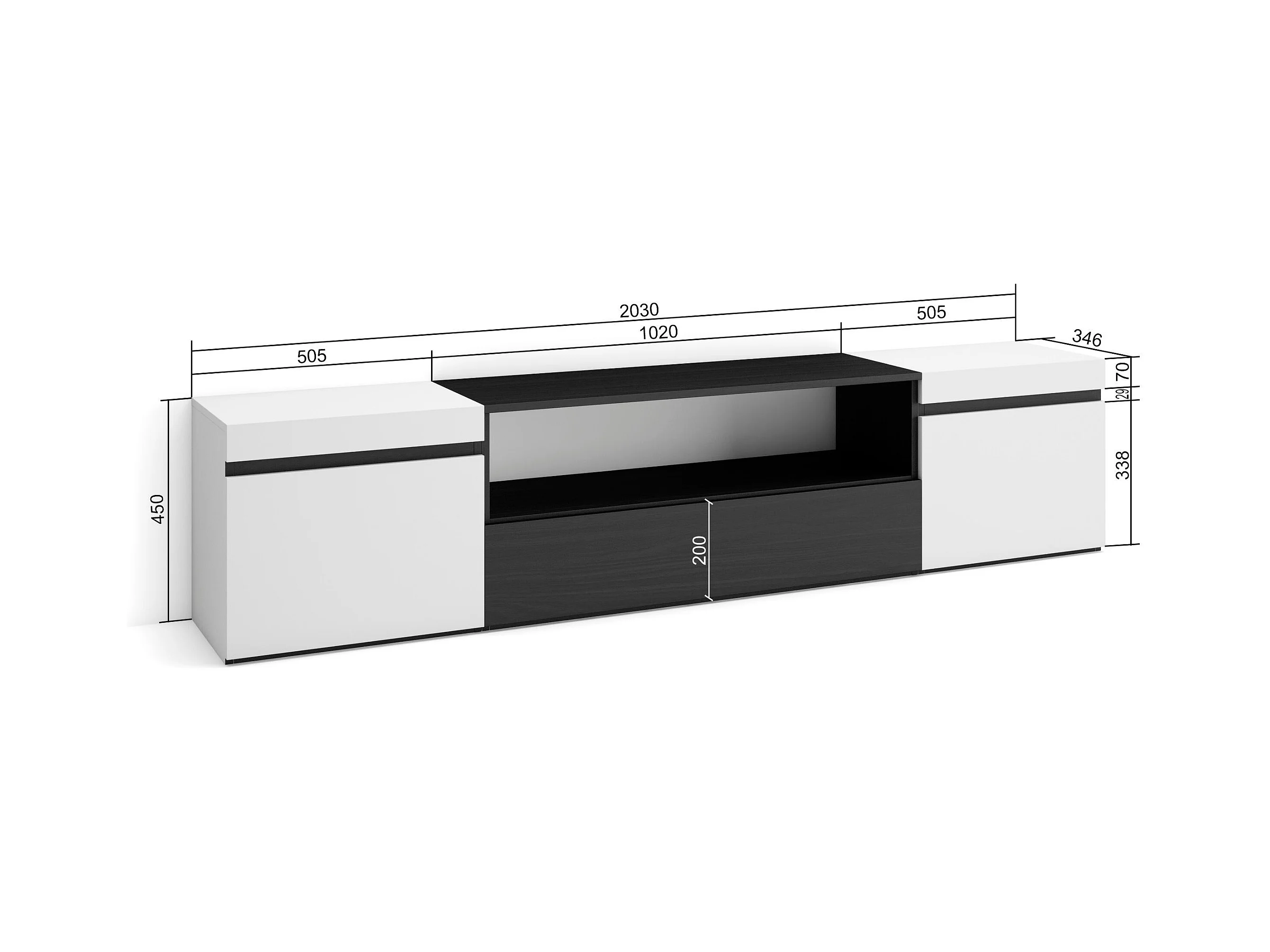 TV-Schrank, Lowboard, 200x35x45cm, Für TV-Geräte bis zu 80", Fernsehtisch, Weiß und Schwarz