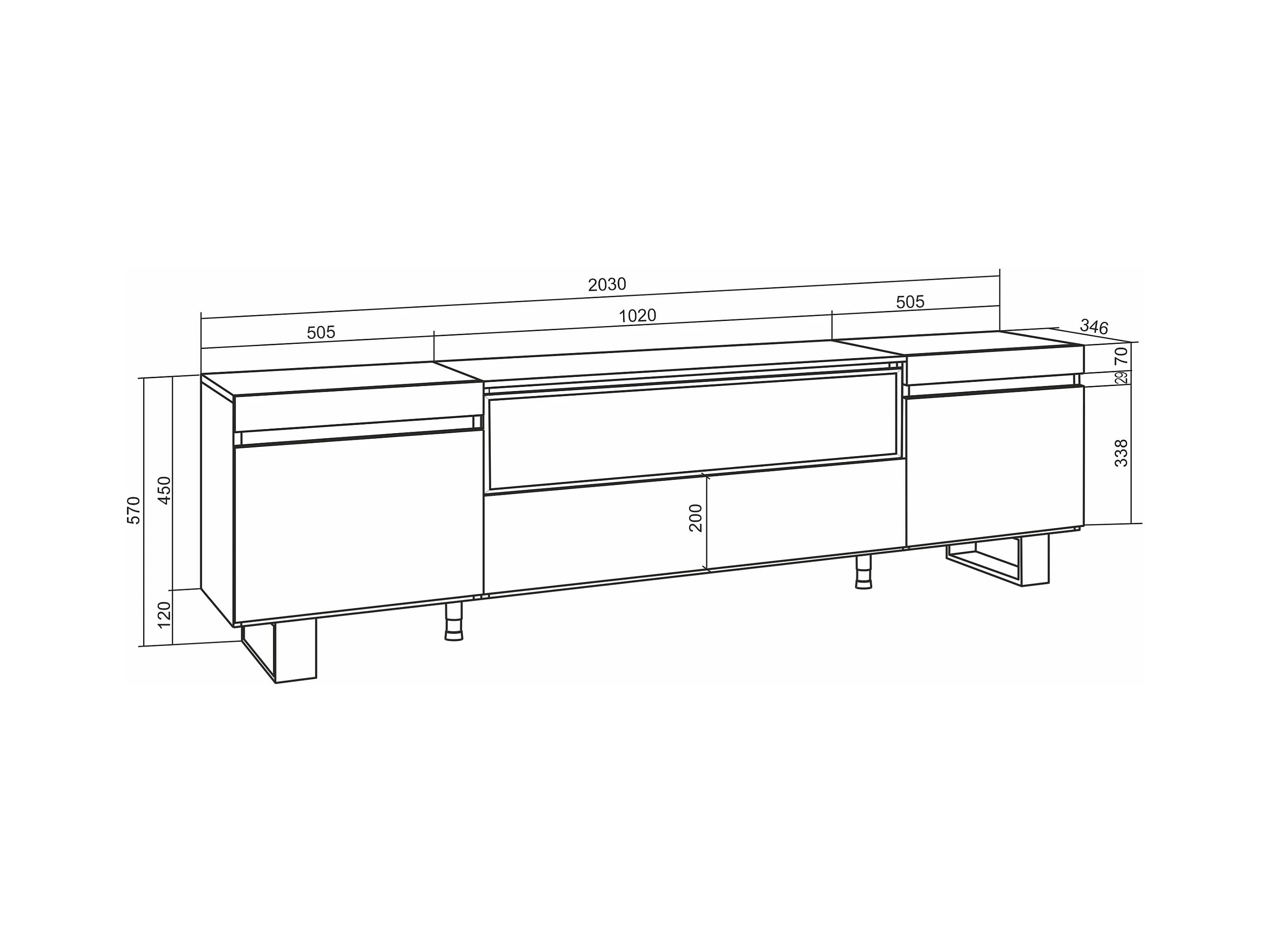 TV-Schrank, Lowboard, 200x35x57cm, Für TV-Geräte bis zu 80", Elektrokamin. , Industriedesign, Weiß und Schwarz