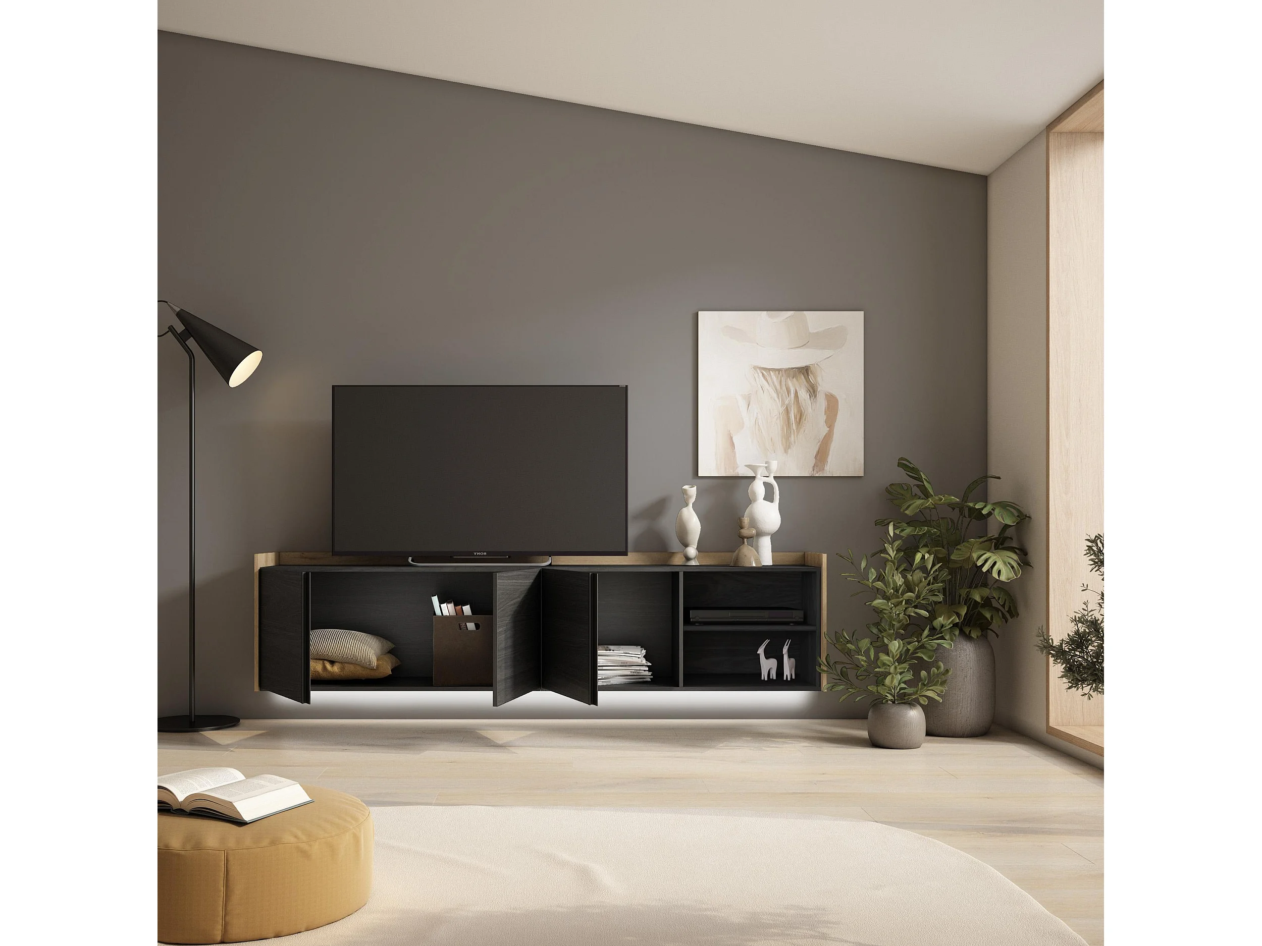 TV-Schrank, Lowboard, 207x50x35 cm, Für TV-Geräte bis zu 80", Hängend, LED, Schwarz Eiche