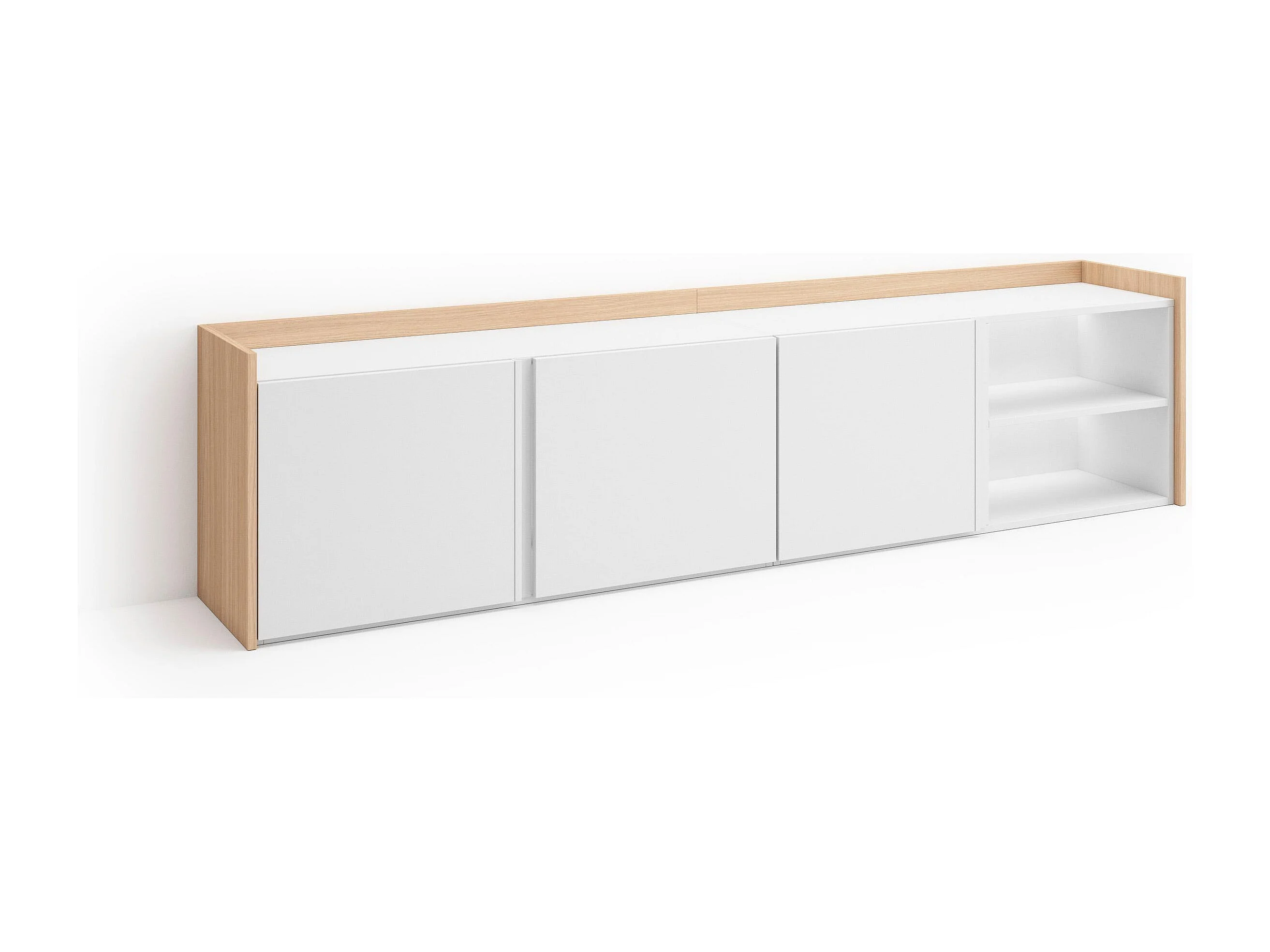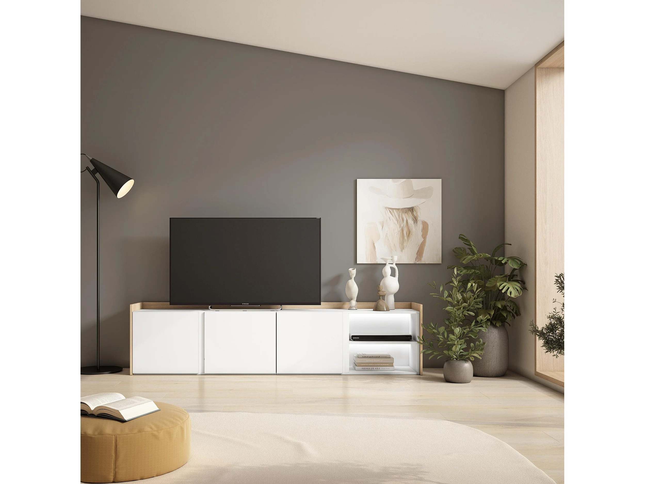 TV-Schrank, Lowboard, 207x50x35 cm, Für TV-Geräte bis zu 80", LED, Weiß und Eiche Soft
