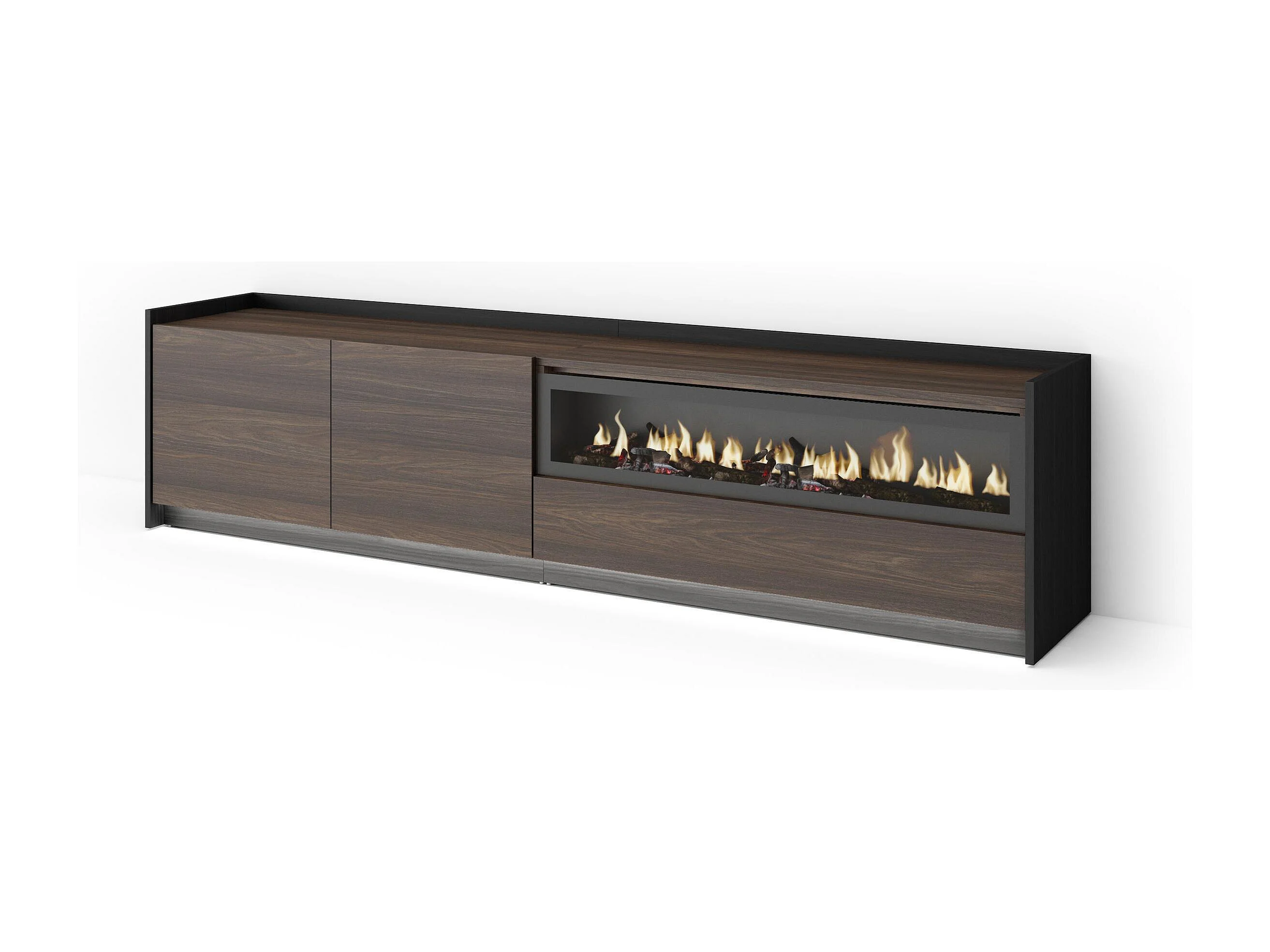 TV-Schrank, Lowboard, 207x50x37 cm, Für TV-Geräte bis zu 80", Elektrokamin., LED, Dunkler Eiche und Schwarz