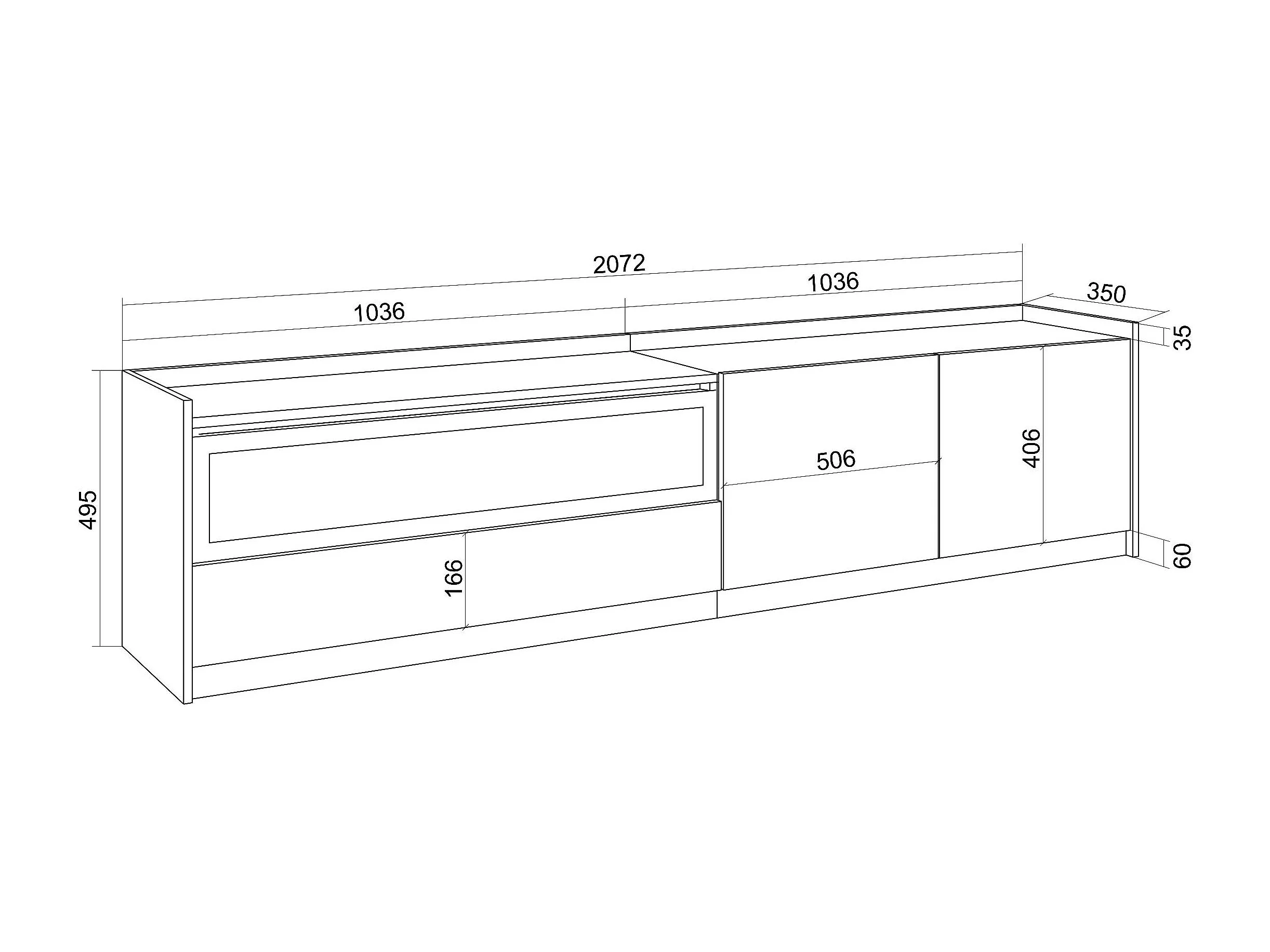 TV-Schrank, Lowboard, 207x50x37 cm, Für TV-Geräte bis zu 80", Elektrokamin., Weiß und Eiche Soft