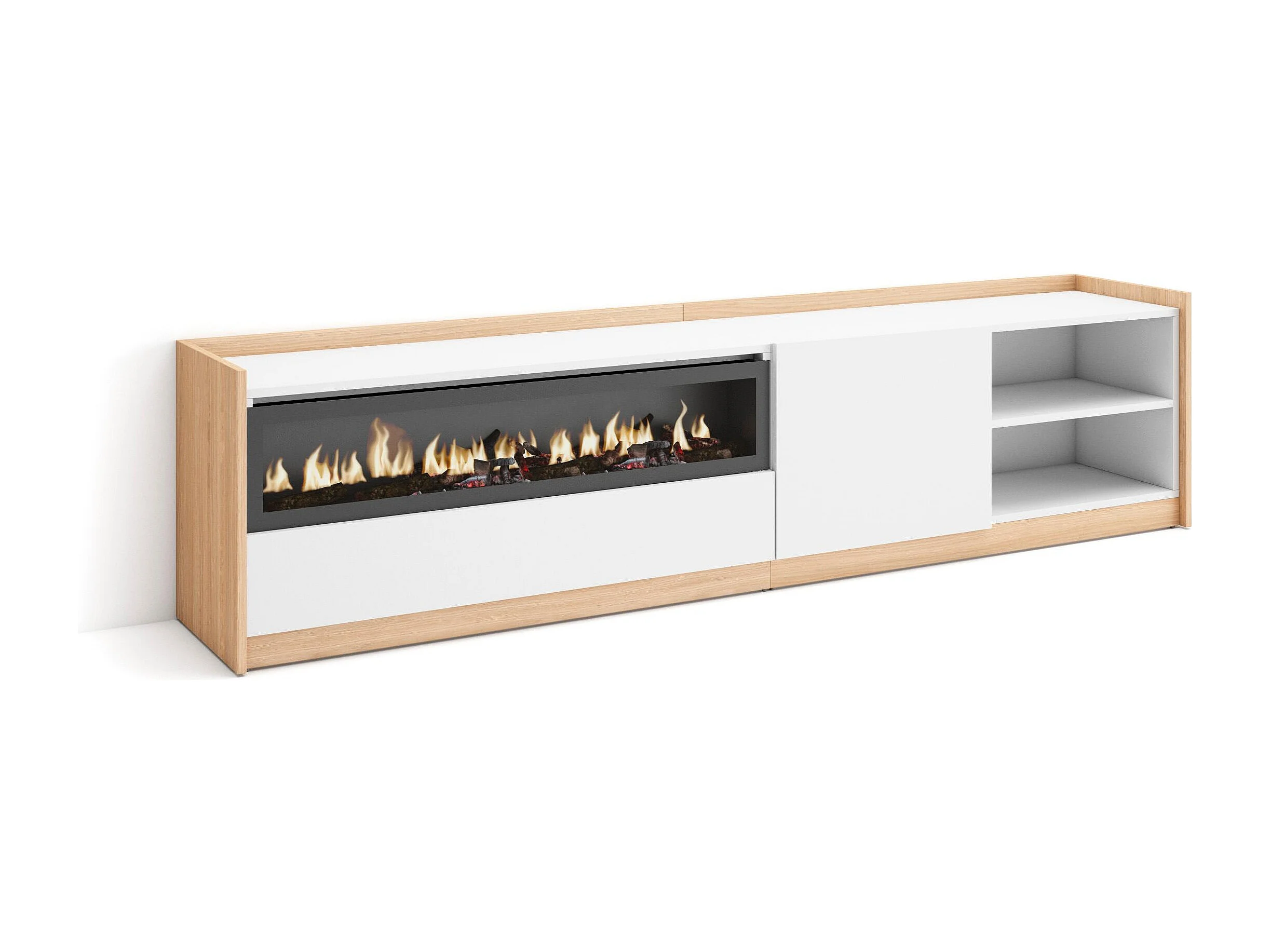 TV-Schrank, Lowboard, 207x50x37 cm, Für TV-Geräte bis zu 80", Elektrokamin., Weiß und Eiche Soft