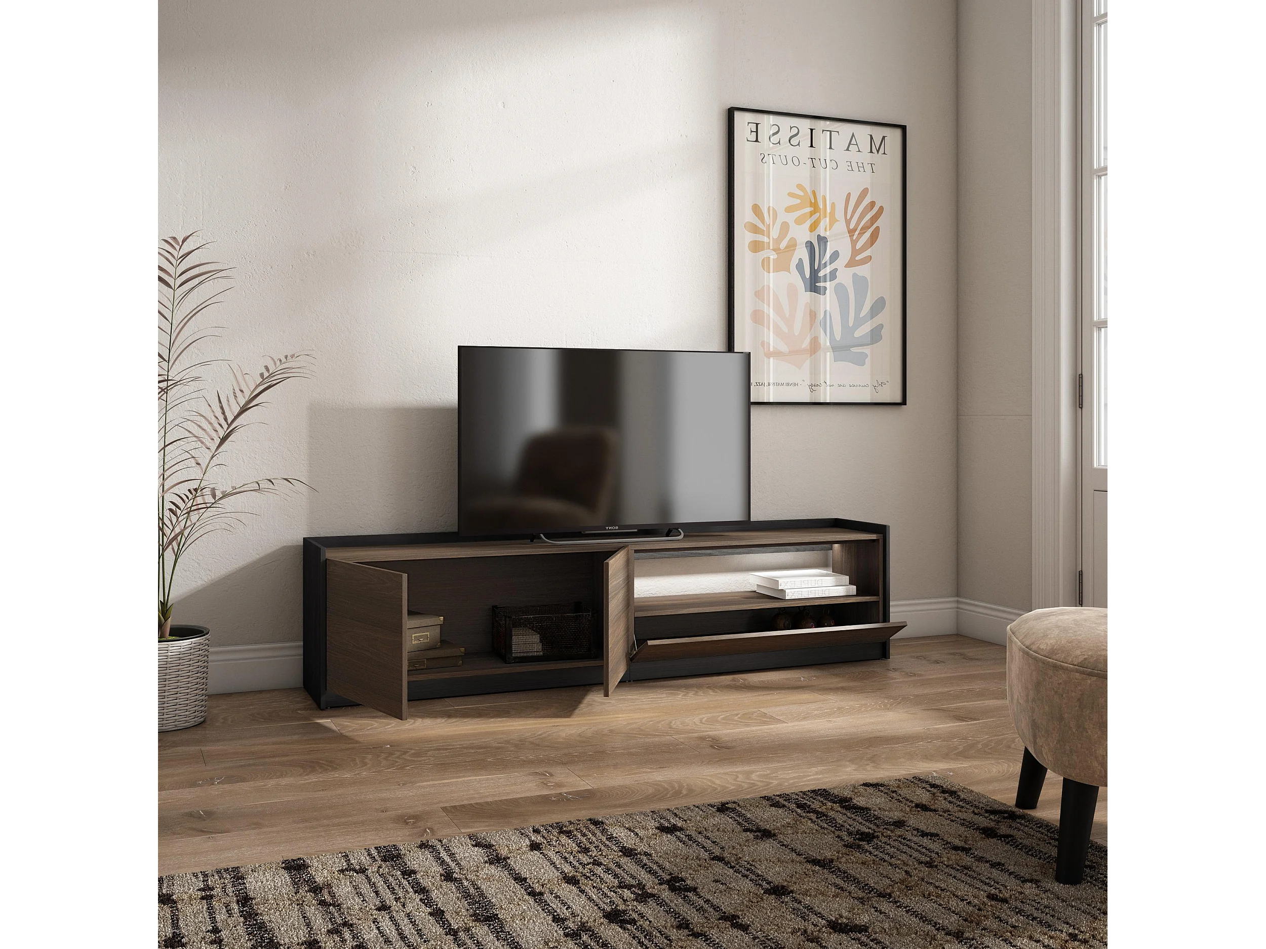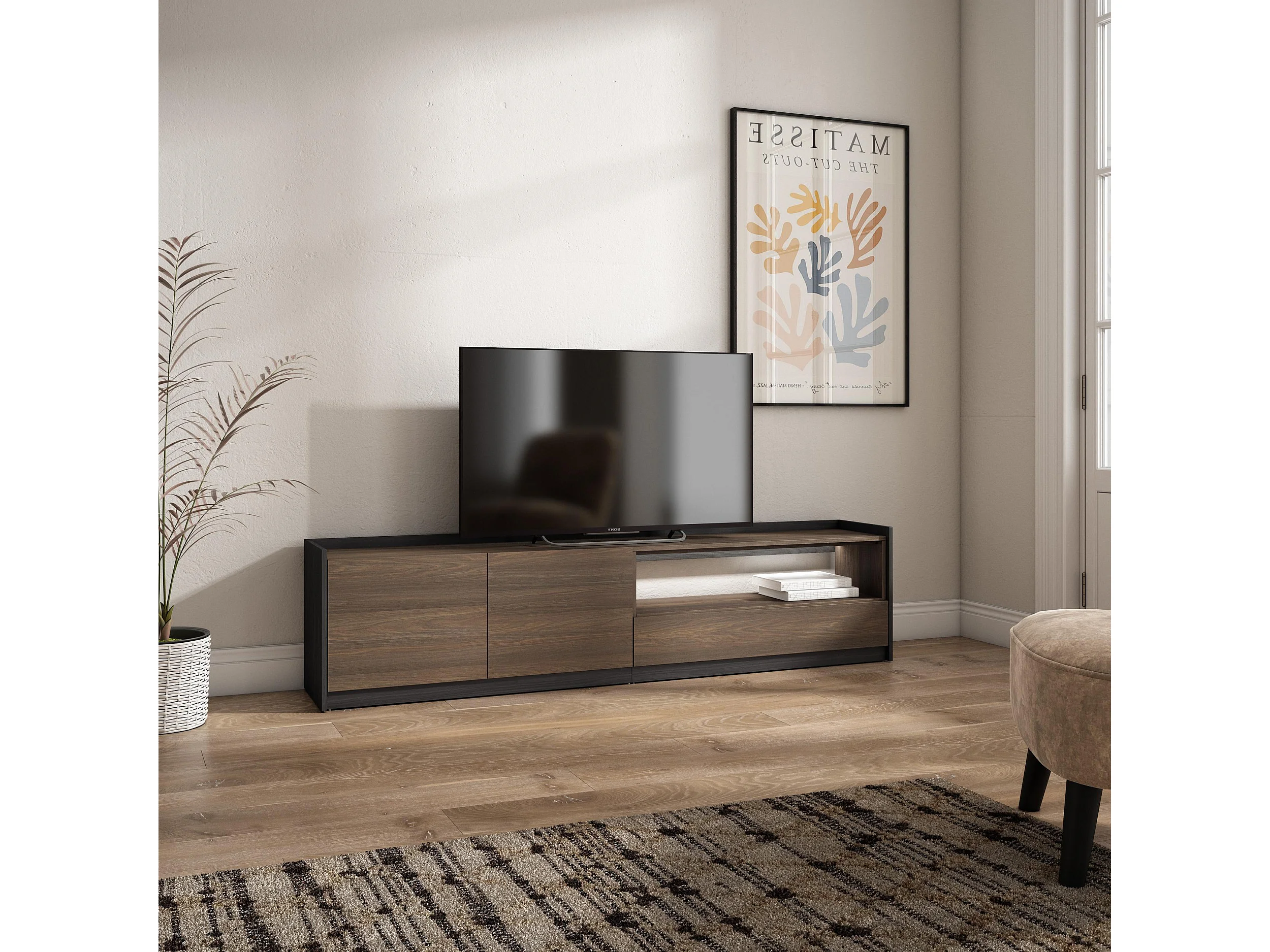TV-Schrank, Lowboard, 207x50x37 cm, Für TV-Geräte bis zu 80", LED, Dunkler Eiche und Schwarz