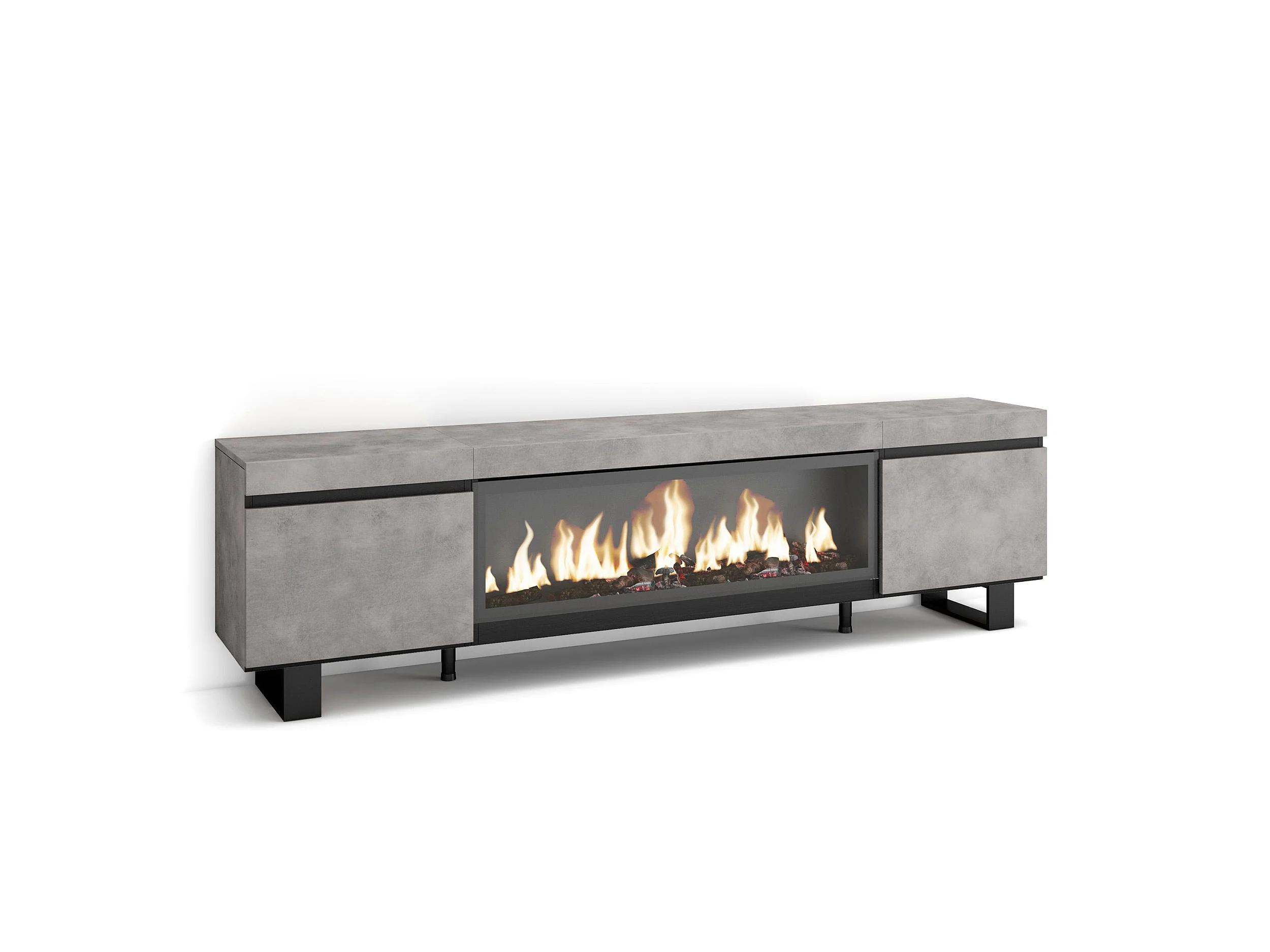 TV-Schrank, Lowboard, 208x35x57cm, Für TV-Geräte bis zu 80", Elektrokamin XXL, Industriedesign, Zement