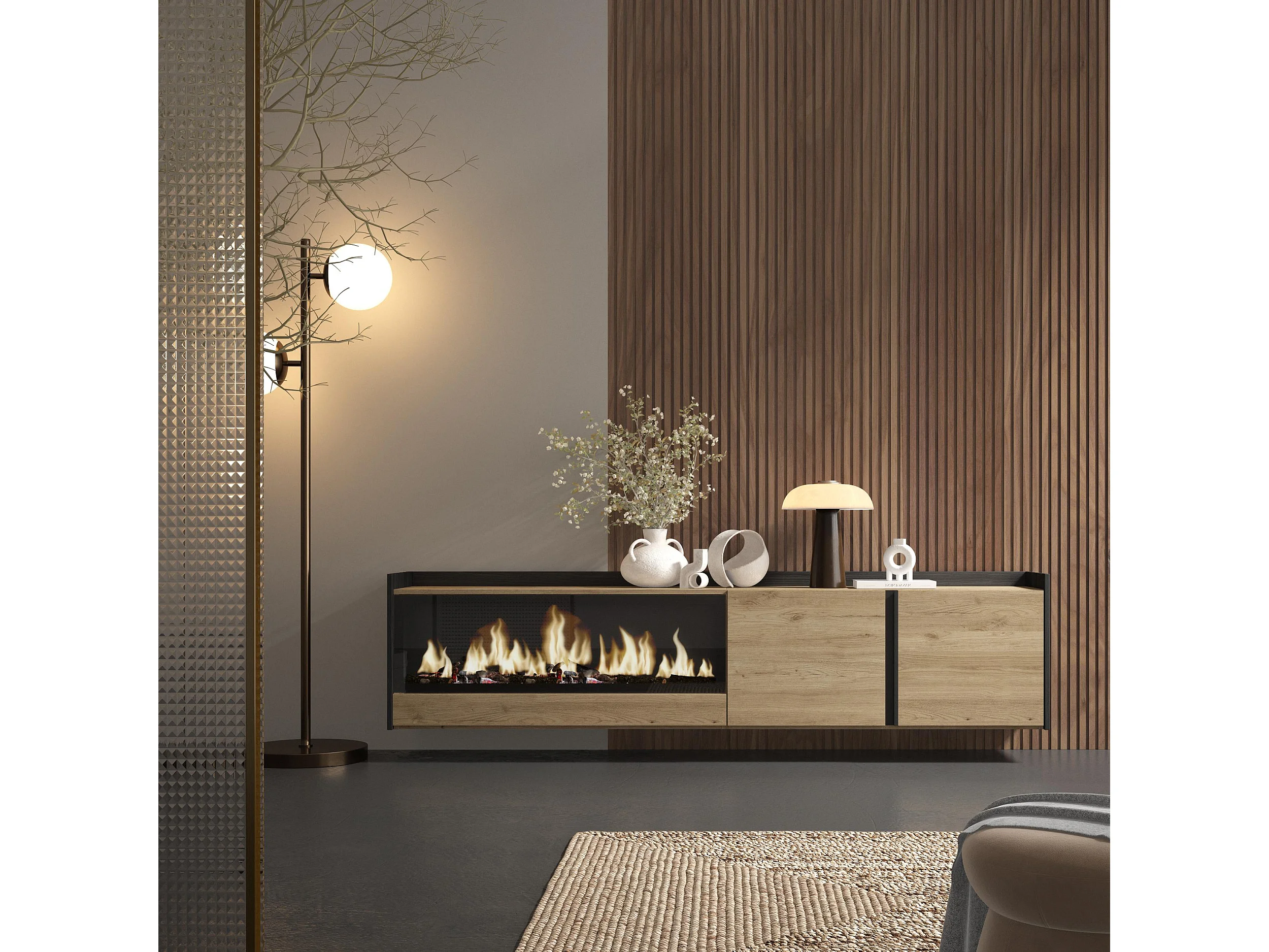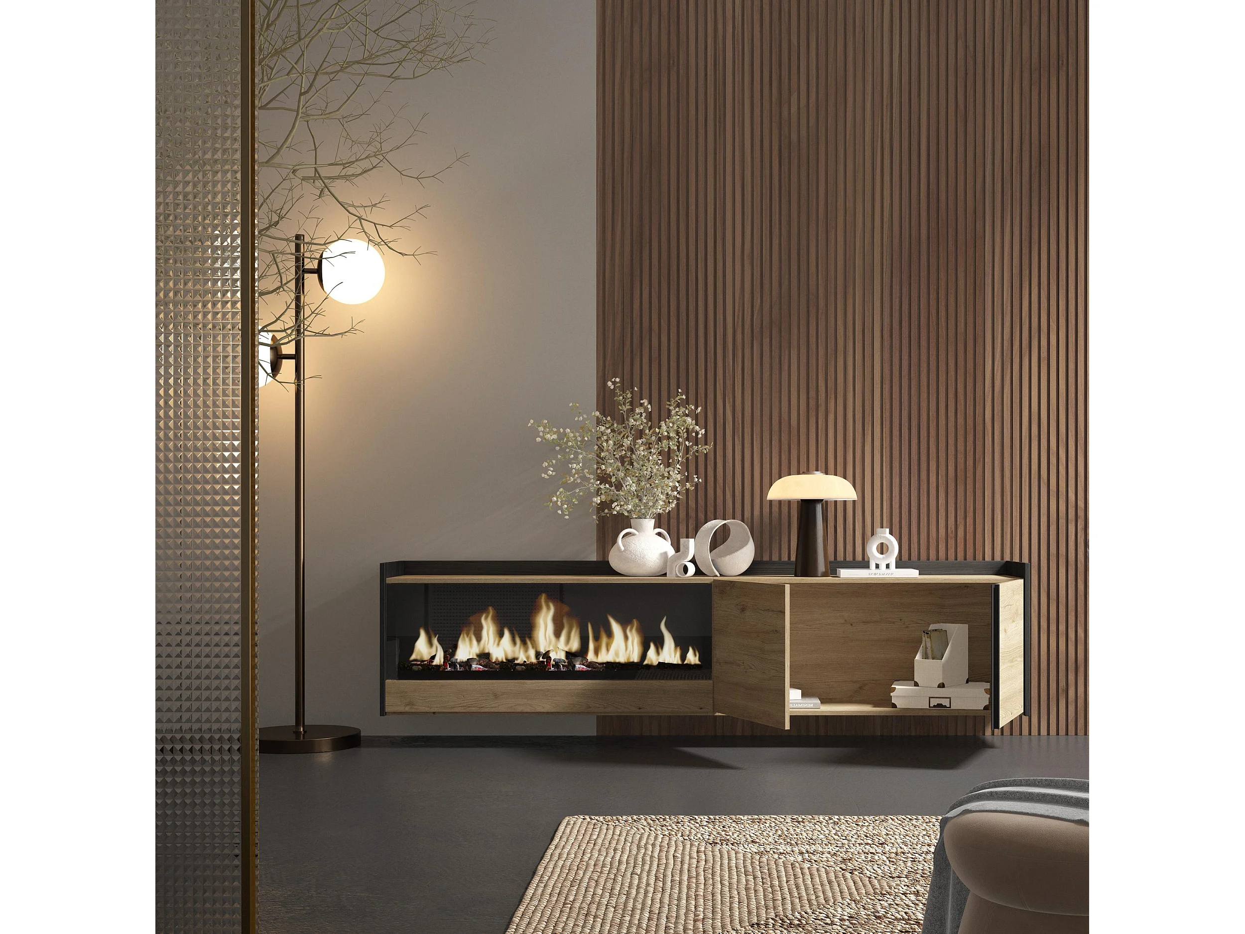 TV-Schrank, Lowboard, 212x50x35 cm, Für TV-Geräte bis zu 80", Elektrokamin XXL, Hängend, Eiche Schwarz