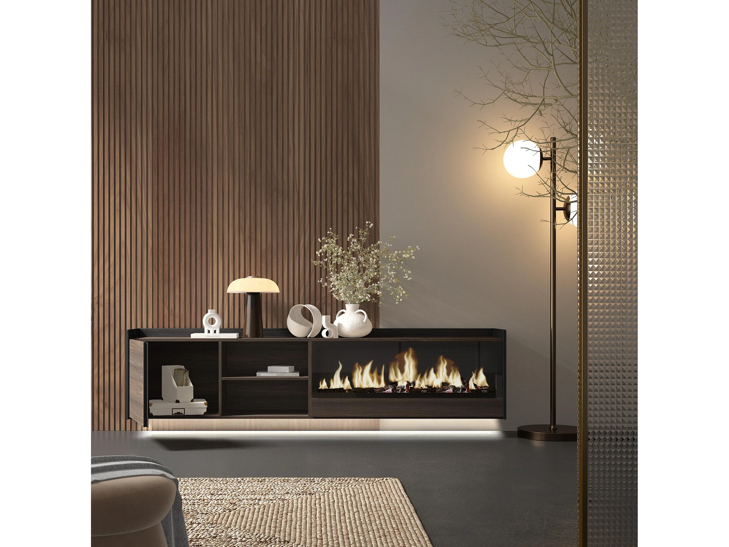 TV-Schrank, Lowboard, 212x50x35 cm, Für TV-Geräte bis zu 80", Elektrokamin XXL, Hängend, LED, Dunkler Eiche und Schwarz