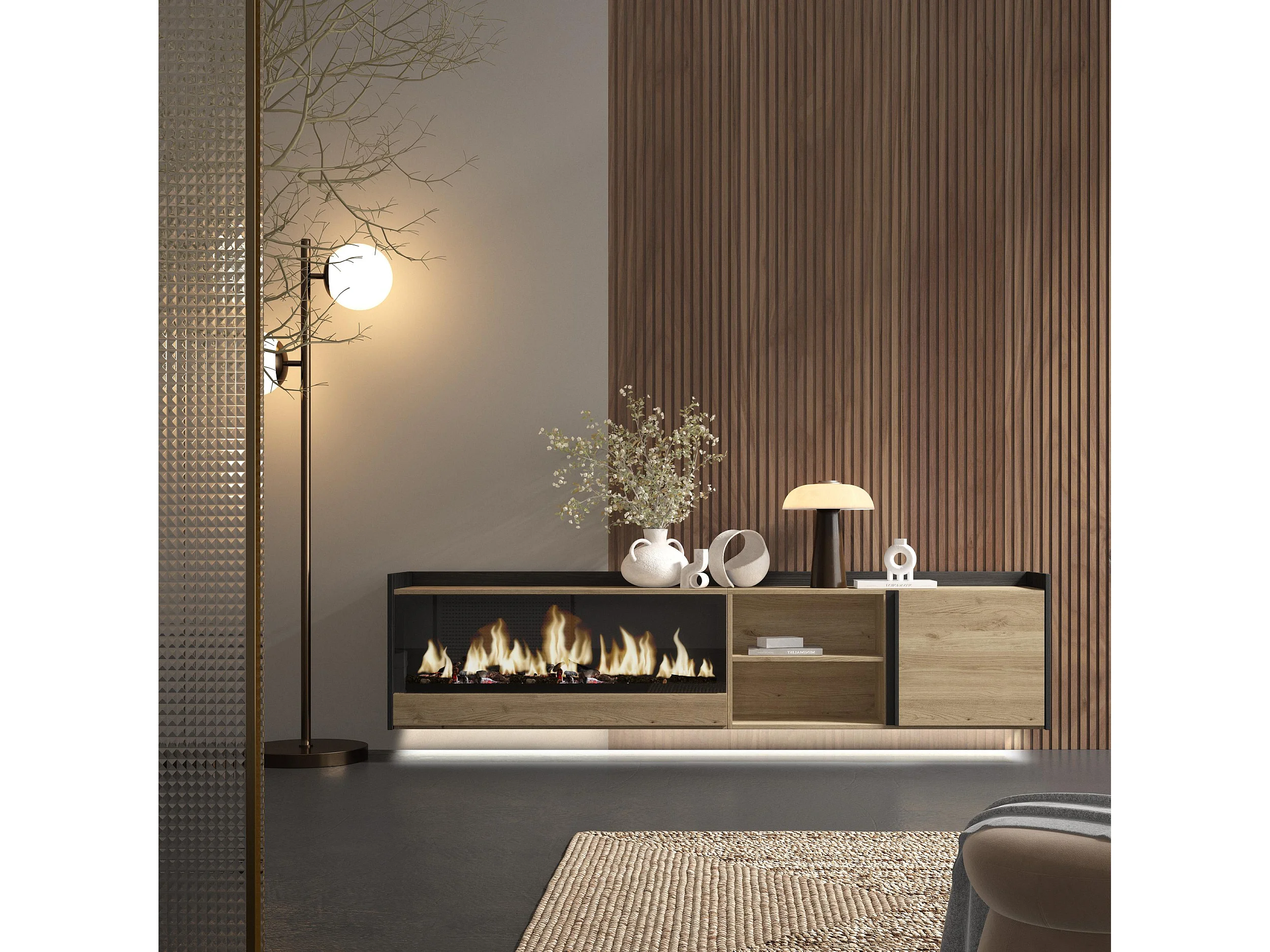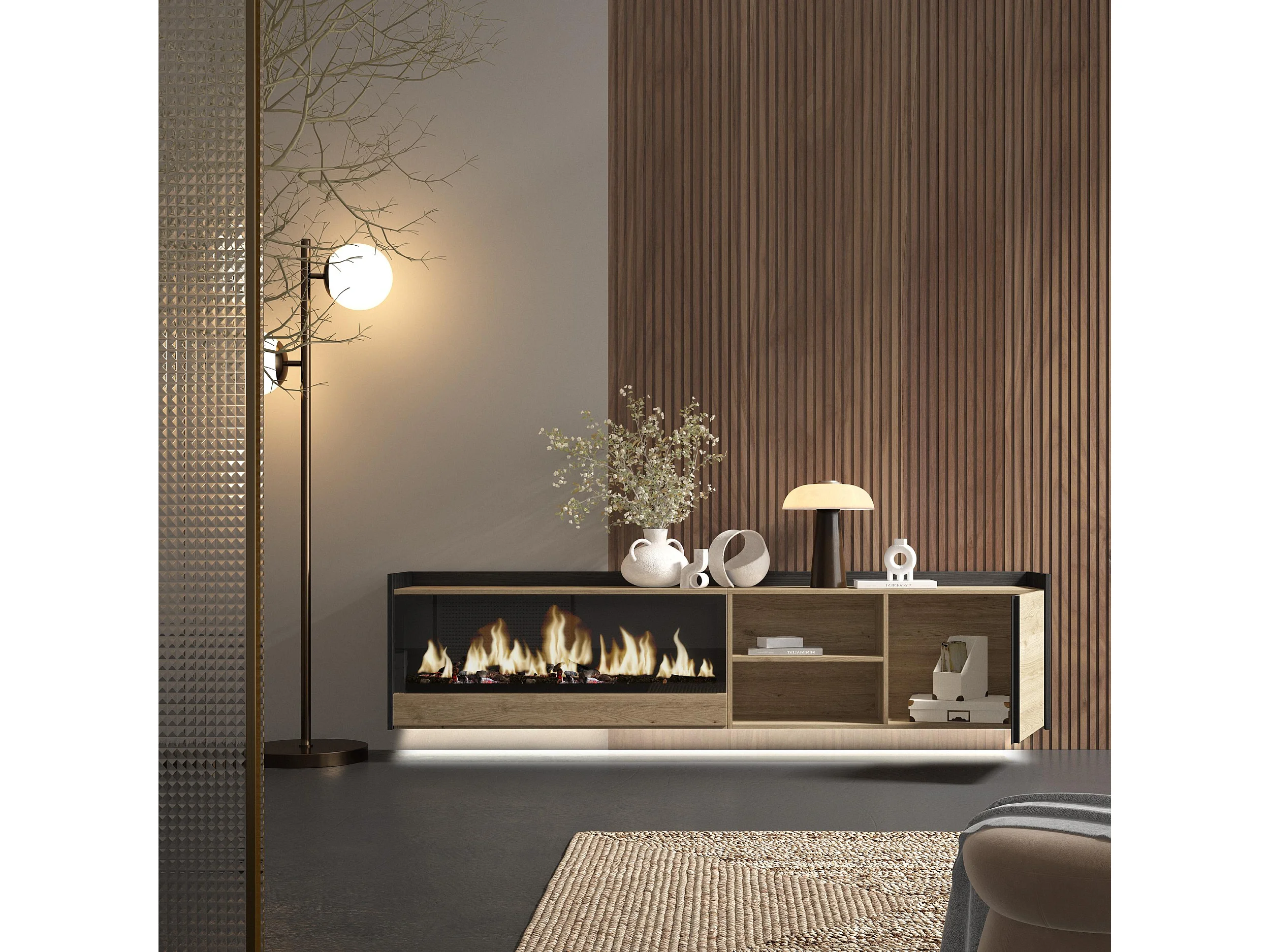 TV-Schrank, Lowboard, 212x50x35 cm, Für TV-Geräte bis zu 80", Elektrokamin XXL, Hängend, LED, Eiche Schwarz