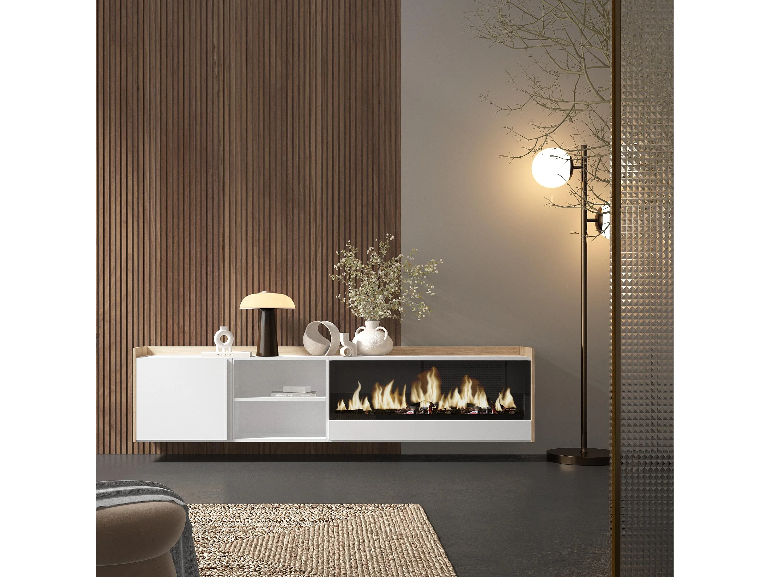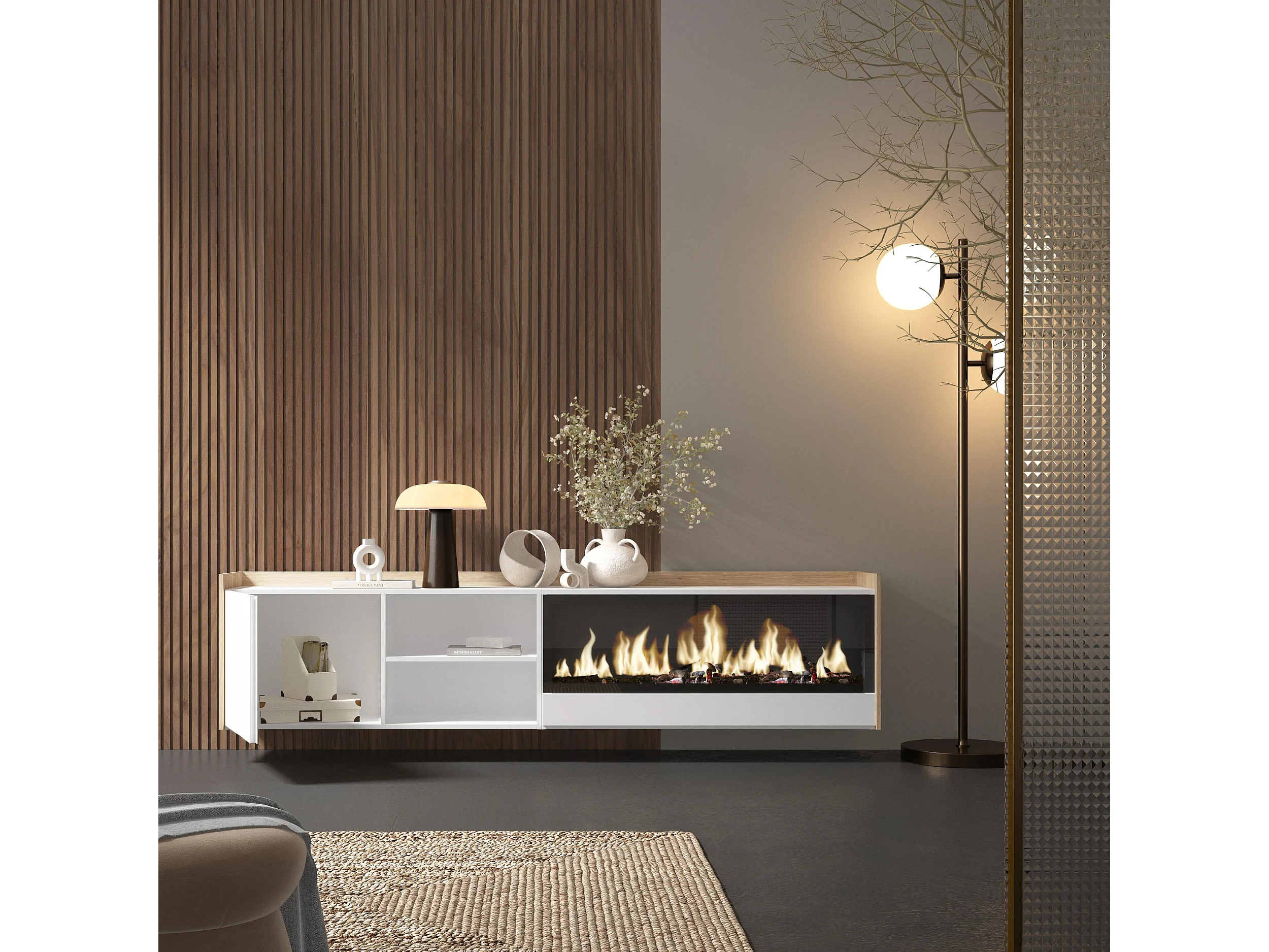 TV-Schrank, Lowboard, 212x50x35 cm, Für TV-Geräte bis zu 80", Elektrokamin XXL, Hängend, Weiß und Eiche Soft