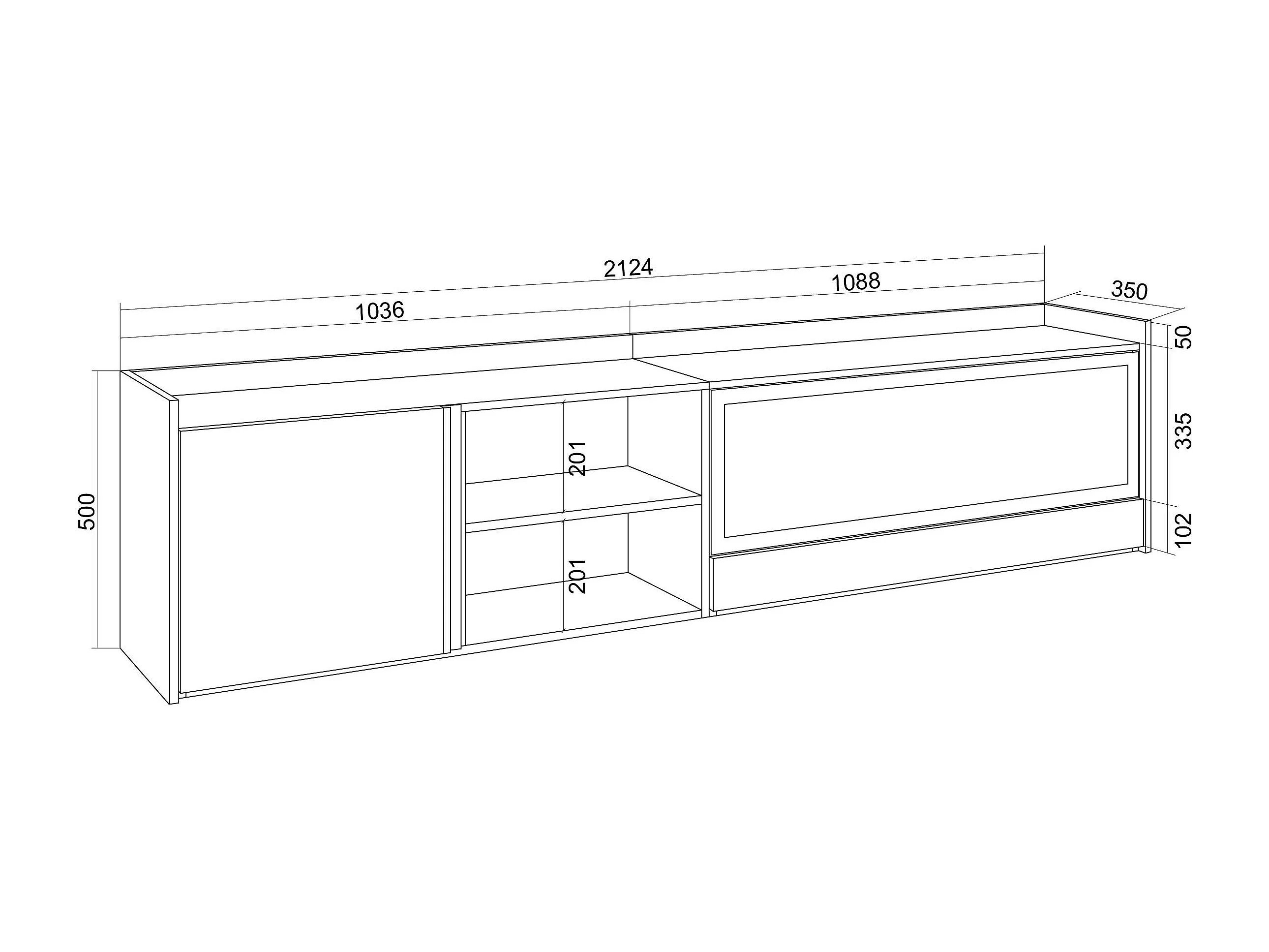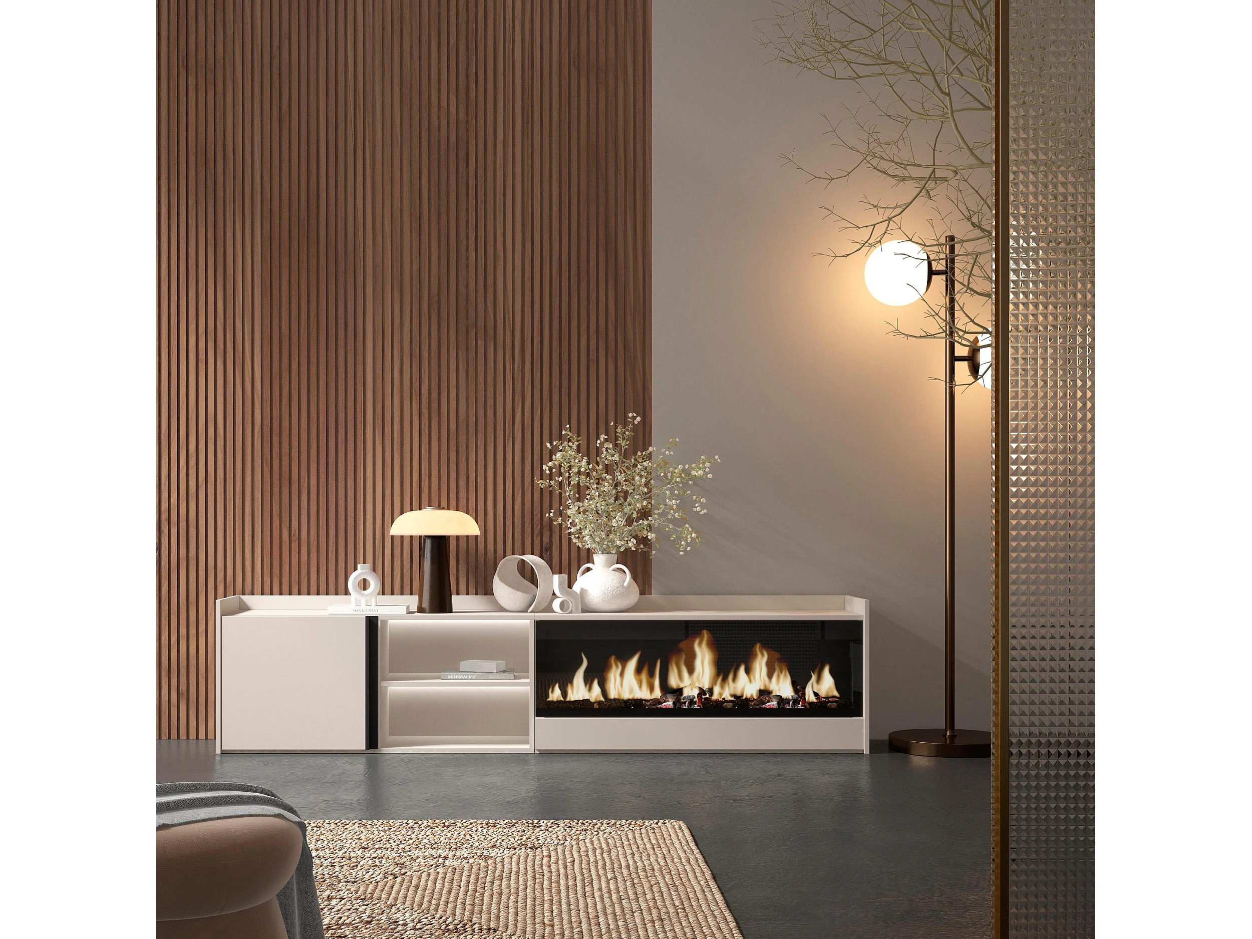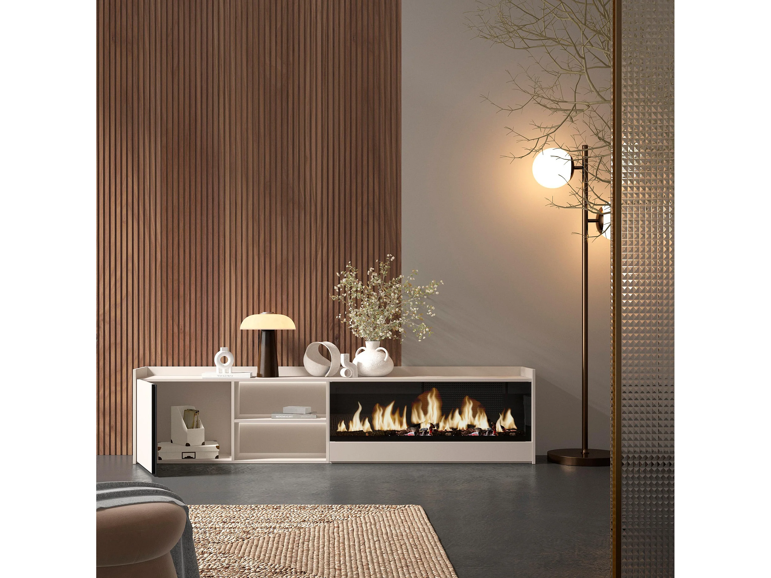 TV-Schrank, Lowboard, 212x50x35 cm, Für TV-Geräte bis zu 80", Elektrokamin XXL, LED, Beige