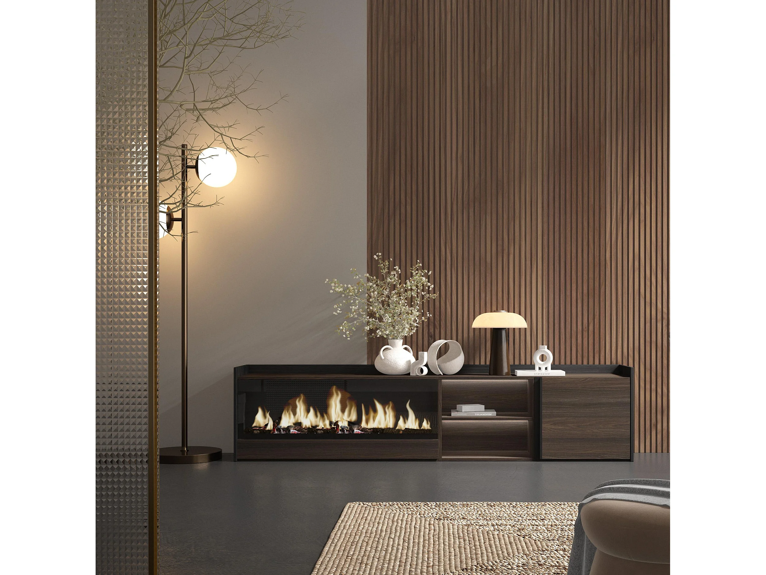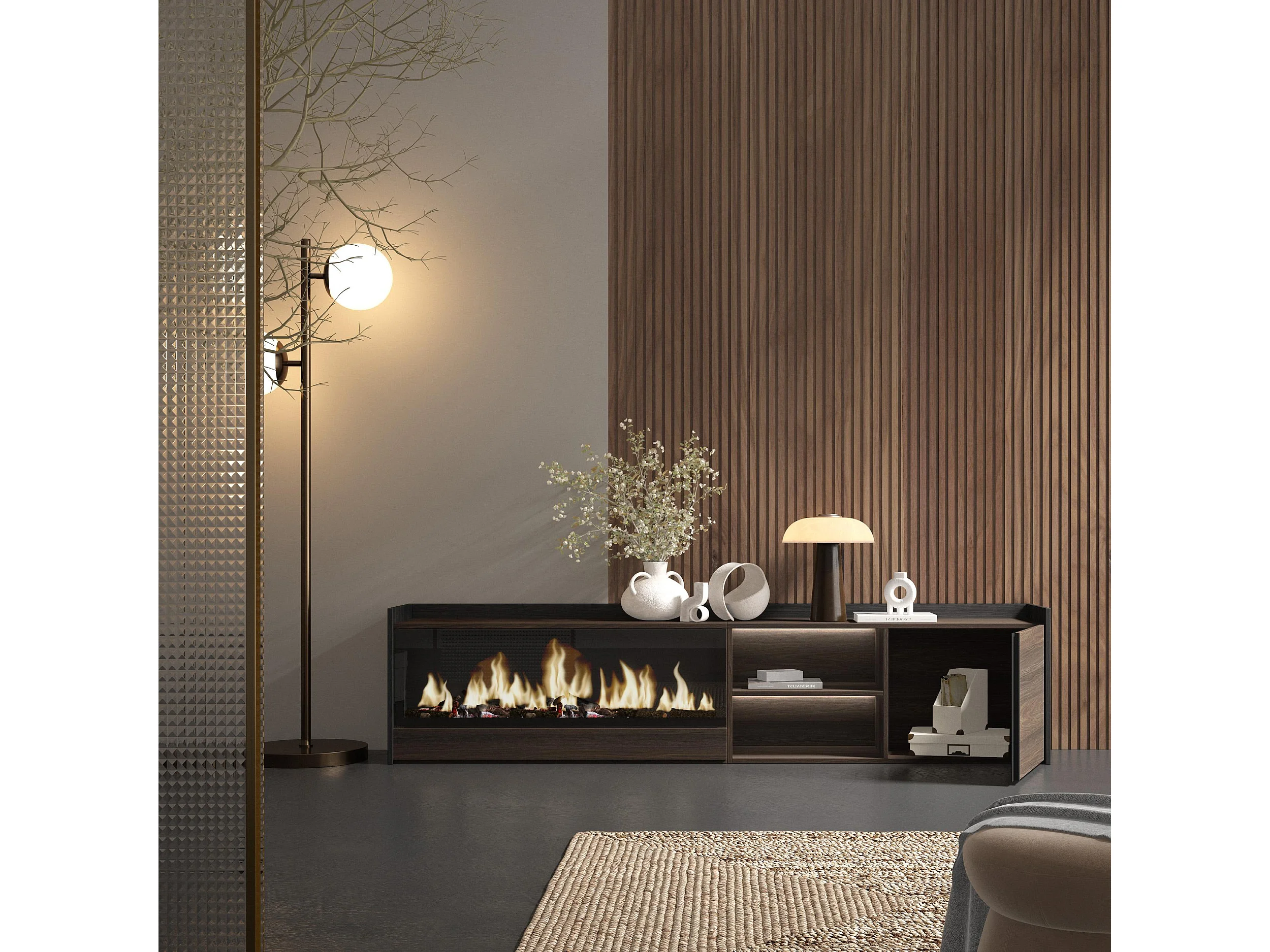 TV-Schrank, Lowboard, 212x50x35 cm, Für TV-Geräte bis zu 80", Elektrokamin XXL, LED, Dunkler Eiche und Schwarz