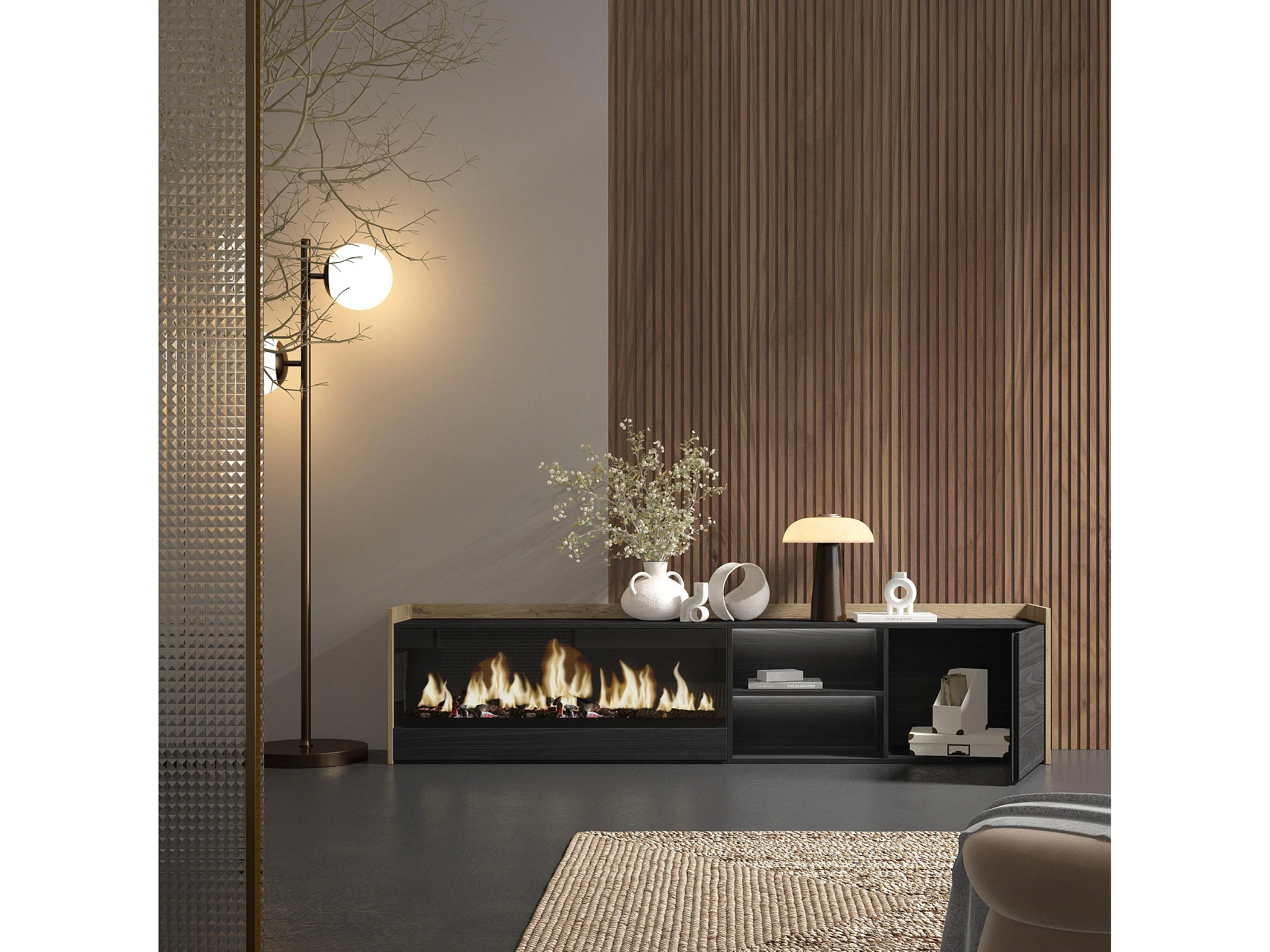 TV-Schrank, Lowboard, 212x50x35 cm, Für TV-Geräte bis zu 80", Elektrokamin XXL, LED, Schwarz Eiche
