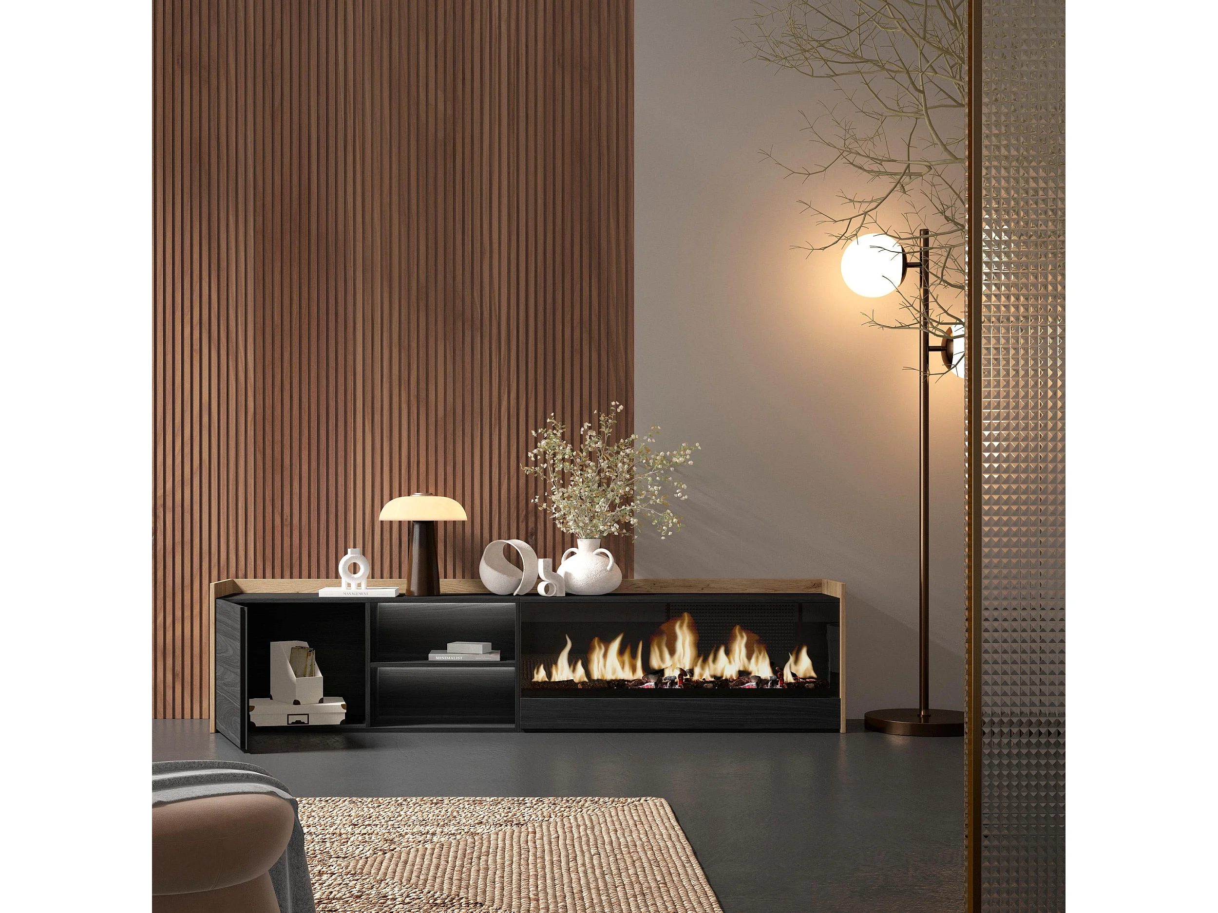 TV-Schrank, Lowboard, 212x50x35 cm, Für TV-Geräte bis zu 80", Elektrokamin XXL, LED, Schwarz Eiche