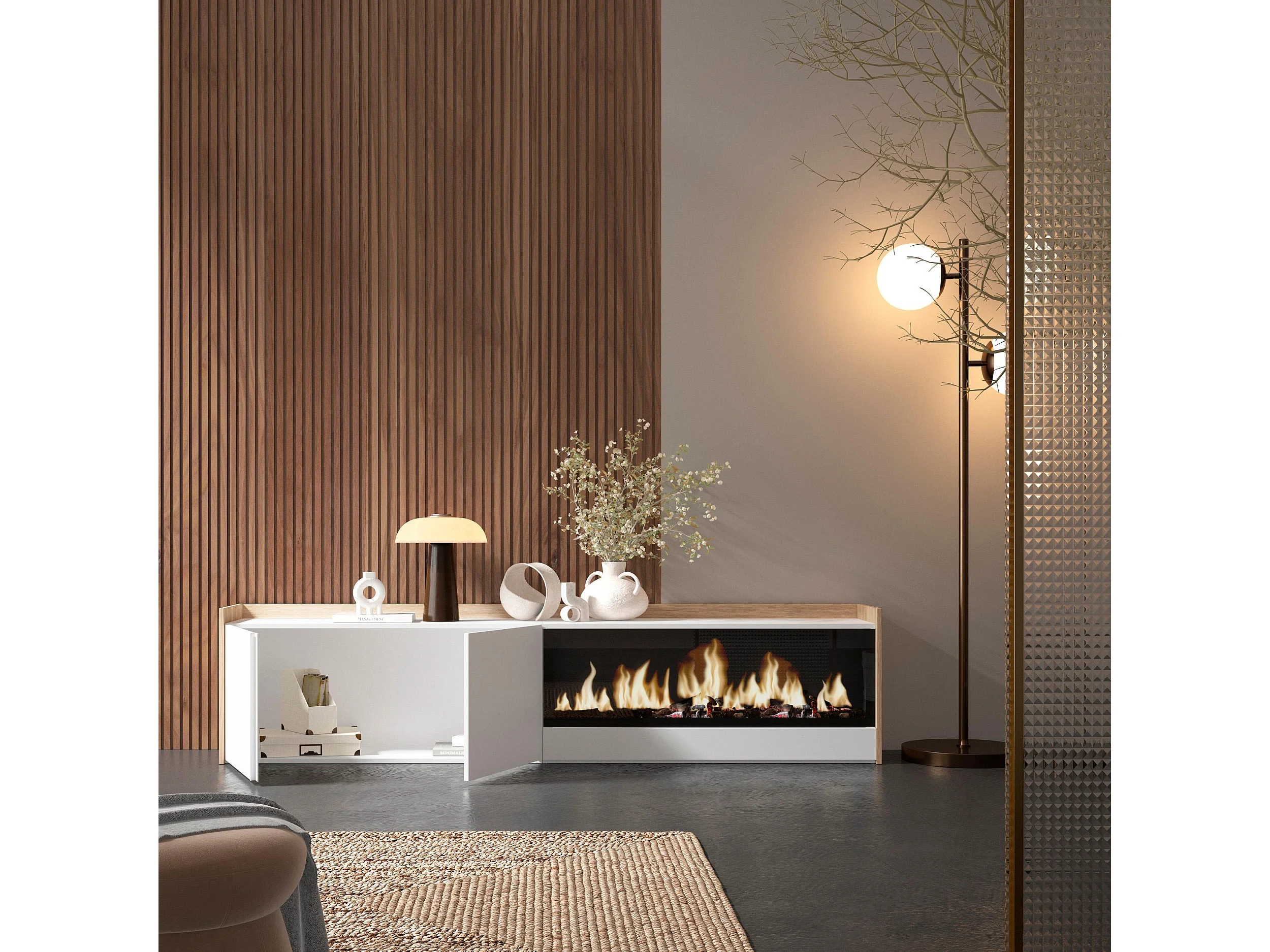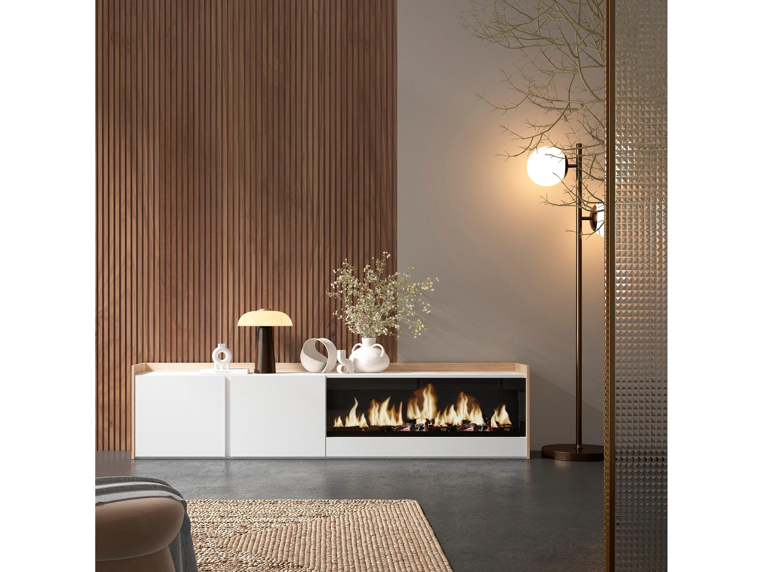 TV-Schrank, Lowboard, 212x50x35 cm, Für TV-Geräte bis zu 80", Elektrokamin XXL, Weiß und Eiche Soft