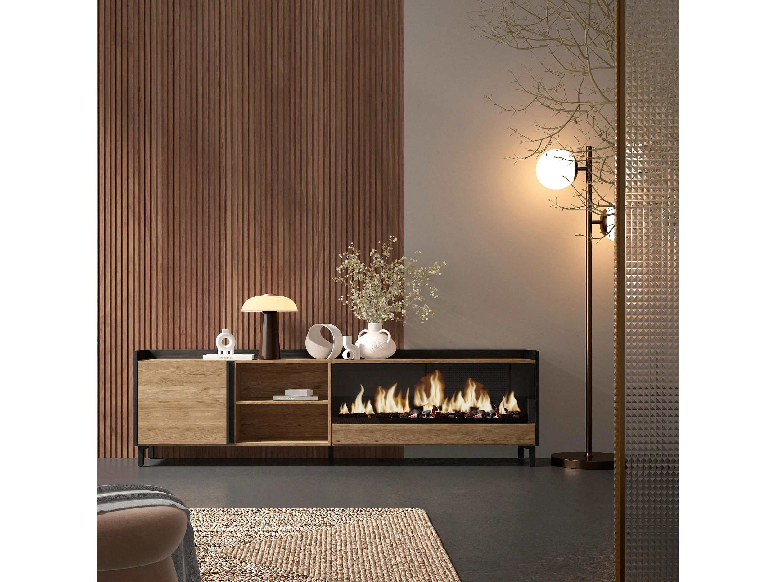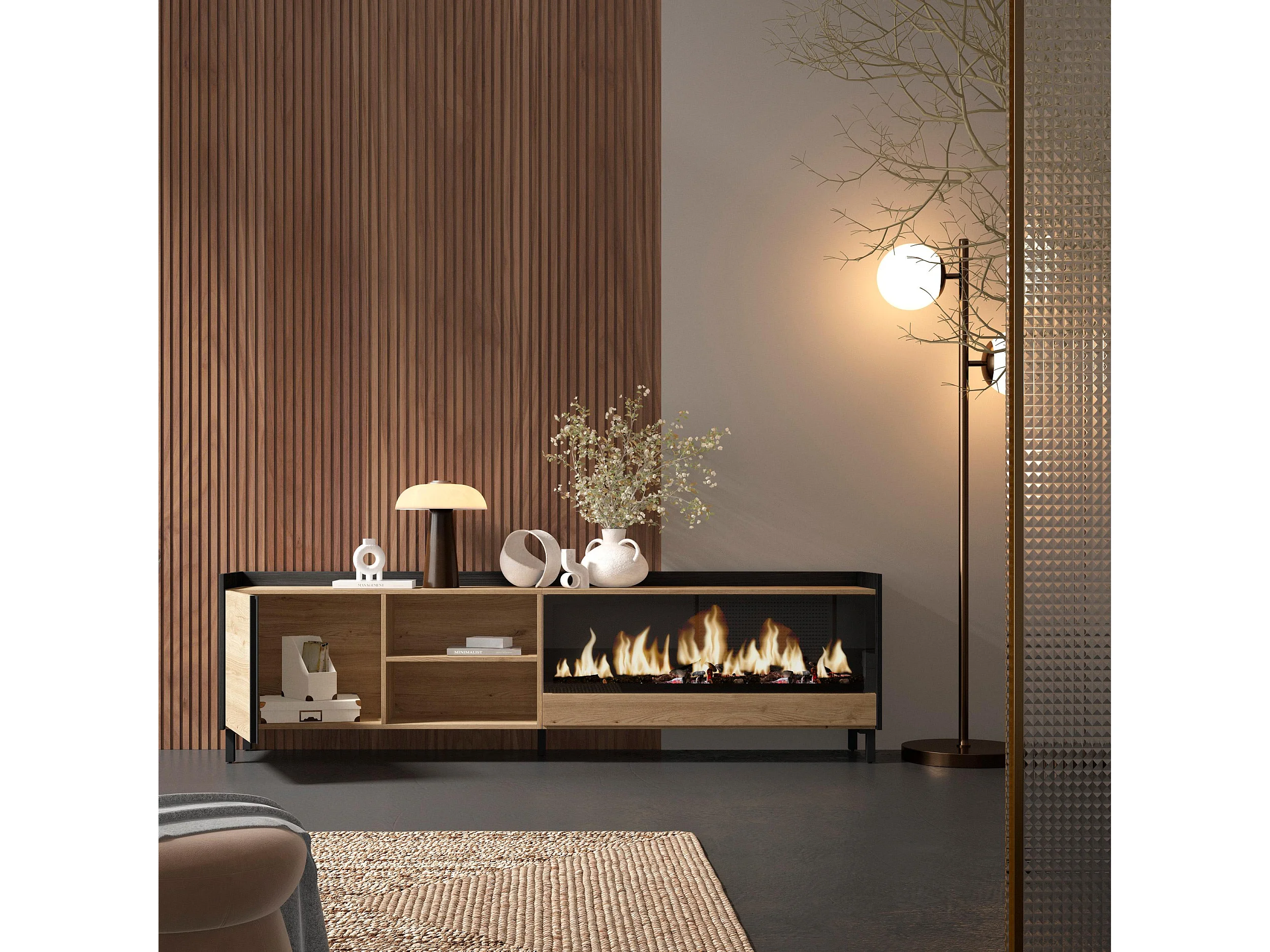 TV-Schrank, Lowboard, 212x61x35 cm, Für TV-Geräte bis zu 80", Elektrokamin XXL, Industriedesign, Eiche Schwarz