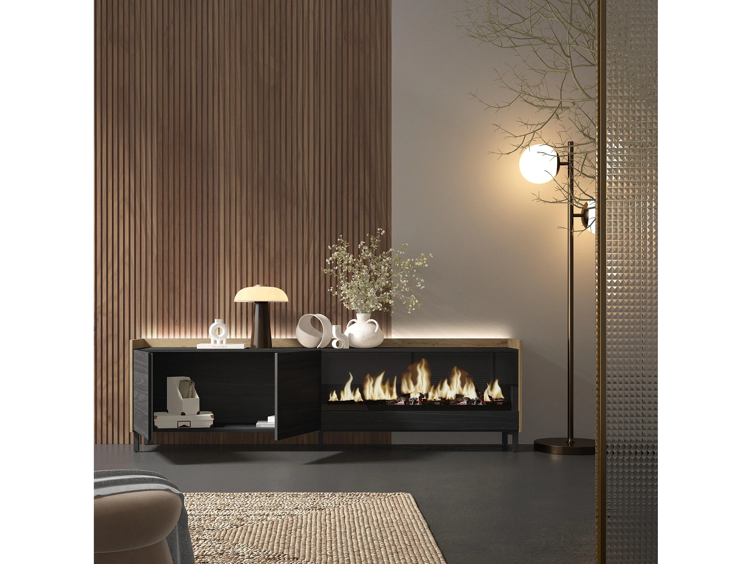 TV-Schrank, Lowboard, 212x61x35 cm, Für TV-Geräte bis zu 80", Elektrokamin XXL, Industriedesign, LED, Schwarz Eiche