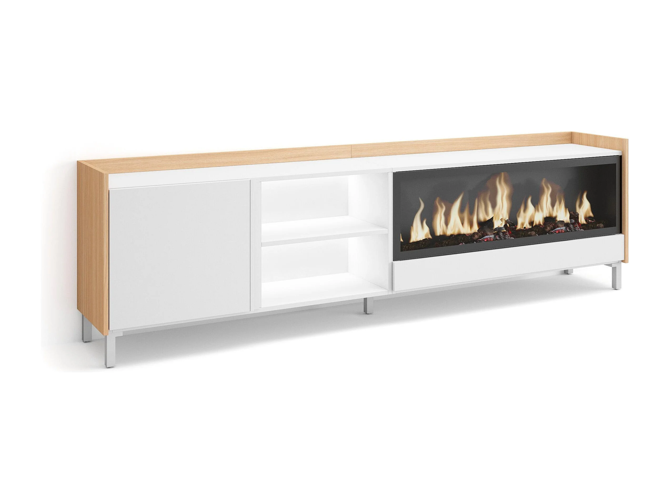 TV-Schrank, Lowboard, 212x61x35 cm, Für TV-Geräte bis zu 80", Elektrokamin XXL, Industriedesign, LED, Weiß und Eiche Soft