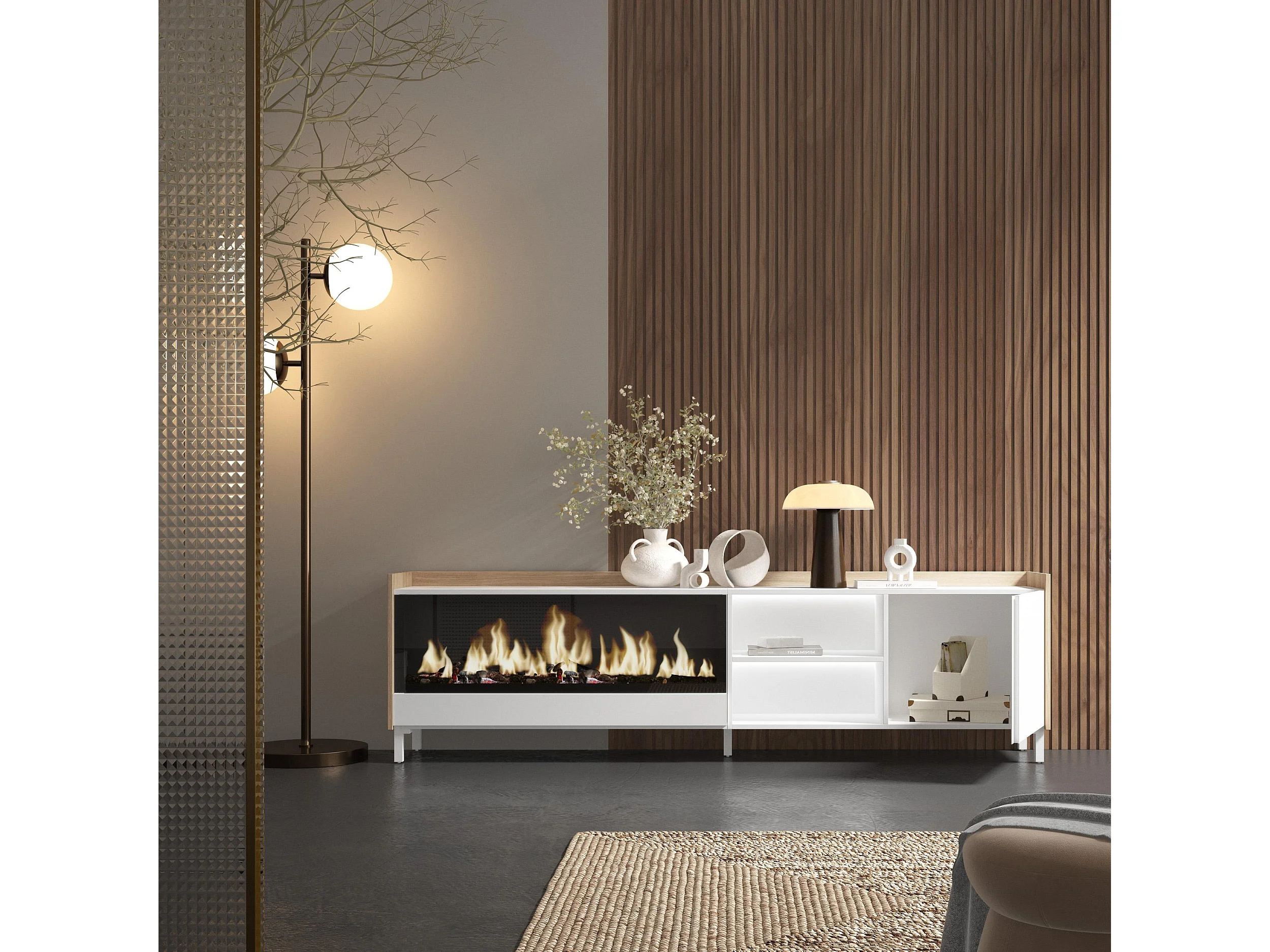 TV-Schrank, Lowboard, 212x61x35 cm, Für TV-Geräte bis zu 80", Elektrokamin XXL, Industriedesign, LED, Weiß und Eiche Soft