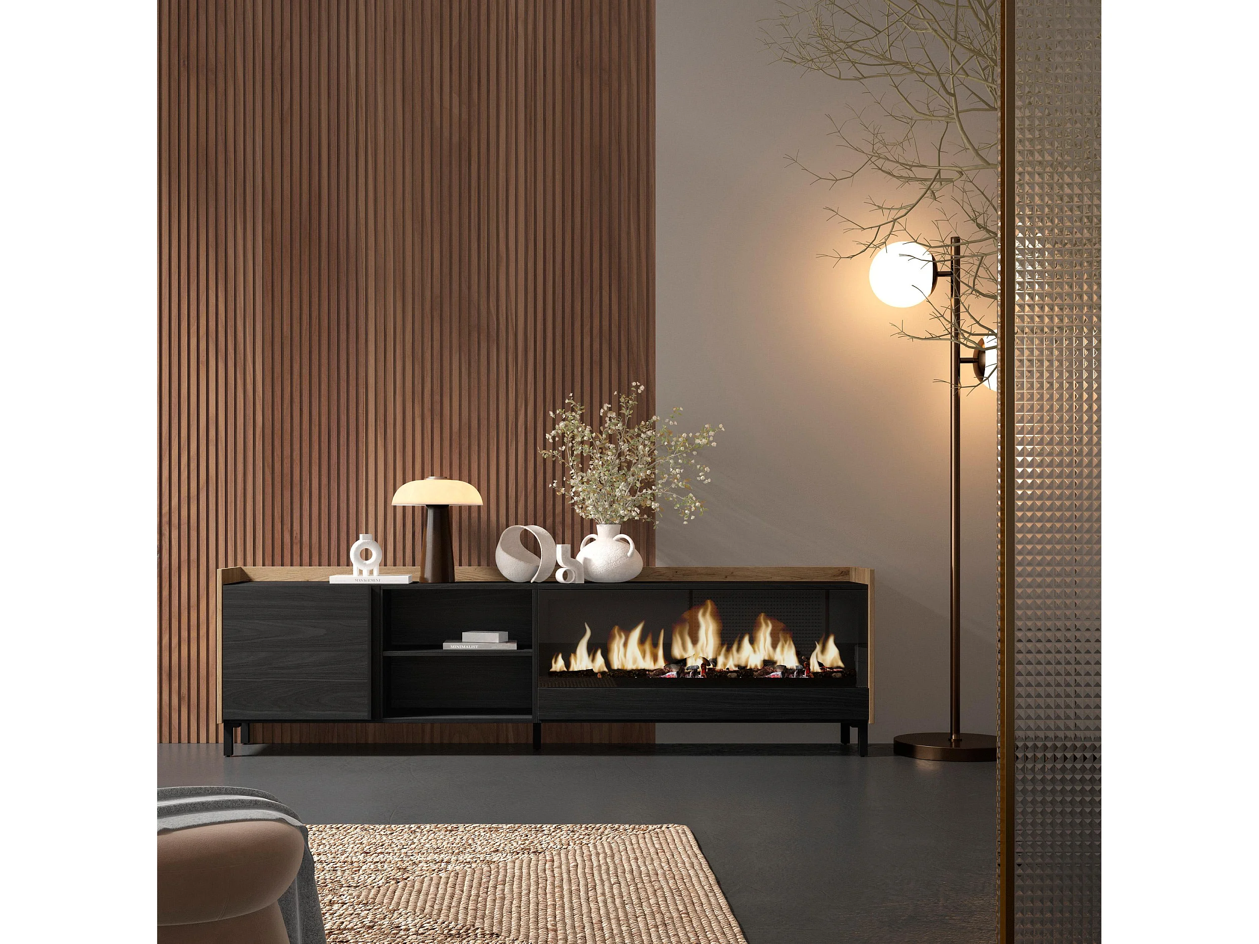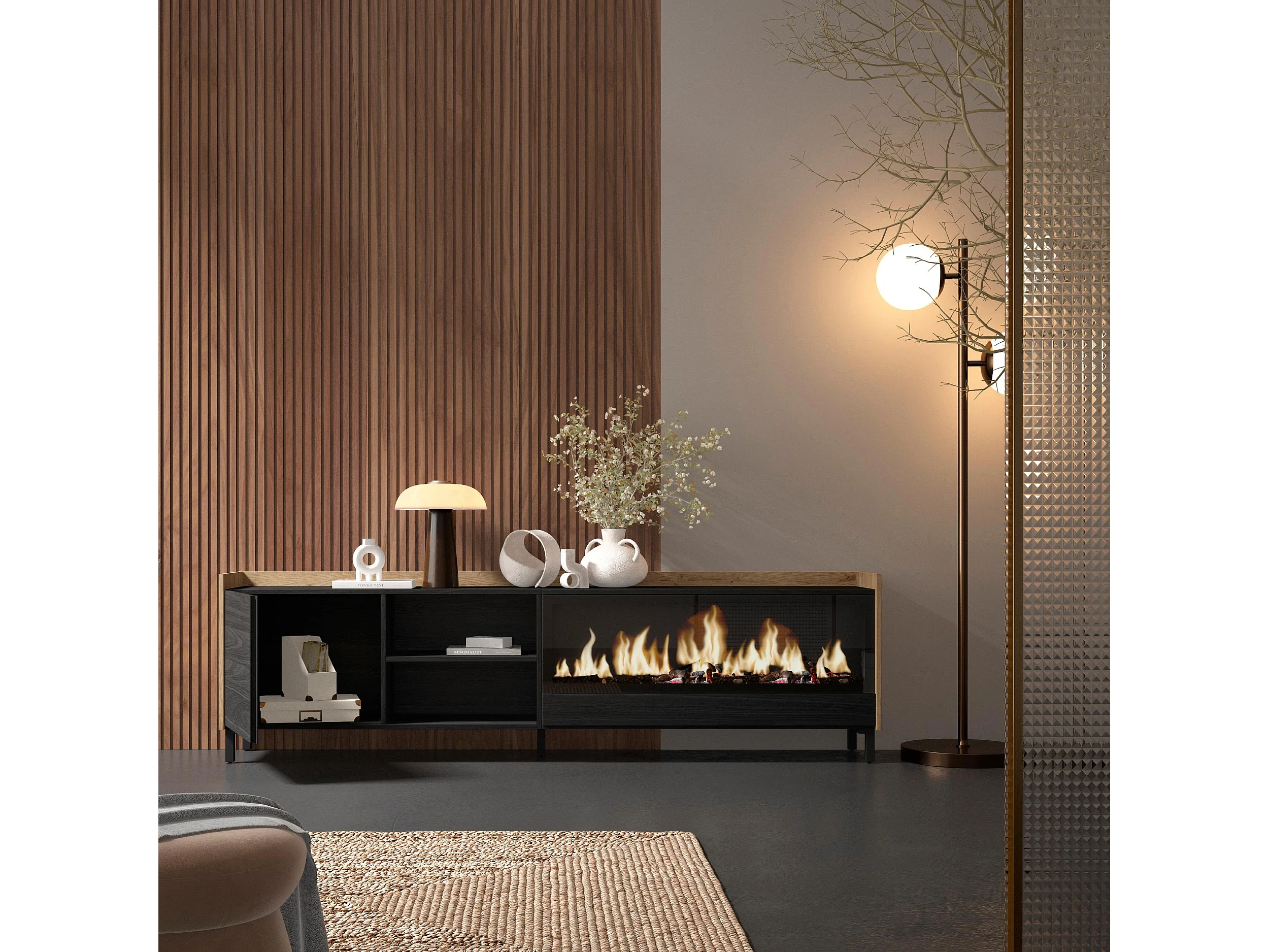 TV-Schrank, Lowboard, 212x61x35 cm, Für TV-Geräte bis zu 80", Elektrokamin XXL, Industriedesign, Schwarz Eiche