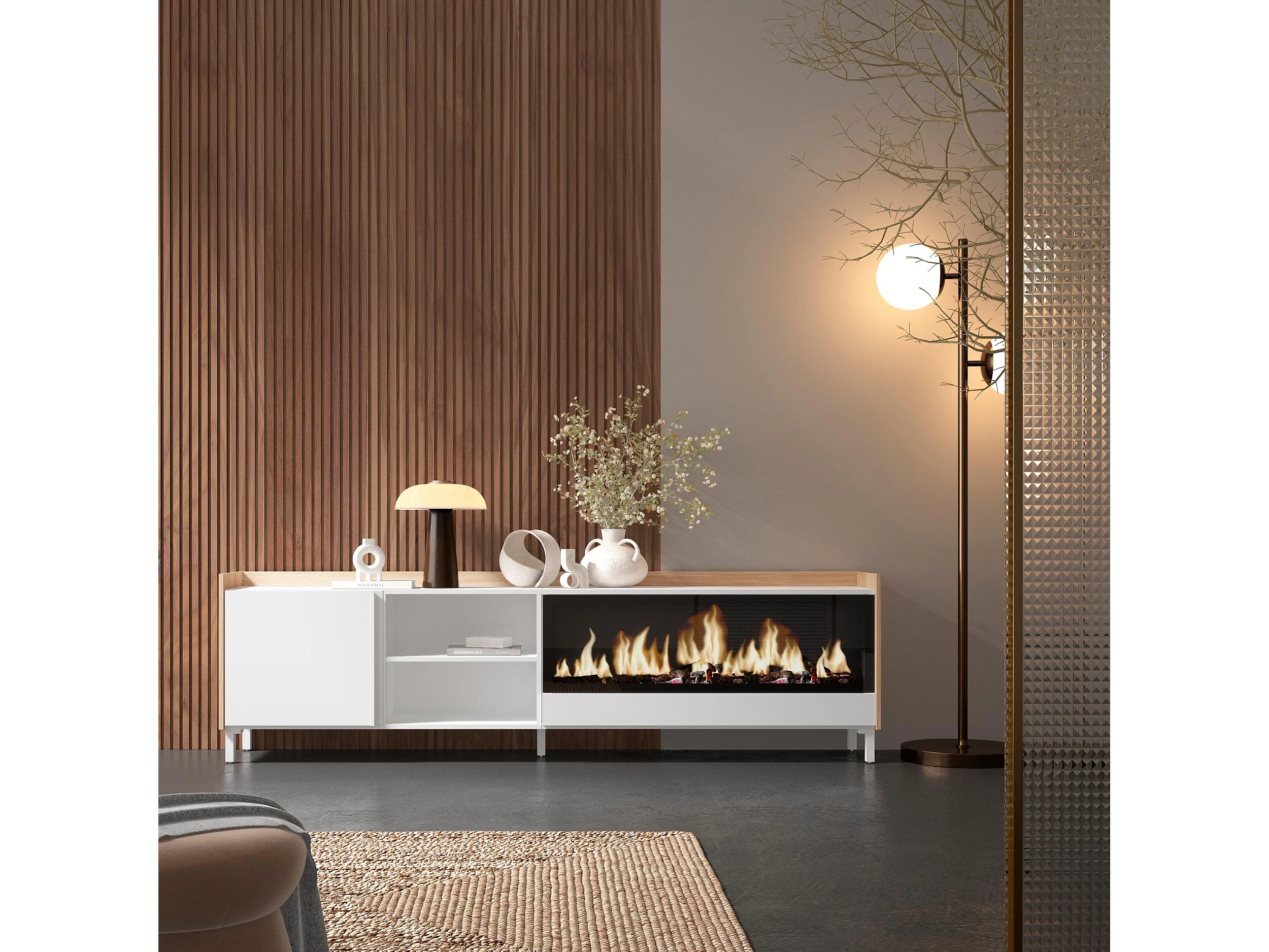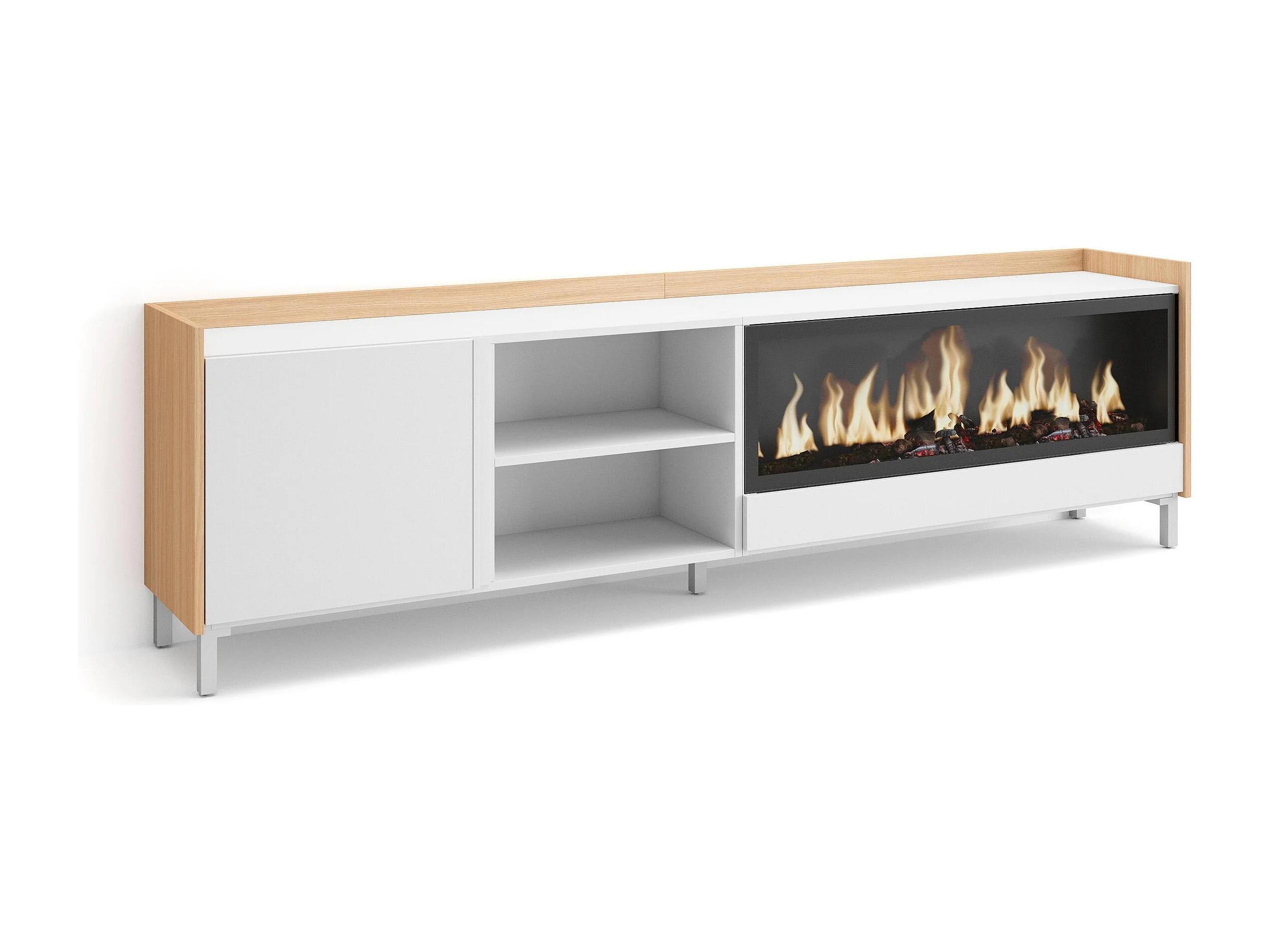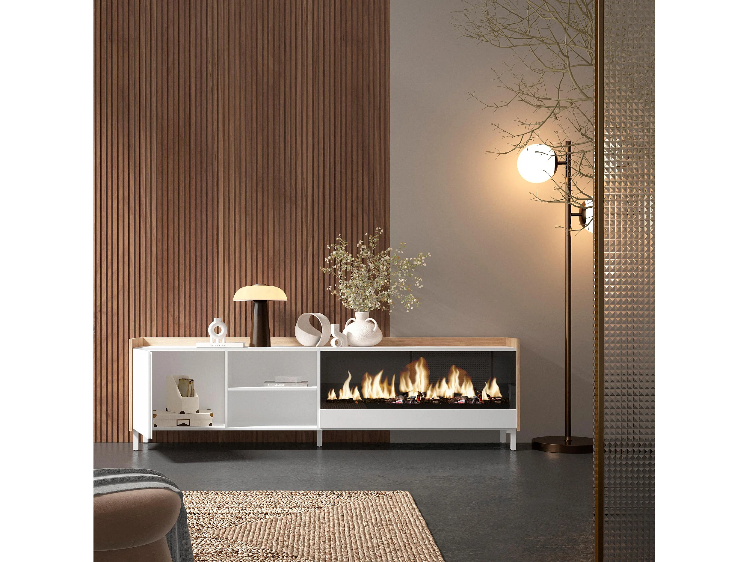 TV-Schrank, Lowboard, 212x61x35 cm, Für TV-Geräte bis zu 80", Elektrokamin XXL, Industriedesign, Weiß und Eiche Soft