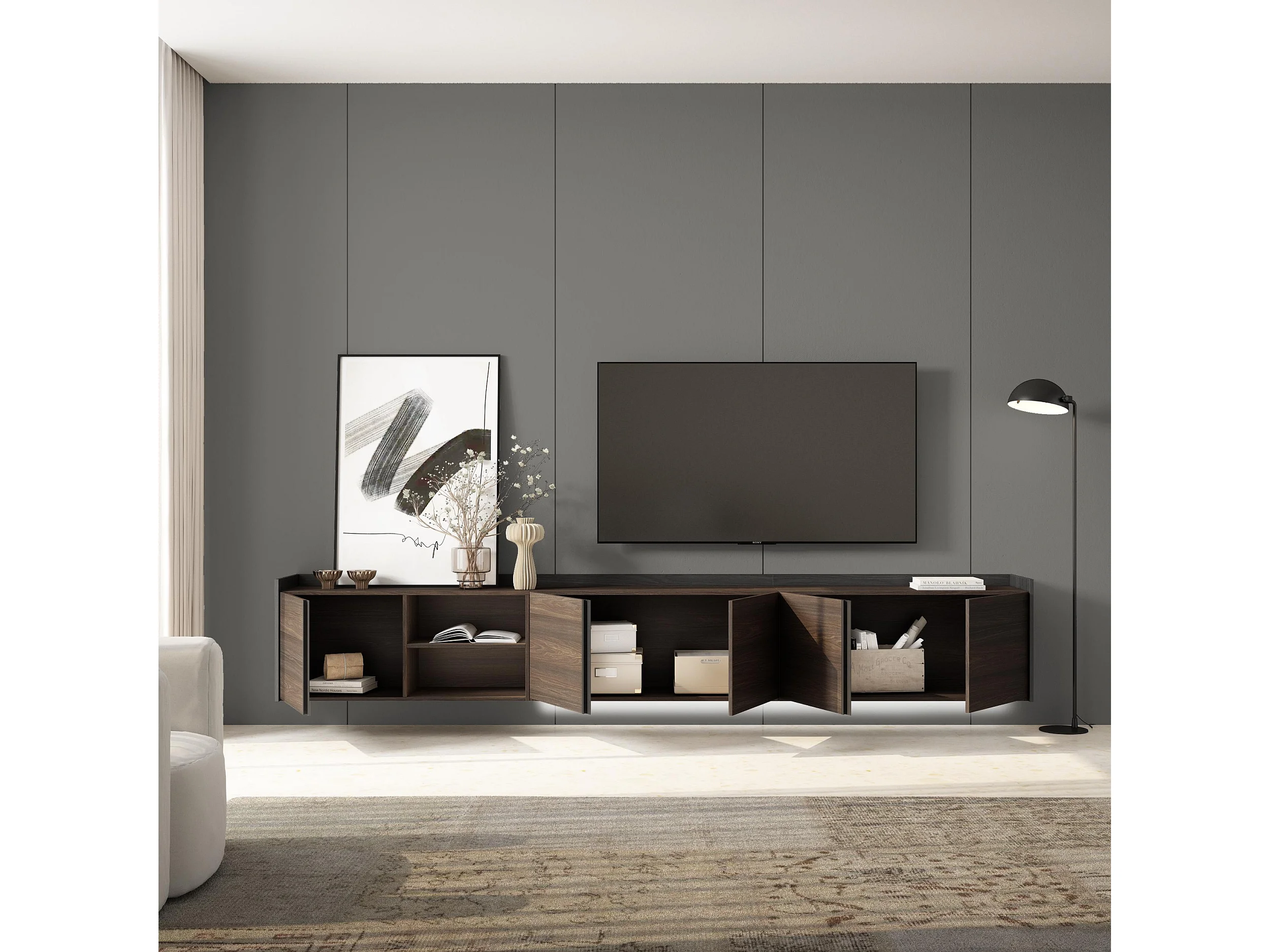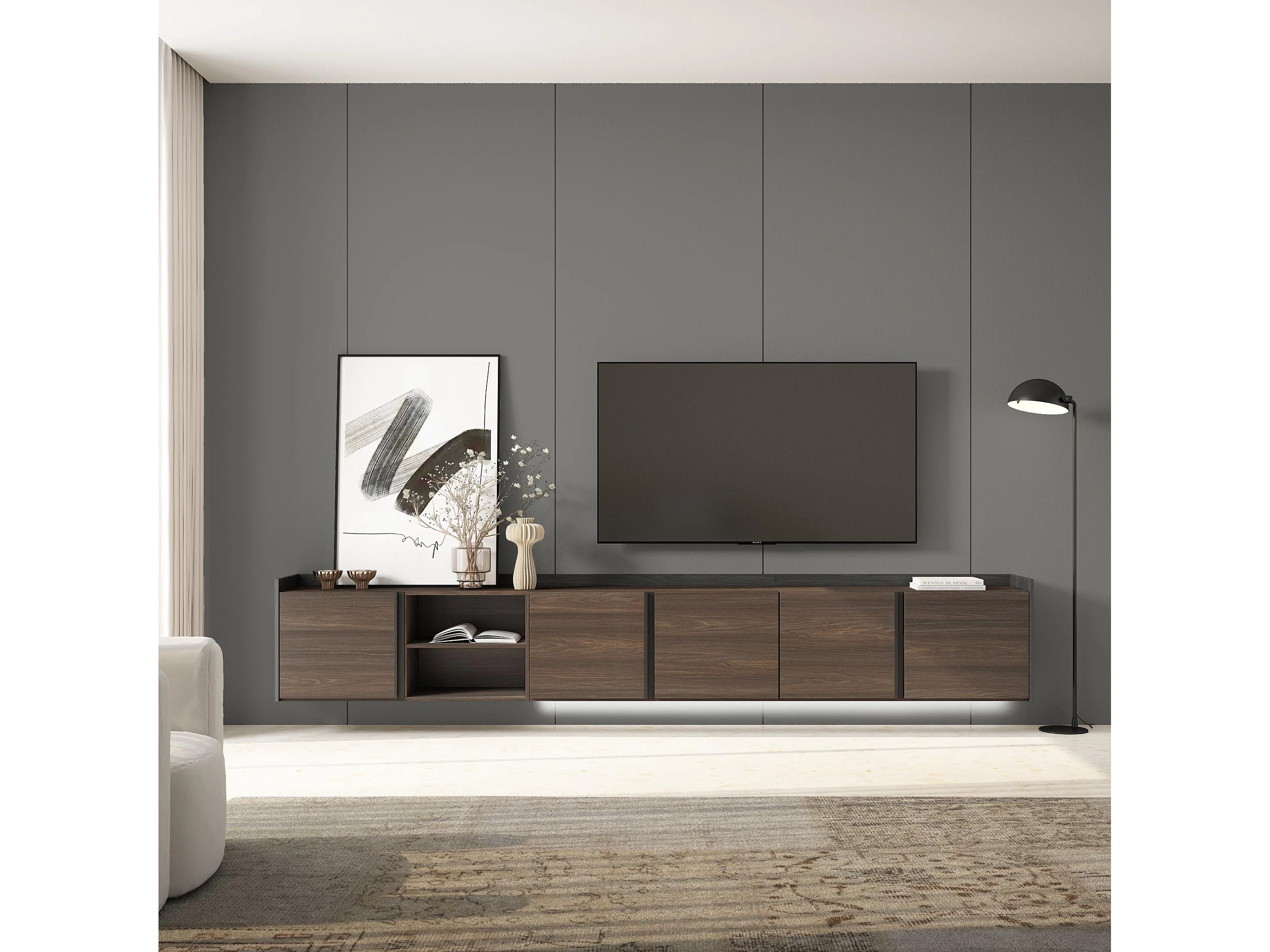 TV-Schrank, Lowboard, 309x50x35 cm, Für TV-Geräte bis zu 80", Hängend, LED, Dunkler Eiche und Schwarz