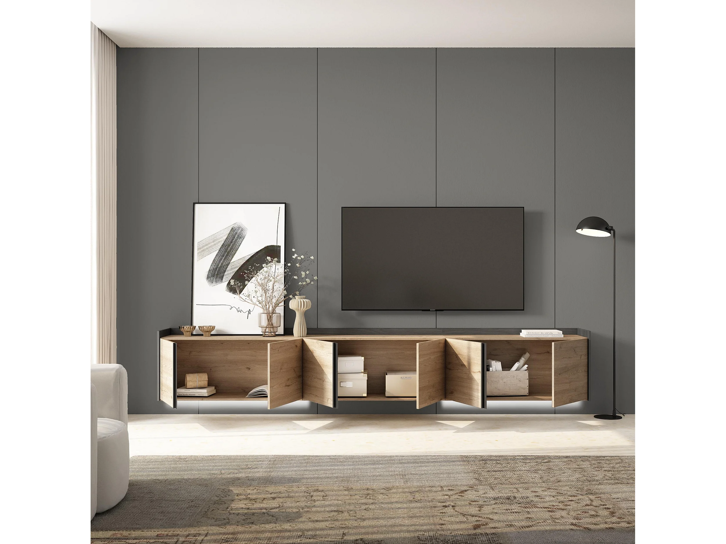 TV-Schrank, Lowboard, 309x50x35 cm, Für TV-Geräte bis zu 80", Hängend, LED, Eiche Schwarz