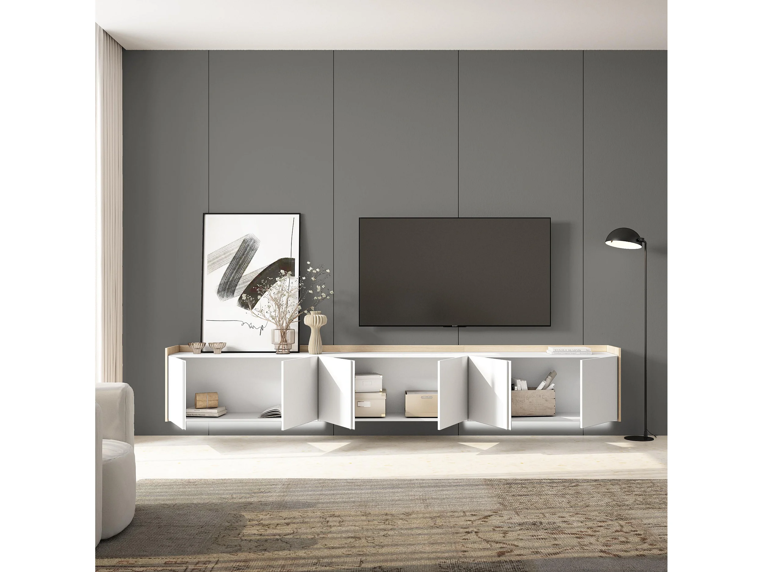 TV-Schrank, Lowboard, 309x50x35 cm, Für TV-Geräte bis zu 80", Hängend, LED, Weiß und Eiche Soft