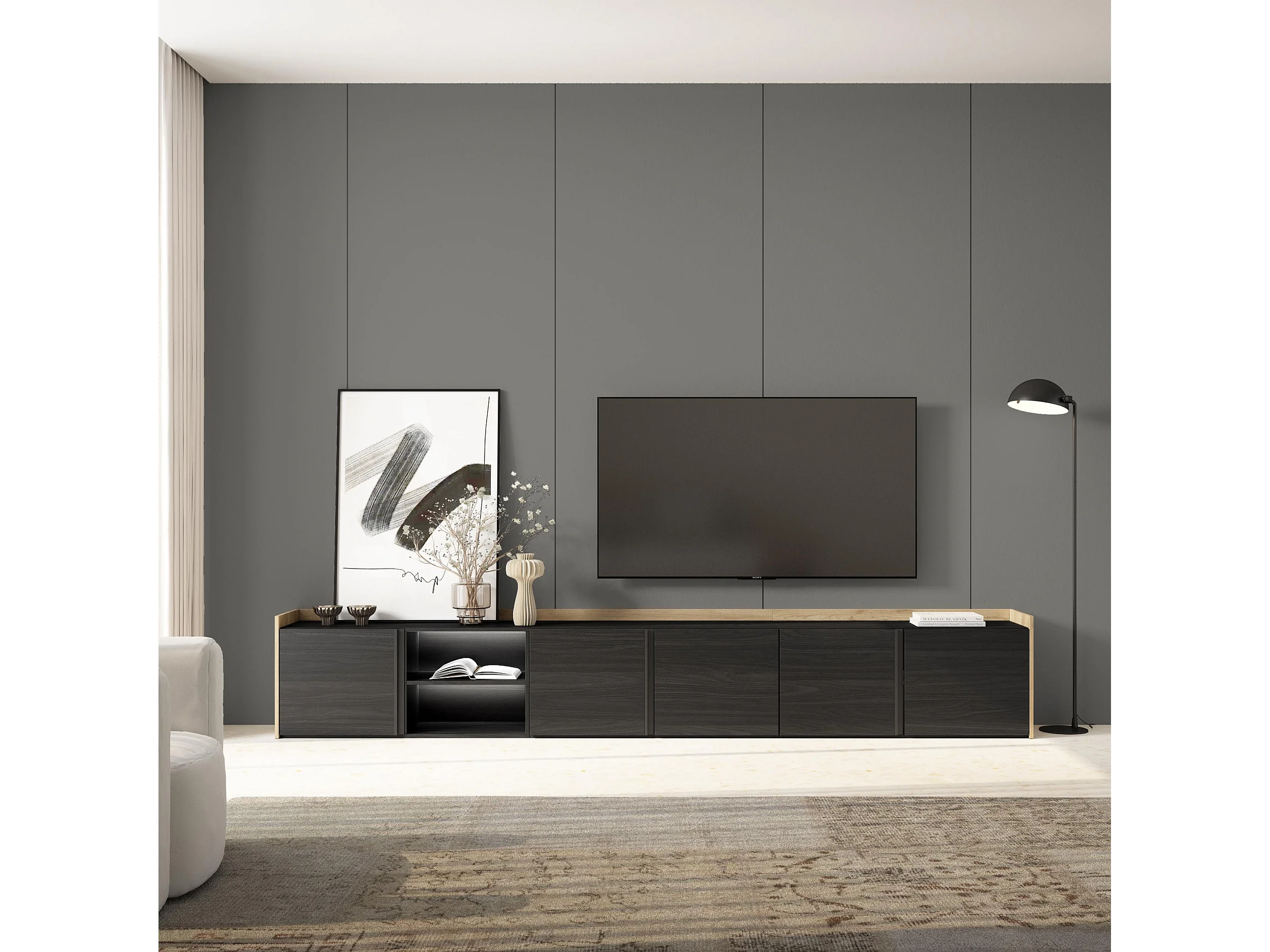 TV-Schrank, Lowboard, 309x50x35 cm, Für TV-Geräte bis zu 80", LED, Schwarz Eiche