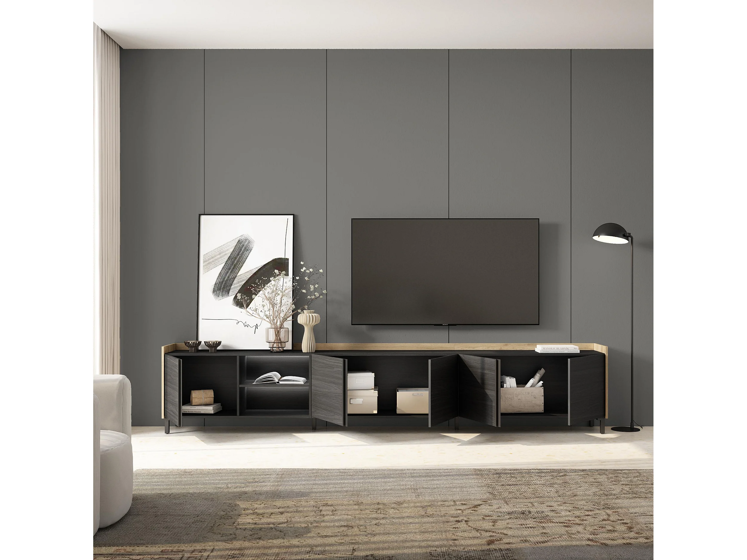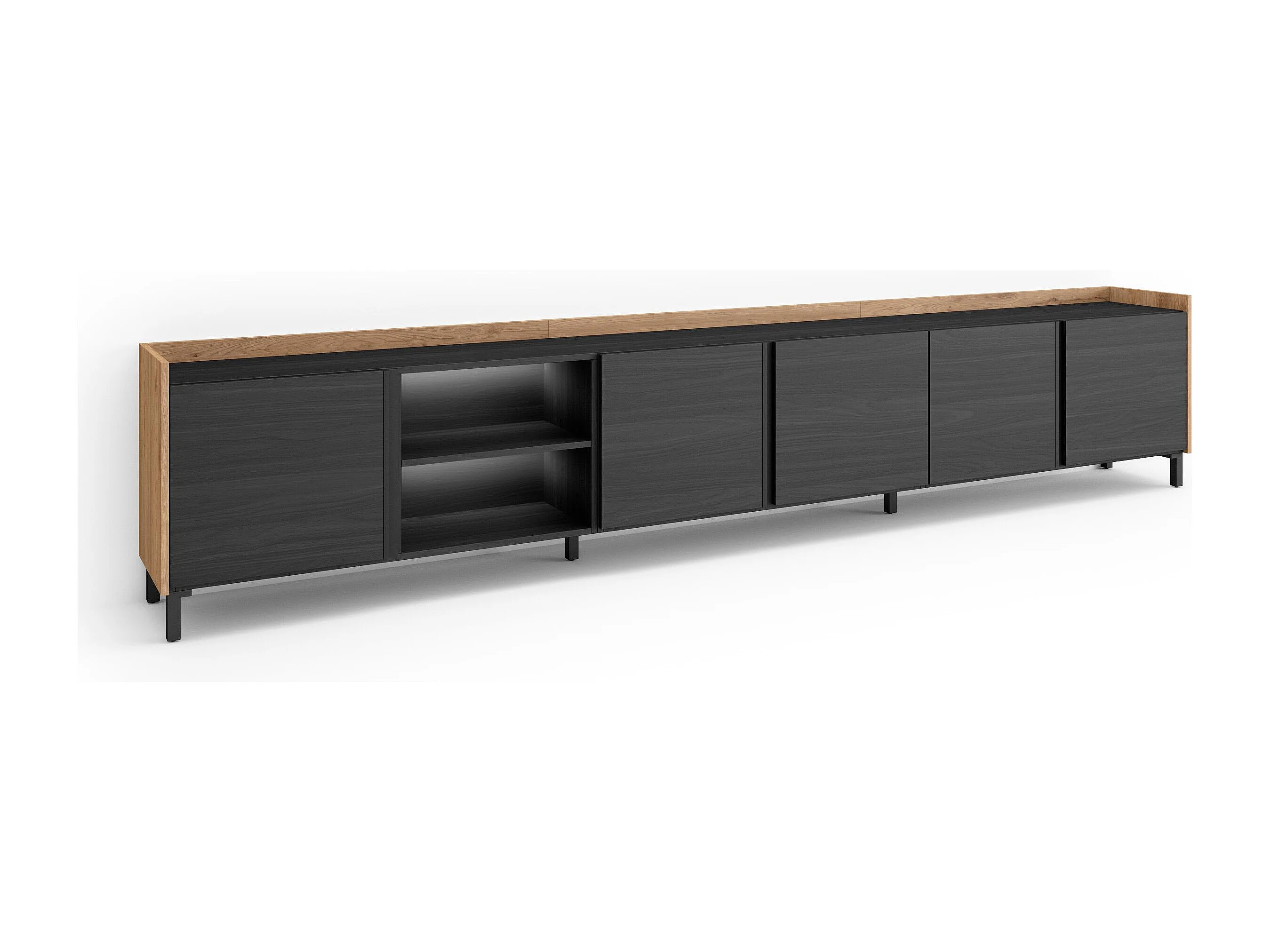 TV-Schrank, Lowboard, 309x61x35 cm, Für TV-Geräte bis zu 80", Industriedesign, LED, Schwarz Eiche