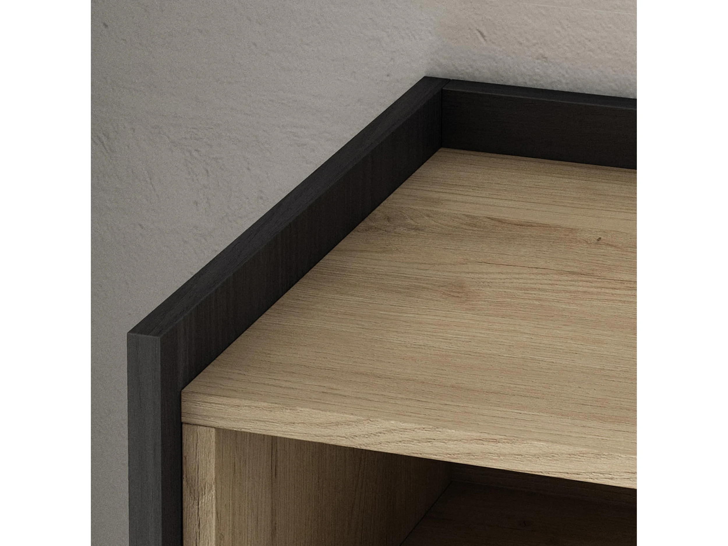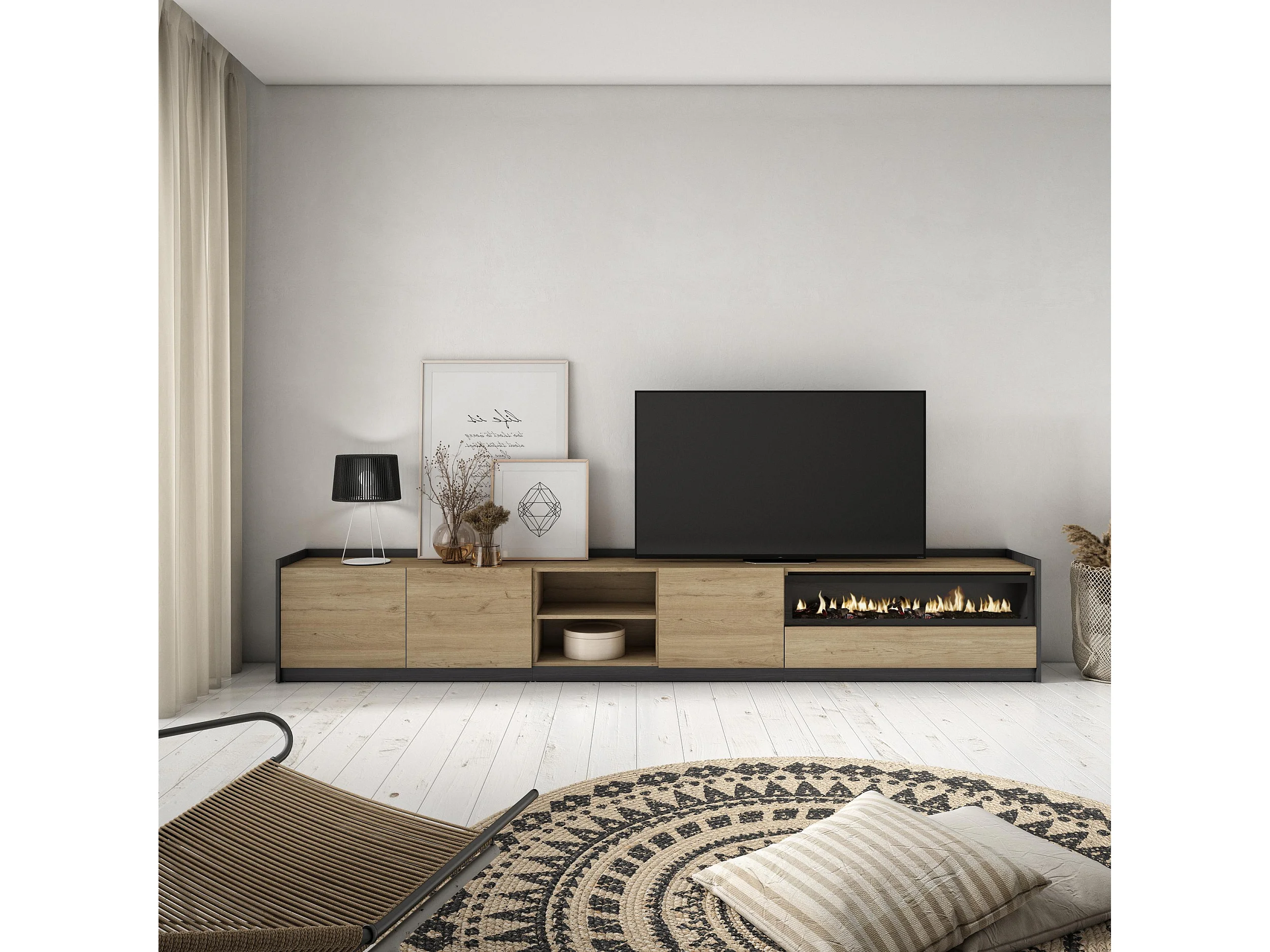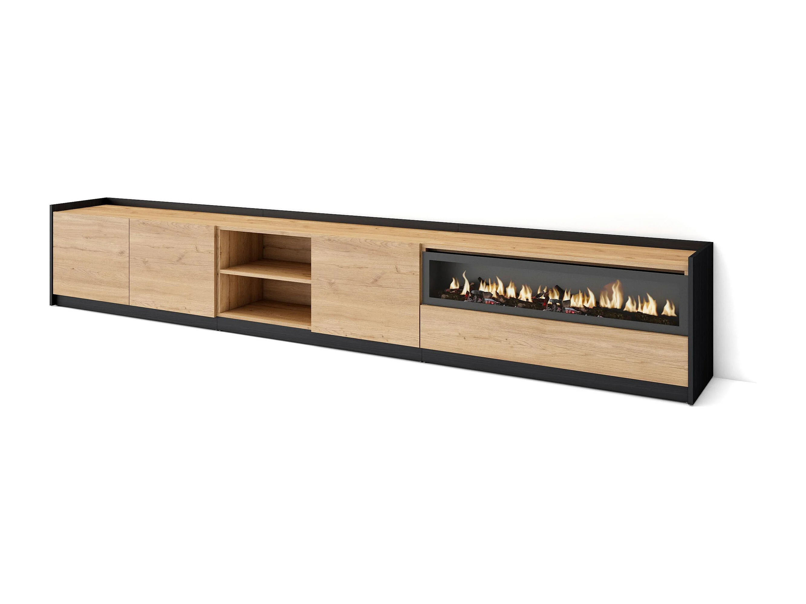 TV-Schrank, Lowboard, 310x50x37 cm, Für TV-Geräte bis zu 80", Elektrokamin., Eiche Schwarz