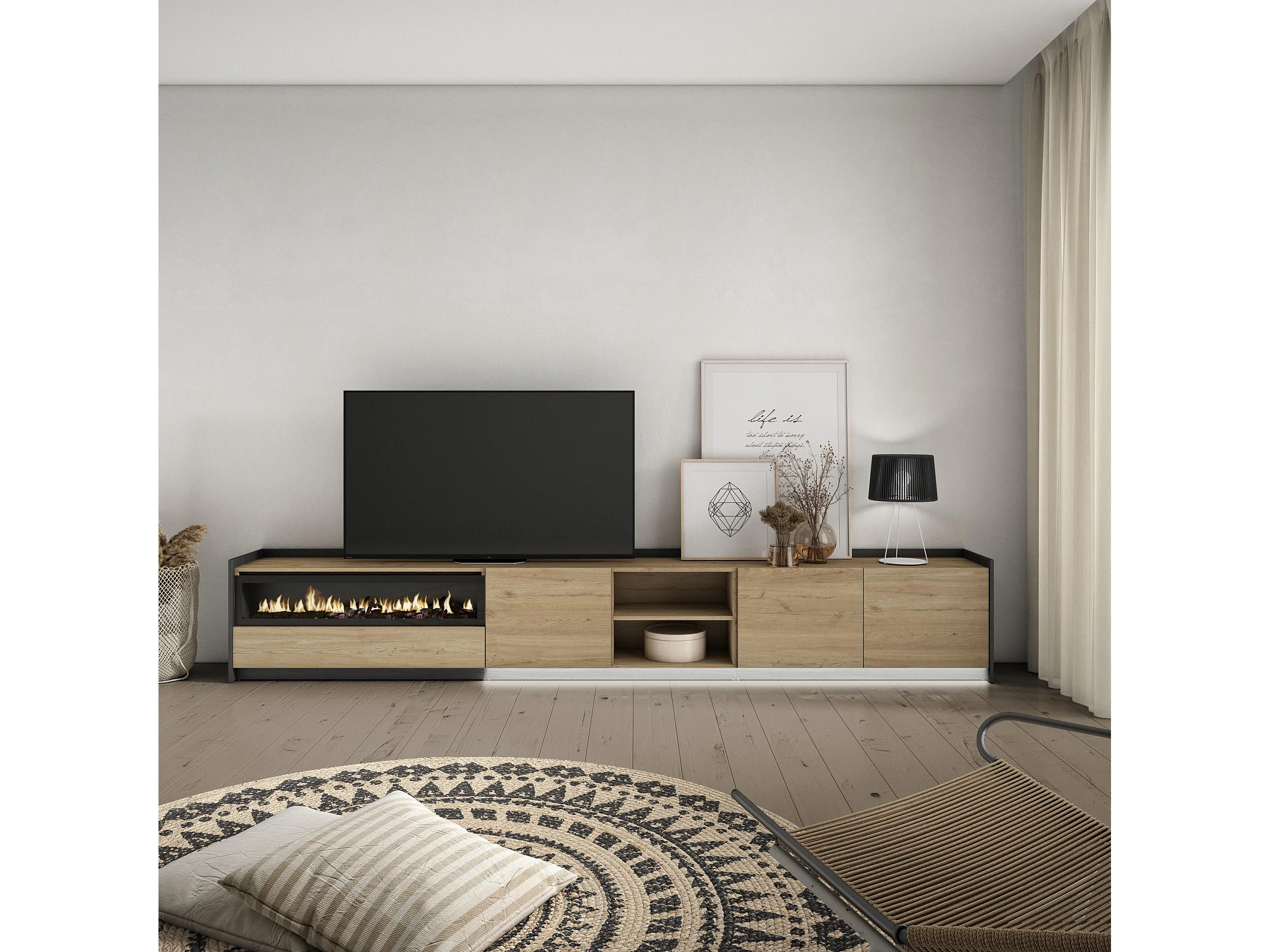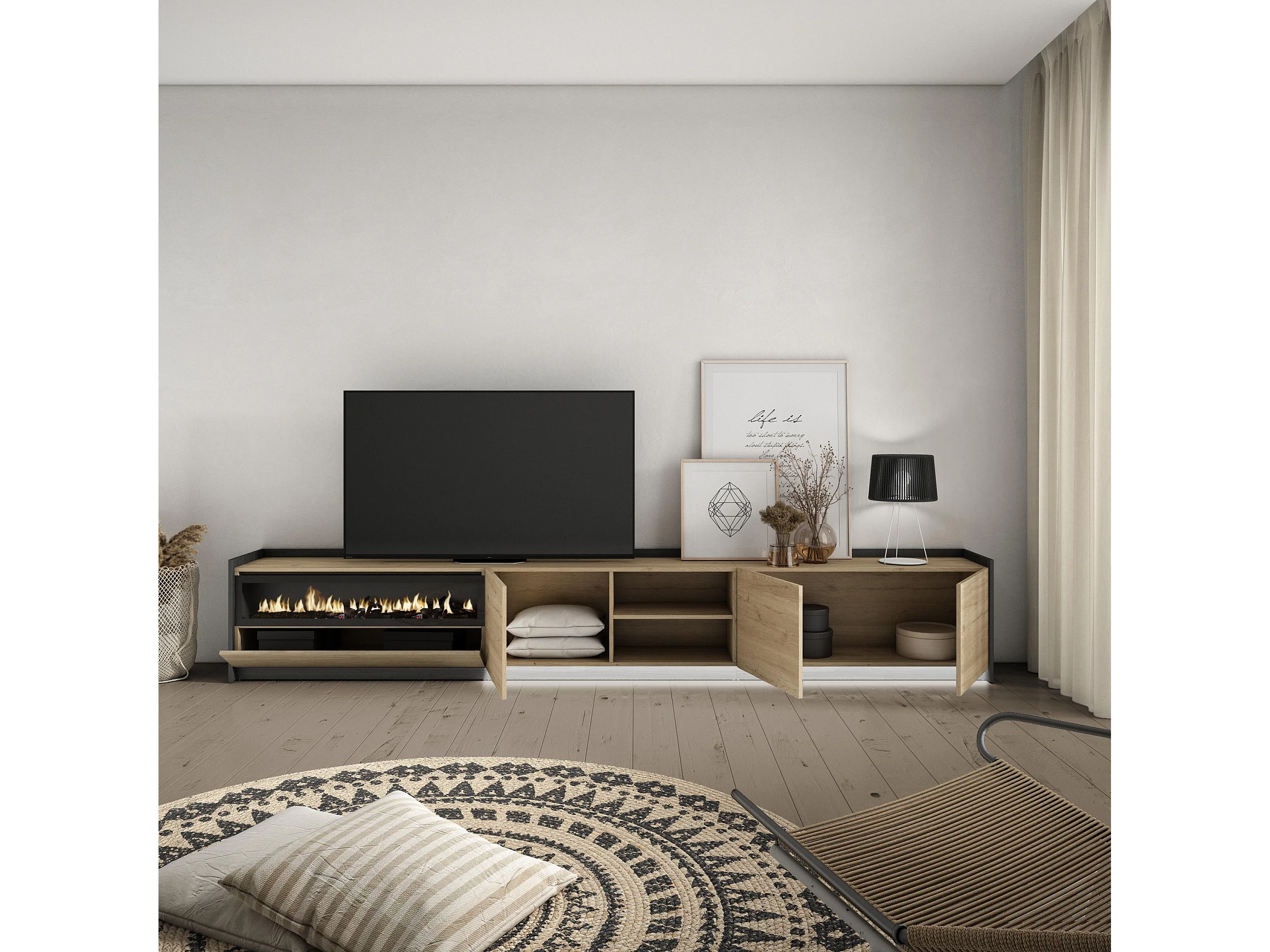 TV-Schrank, Lowboard, 310x50x37 cm, Für TV-Geräte bis zu 80", Elektrokamin., LED, Eiche Schwarz