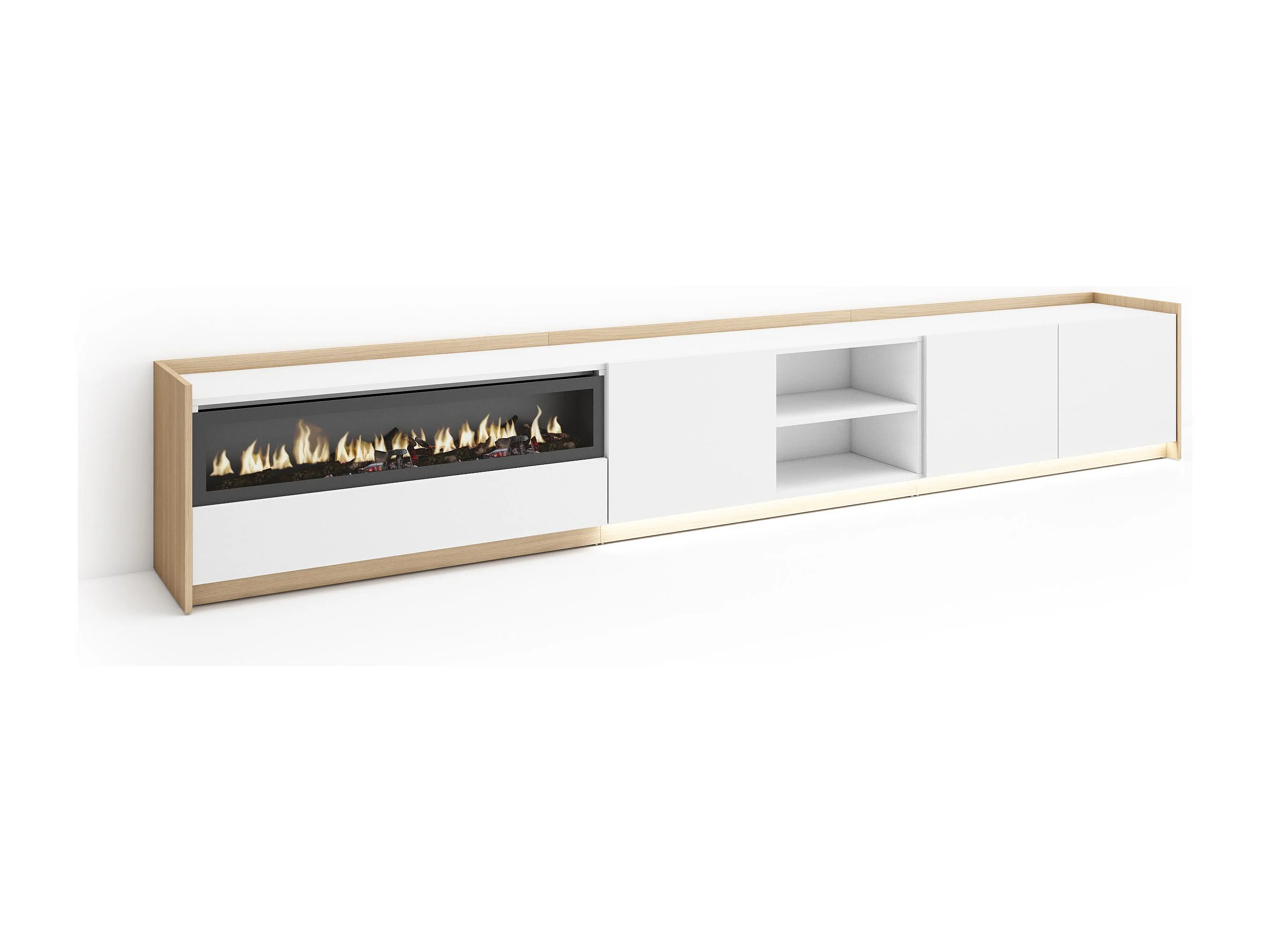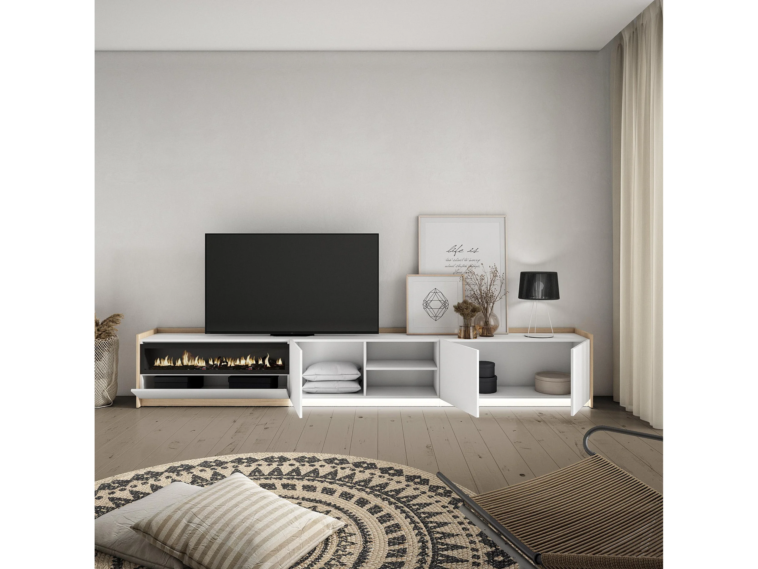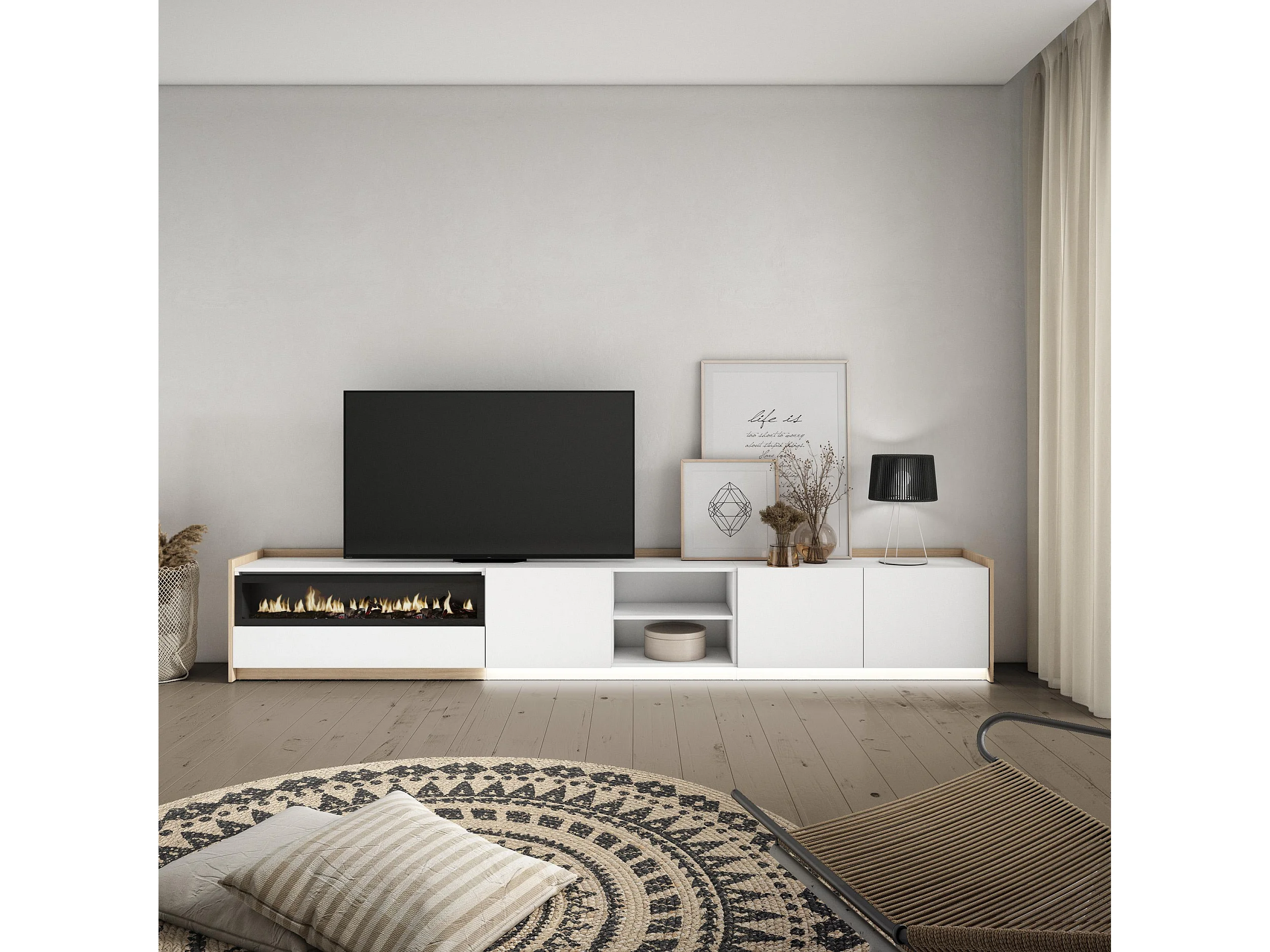 TV-Schrank, Lowboard, 310x50x37 cm, Für TV-Geräte bis zu 80", Elektrokamin., LED, Weiß und Eiche Soft