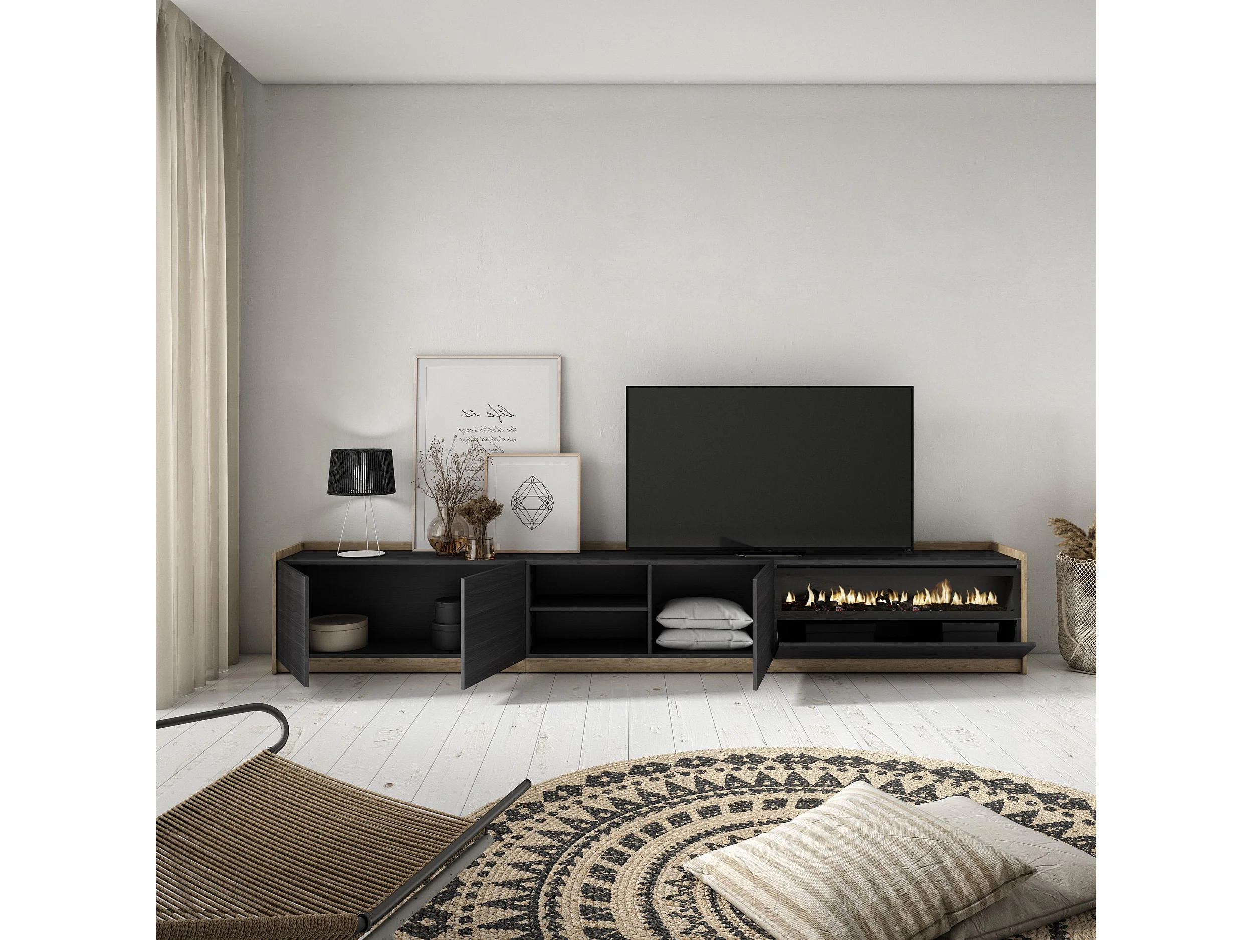 TV-Schrank, Lowboard, 310x50x37 cm, Für TV-Geräte bis zu 80", Elektrokamin., Schwarz Eiche