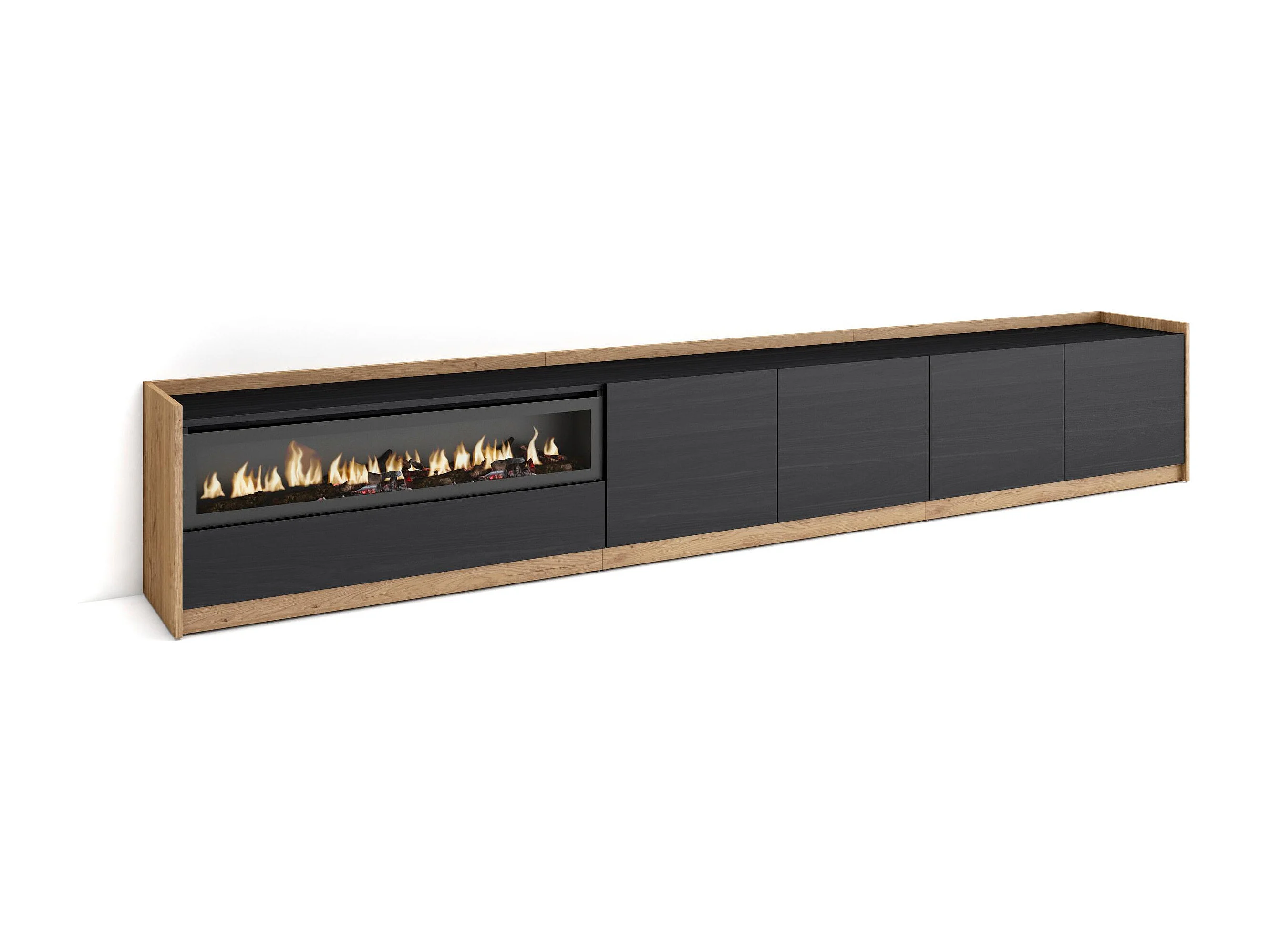 TV-Schrank, Lowboard, 310x50x37 cm, Für TV-Geräte bis zu 80", Elektrokamin., Schwarz Eiche