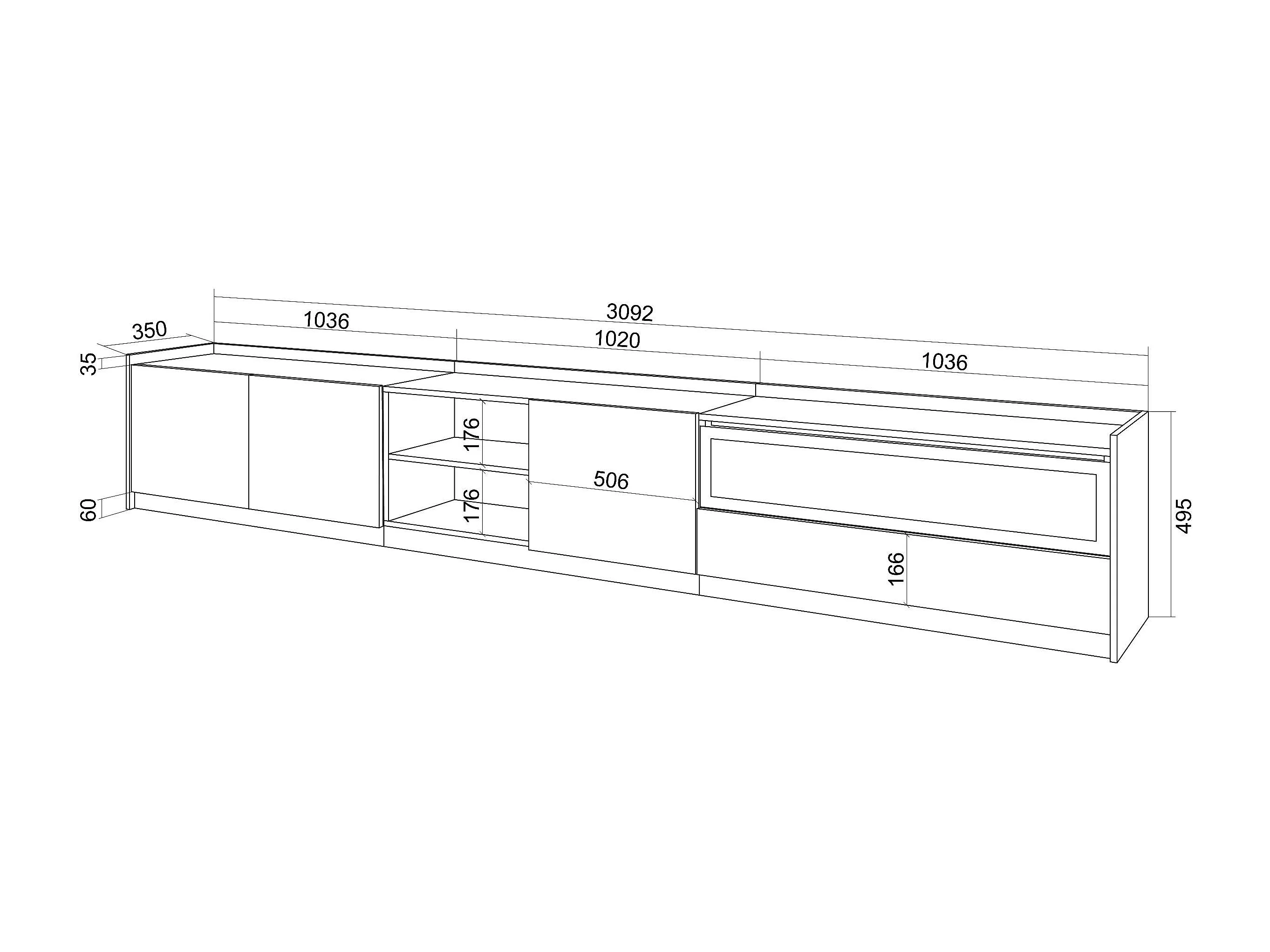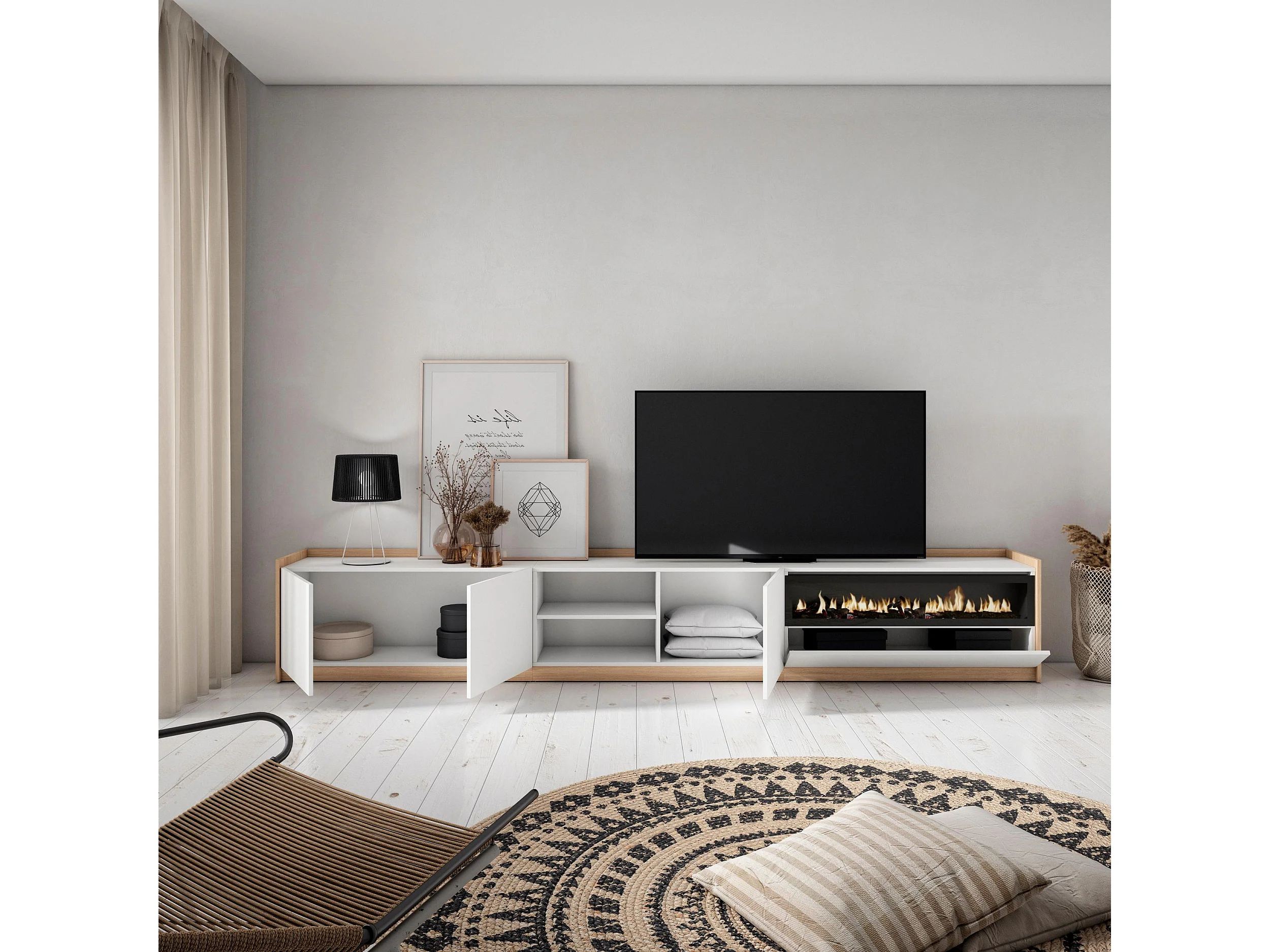 TV-Schrank, Lowboard, 310x50x37 cm, Für TV-Geräte bis zu 80", Elektrokamin., Weiß und Eiche Soft