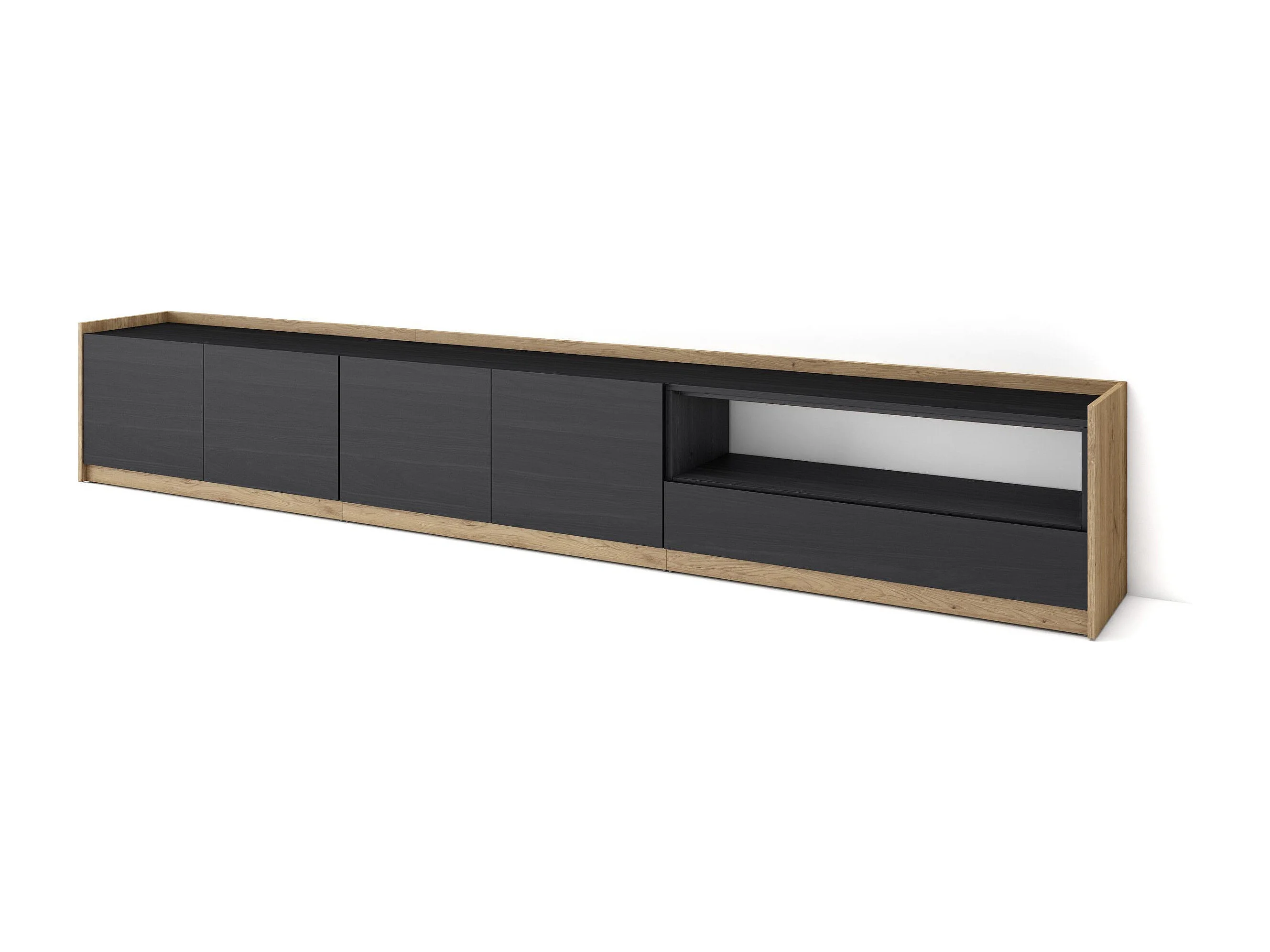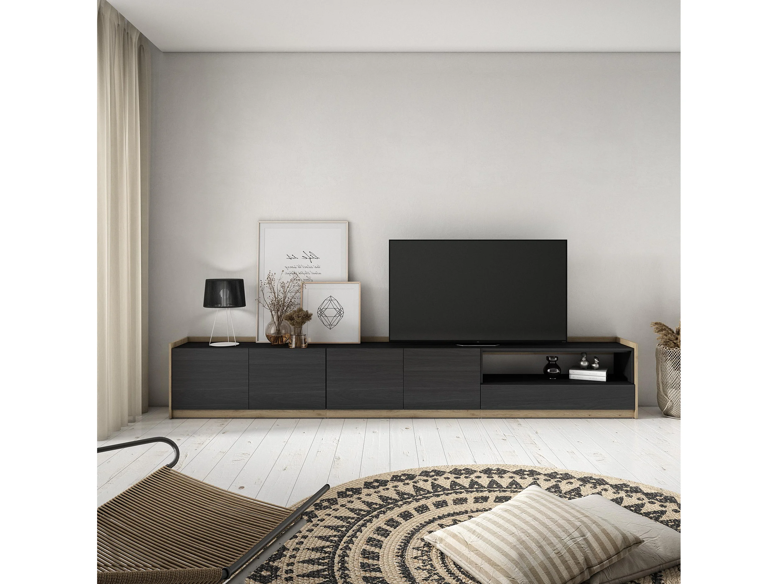 TV-Schrank, Lowboard, 310x50x37 cm, Für TV-Geräte bis zu 80", Fernsehtisch, Schwarz Eiche