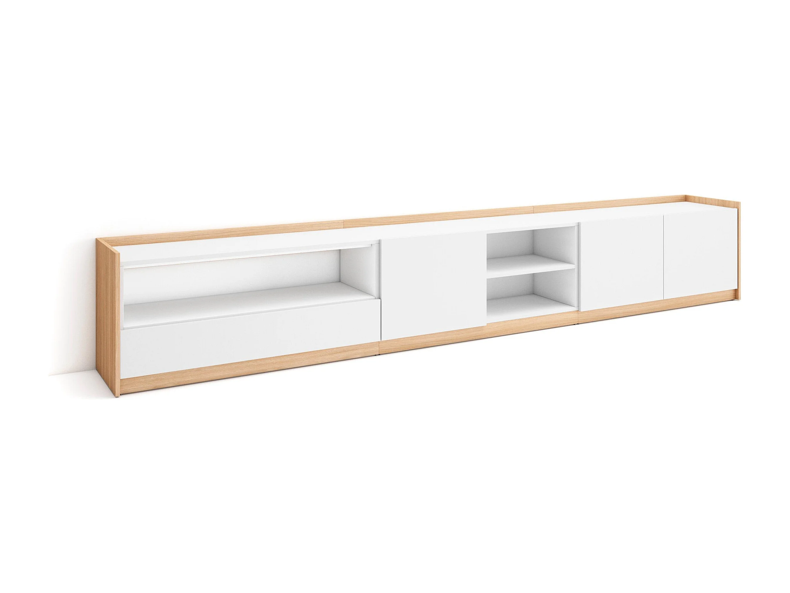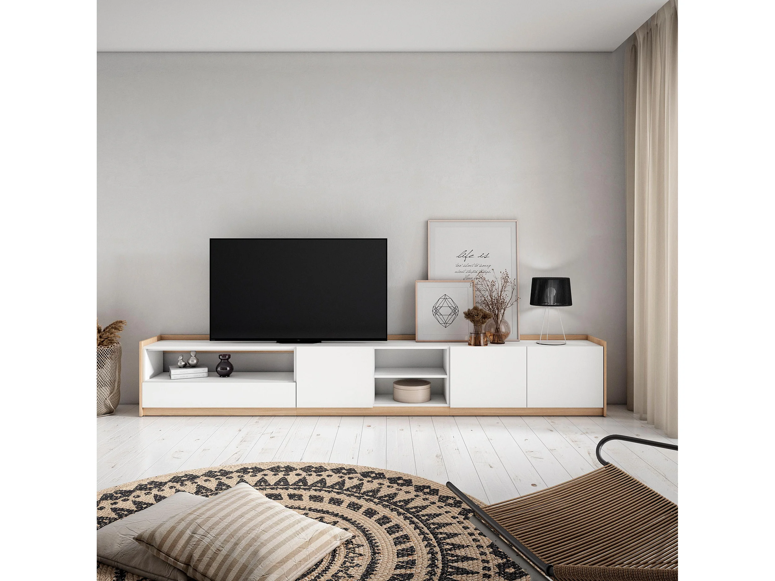 TV-Schrank, Lowboard, 310x50x37 cm, Für TV-Geräte bis zu 80", Fernsehtisch, Weiß und Eiche Soft