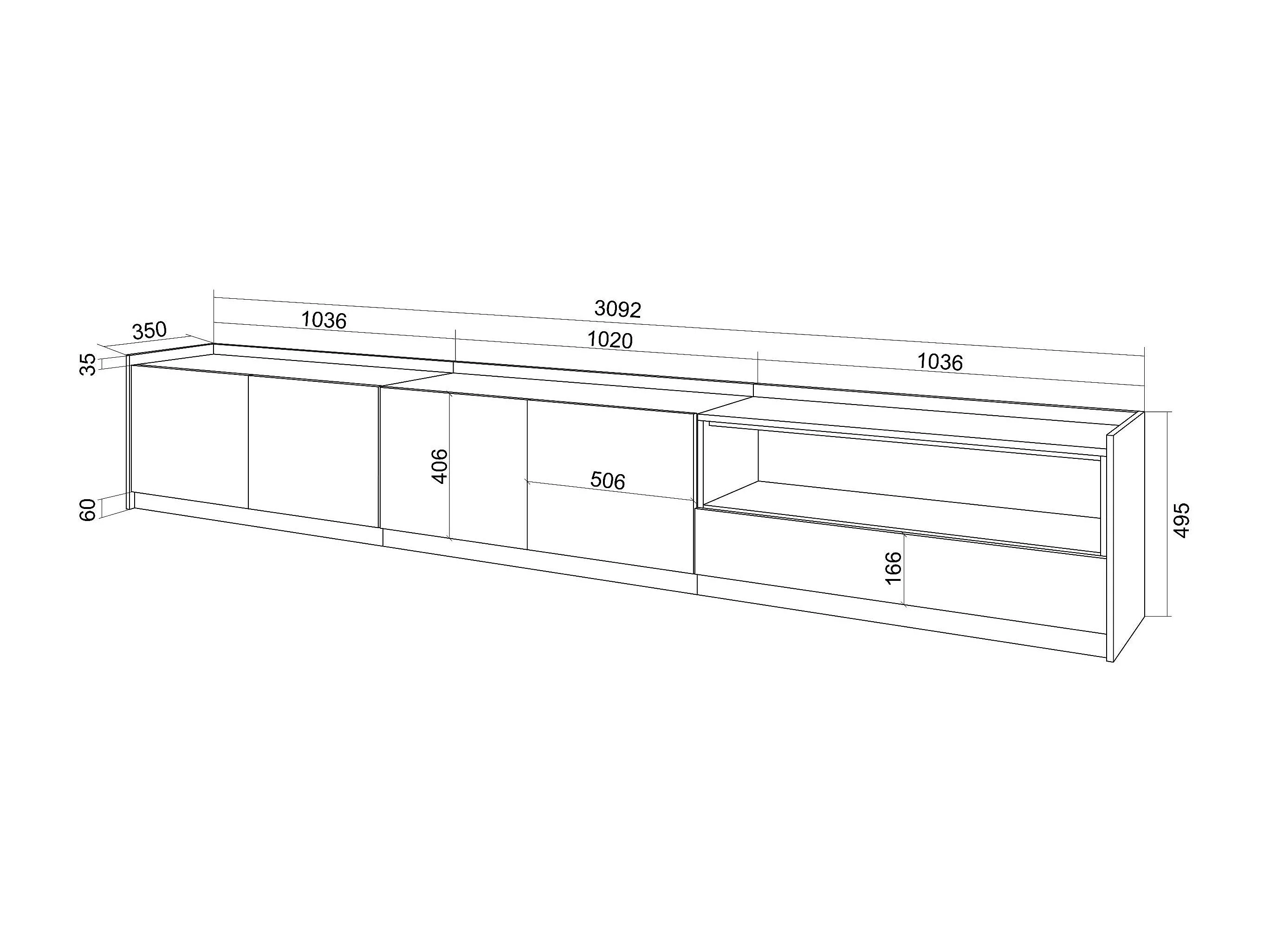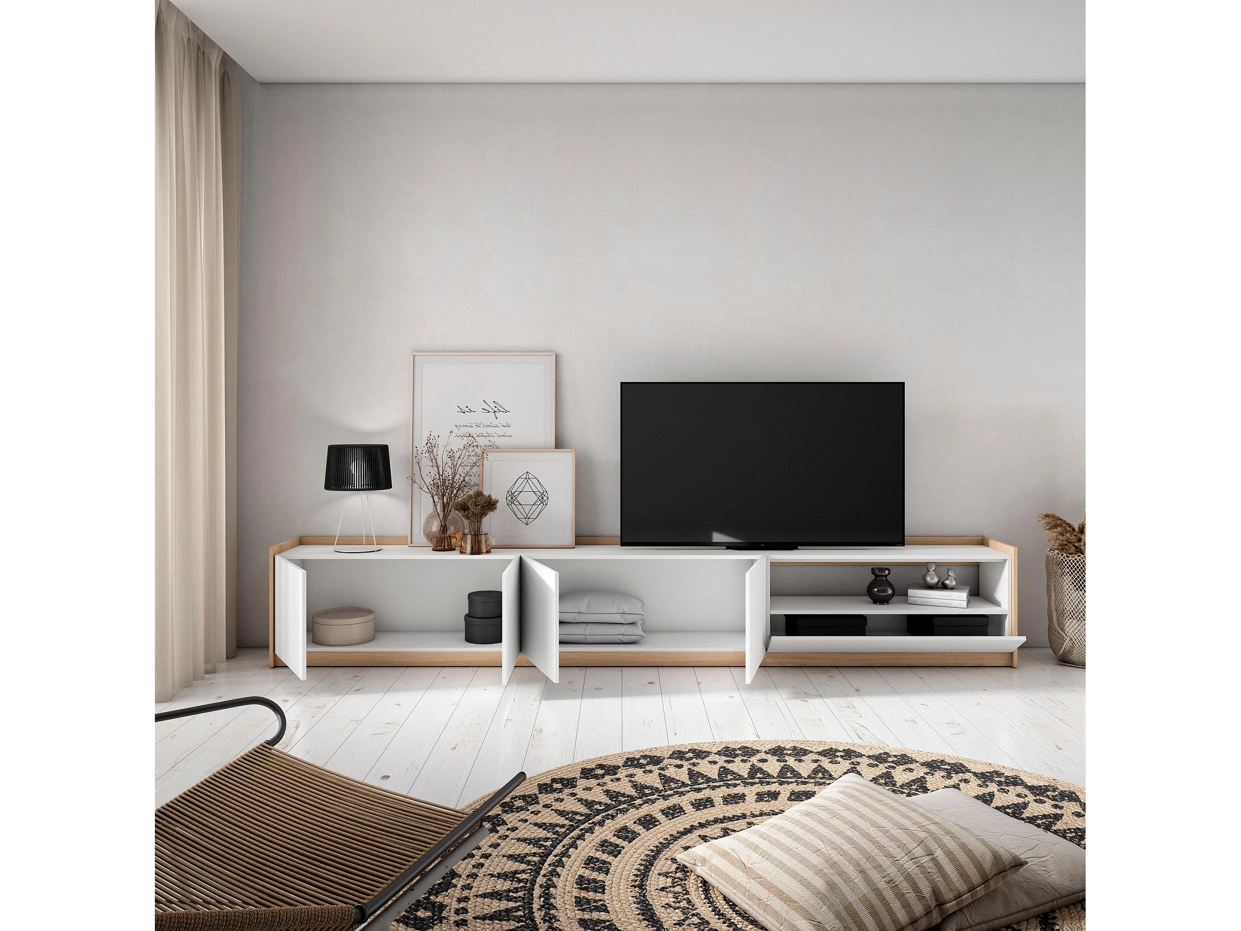 TV-Schrank, Lowboard, 310x50x37 cm, Für TV-Geräte bis zu 80", Fernsehtisch, Weiß und Eiche Soft